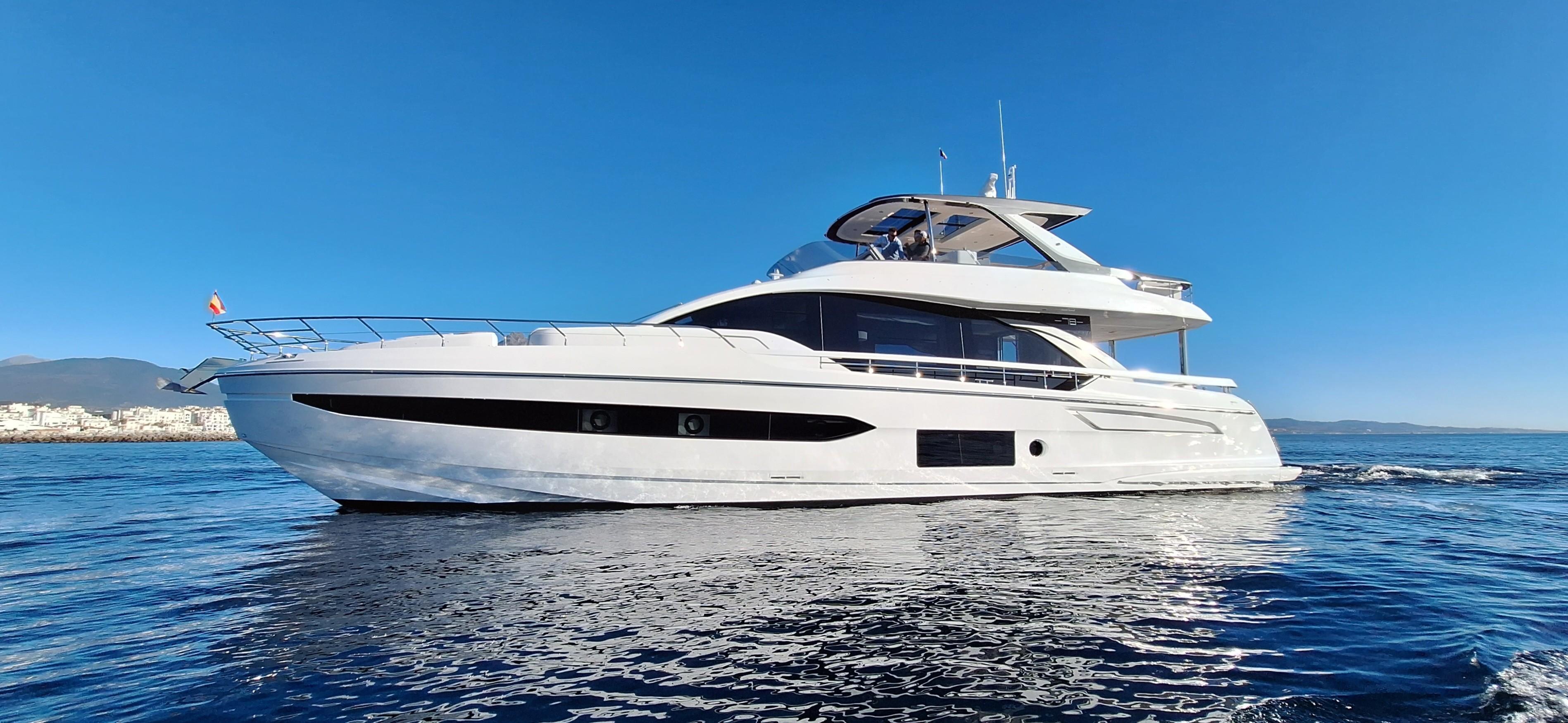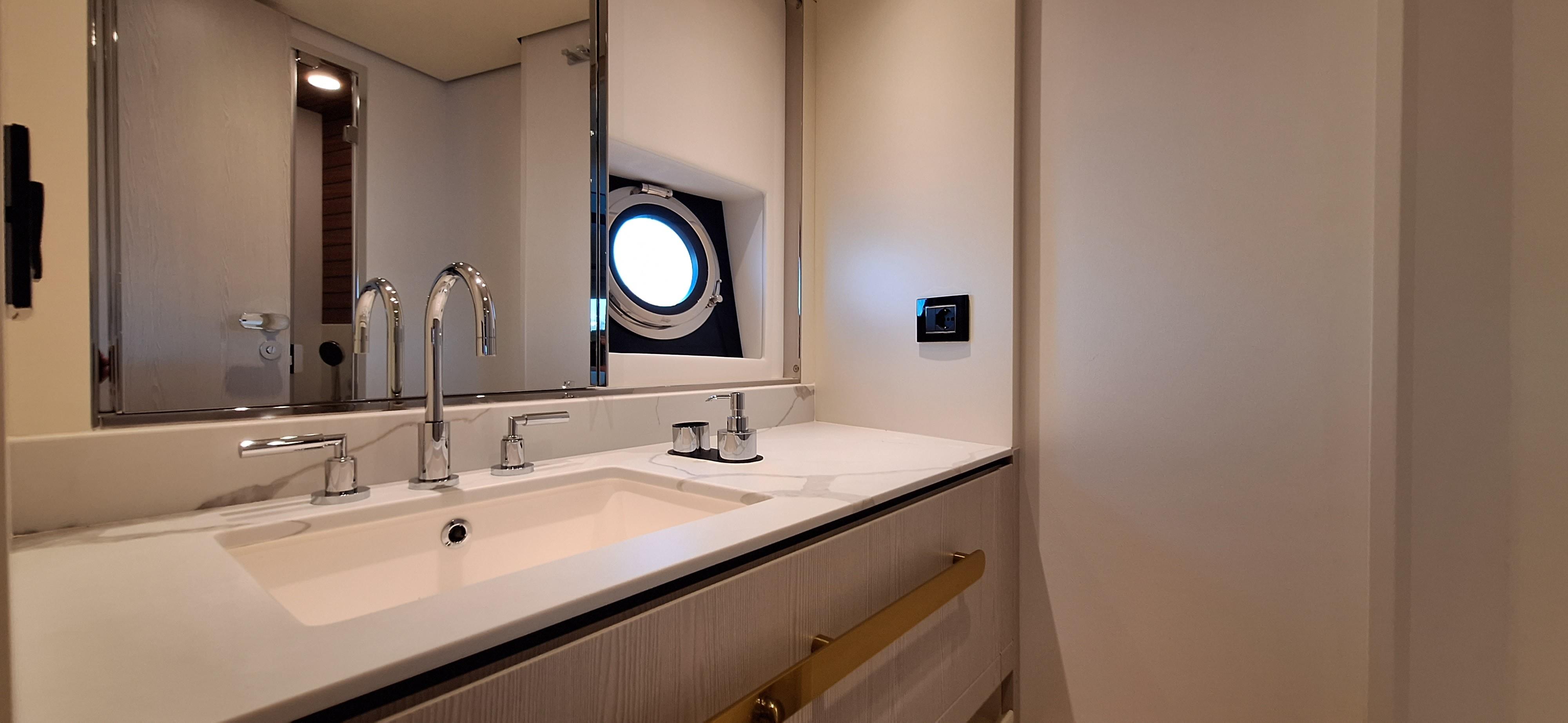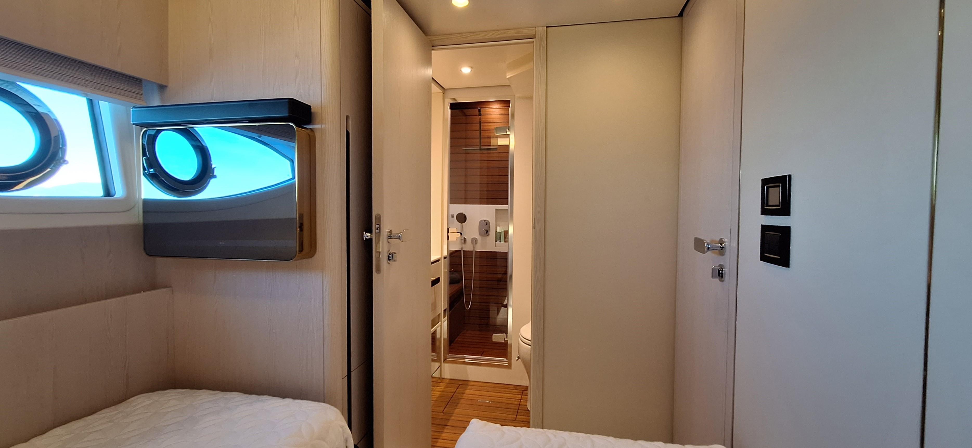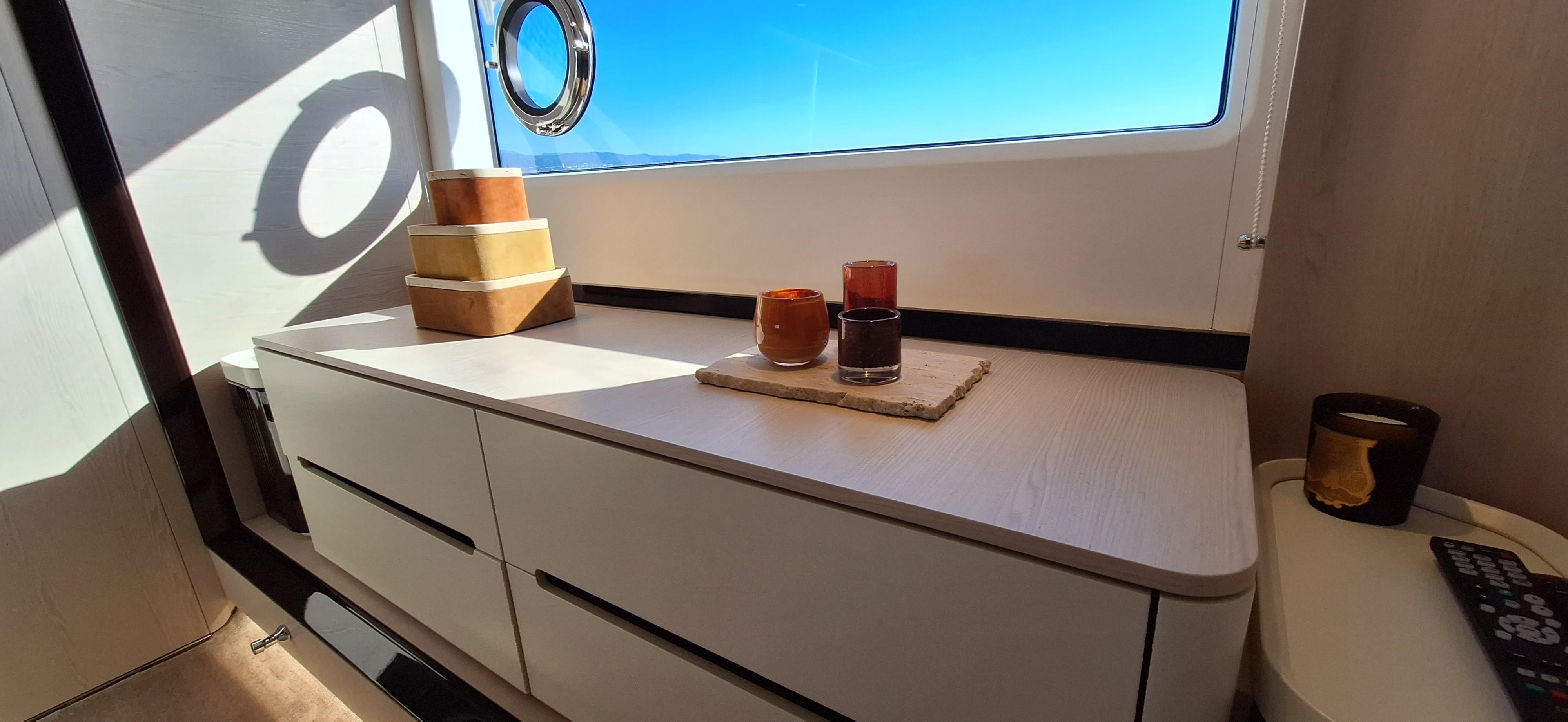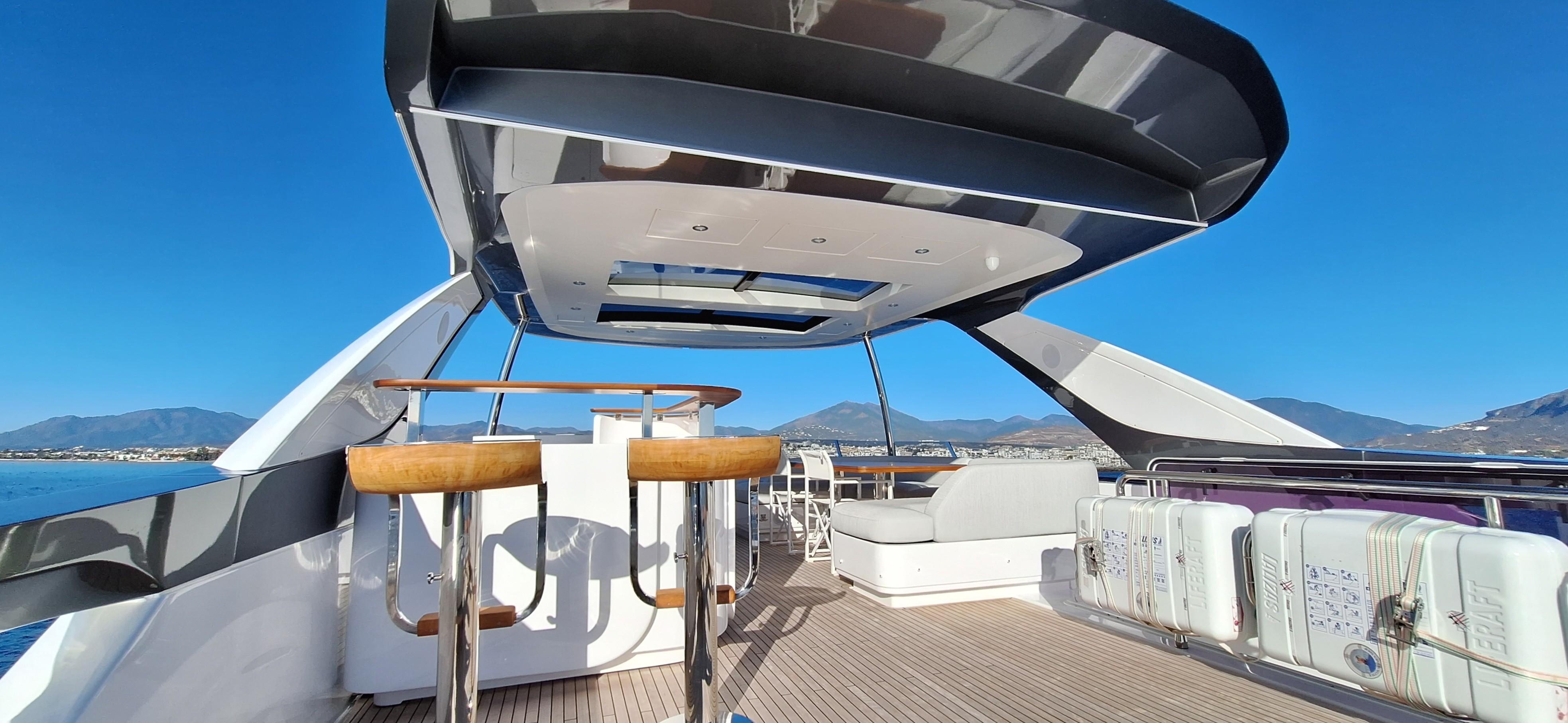 Deze Azimut 78 Fly is uitgevoerd in de exclusieve loungeversie, met twee royale L-vormige salonbanken tegenover het entertainmentcentrum aan stuurboordzijde. Dankzij de zwaarste motorisering, 3x Volvo IPS1350 (D13-1000), bereikt het jacht moeiteloos een topsnelheid van 33 knopen.