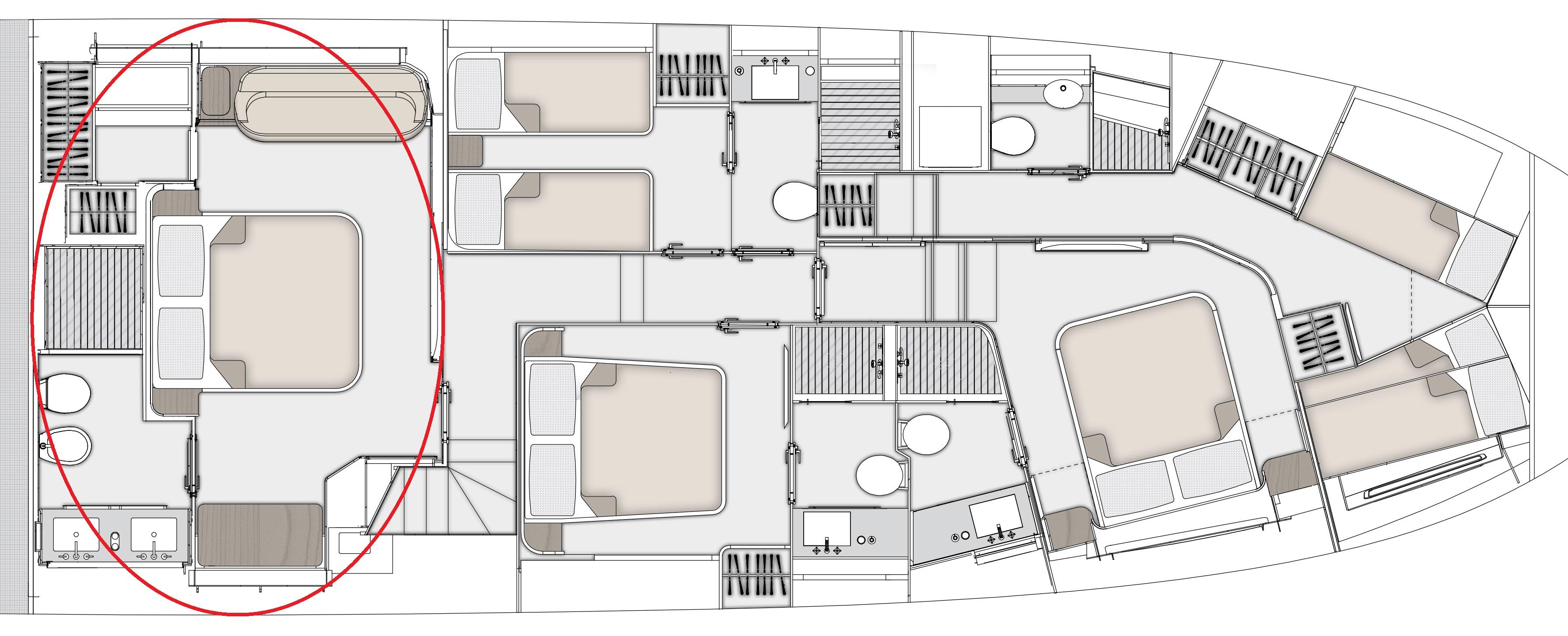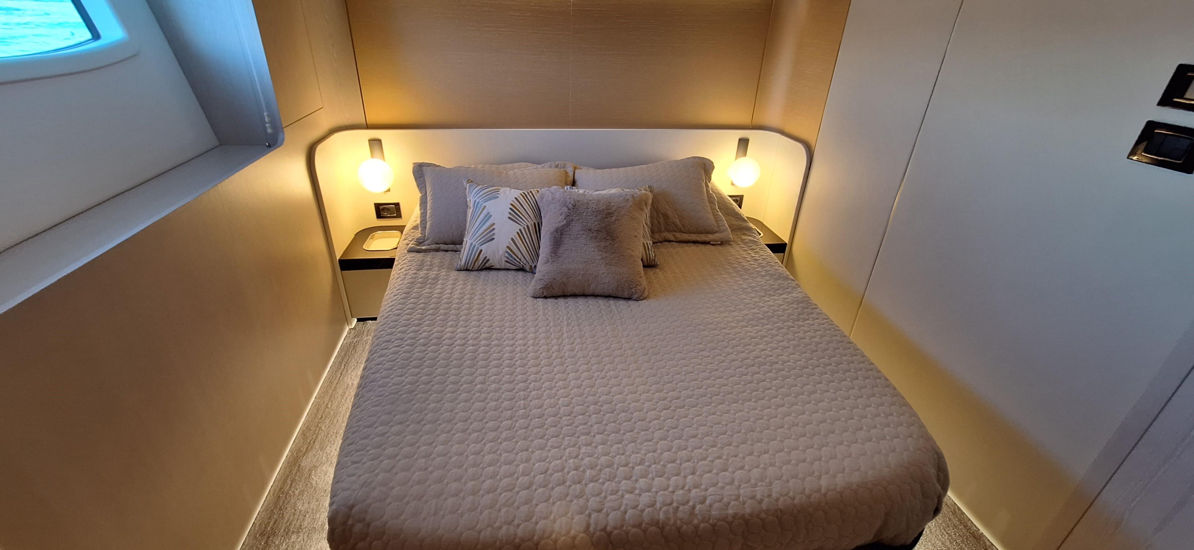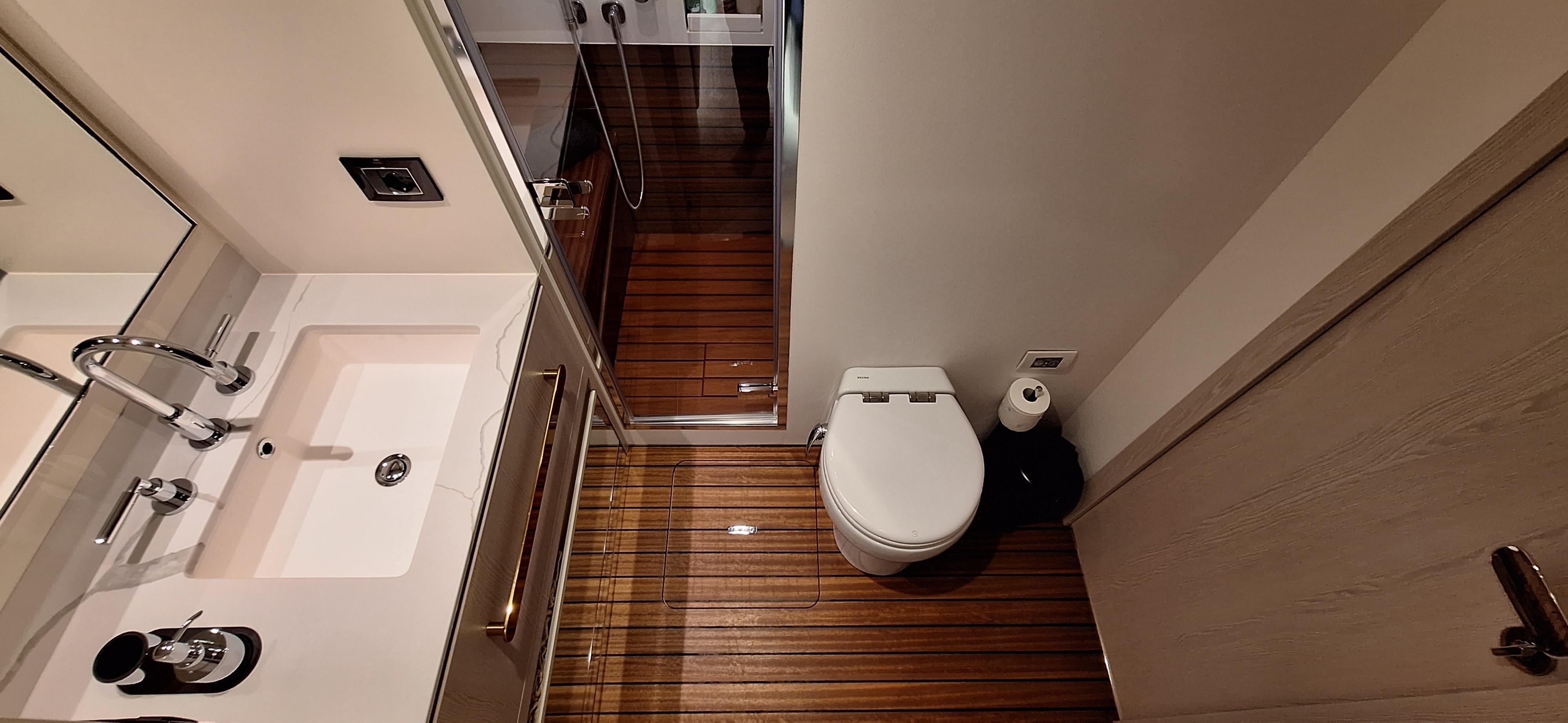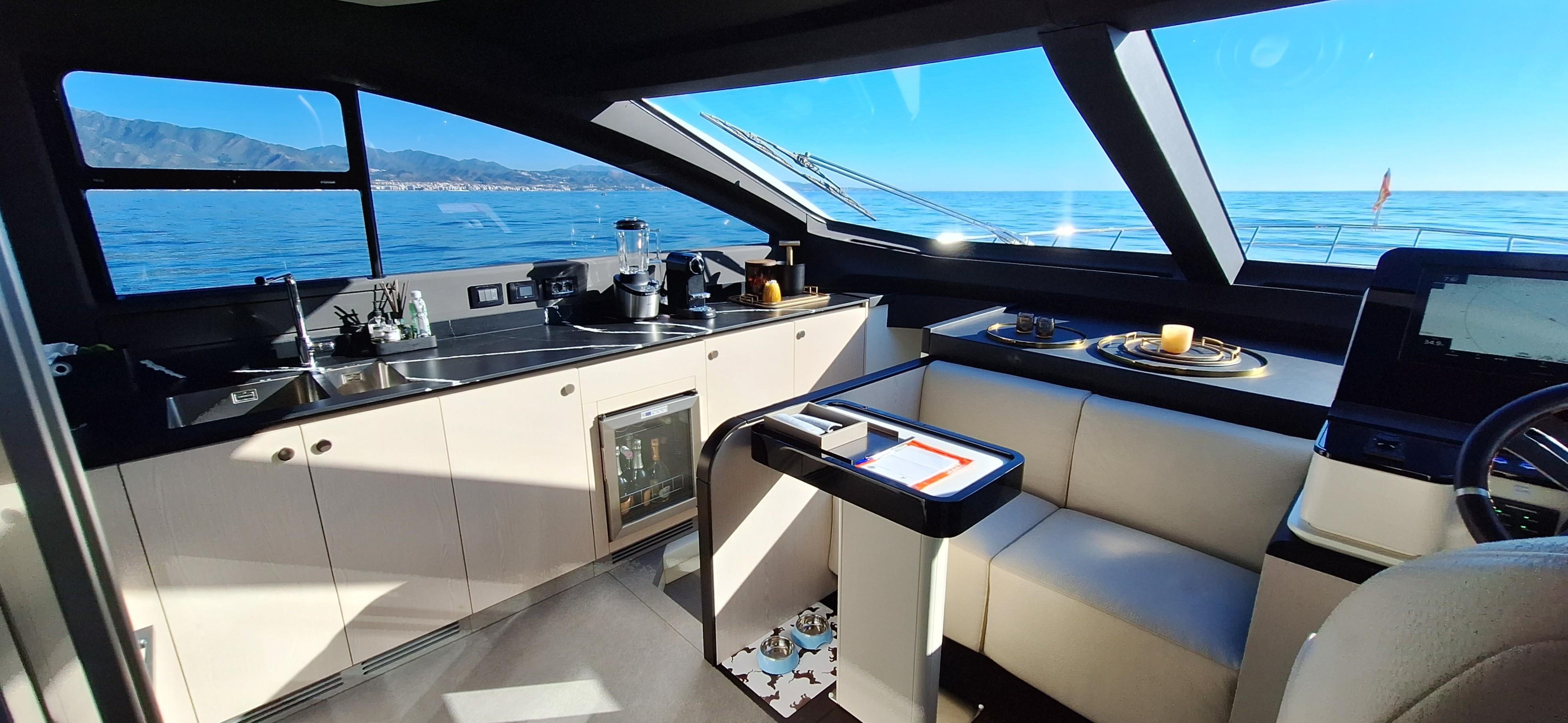 Deze Azimut 78 Fly is uitgevoerd in de exclusieve loungeversie, met twee royale L-vormige salonbanken tegenover het entertainmentcentrum aan stuurboordzijde. Dankzij de zwaarste motorisering, 3x Volvo IPS1350 (D13-1000), bereikt het jacht moeiteloos een topsnelheid van 33 knopen.
