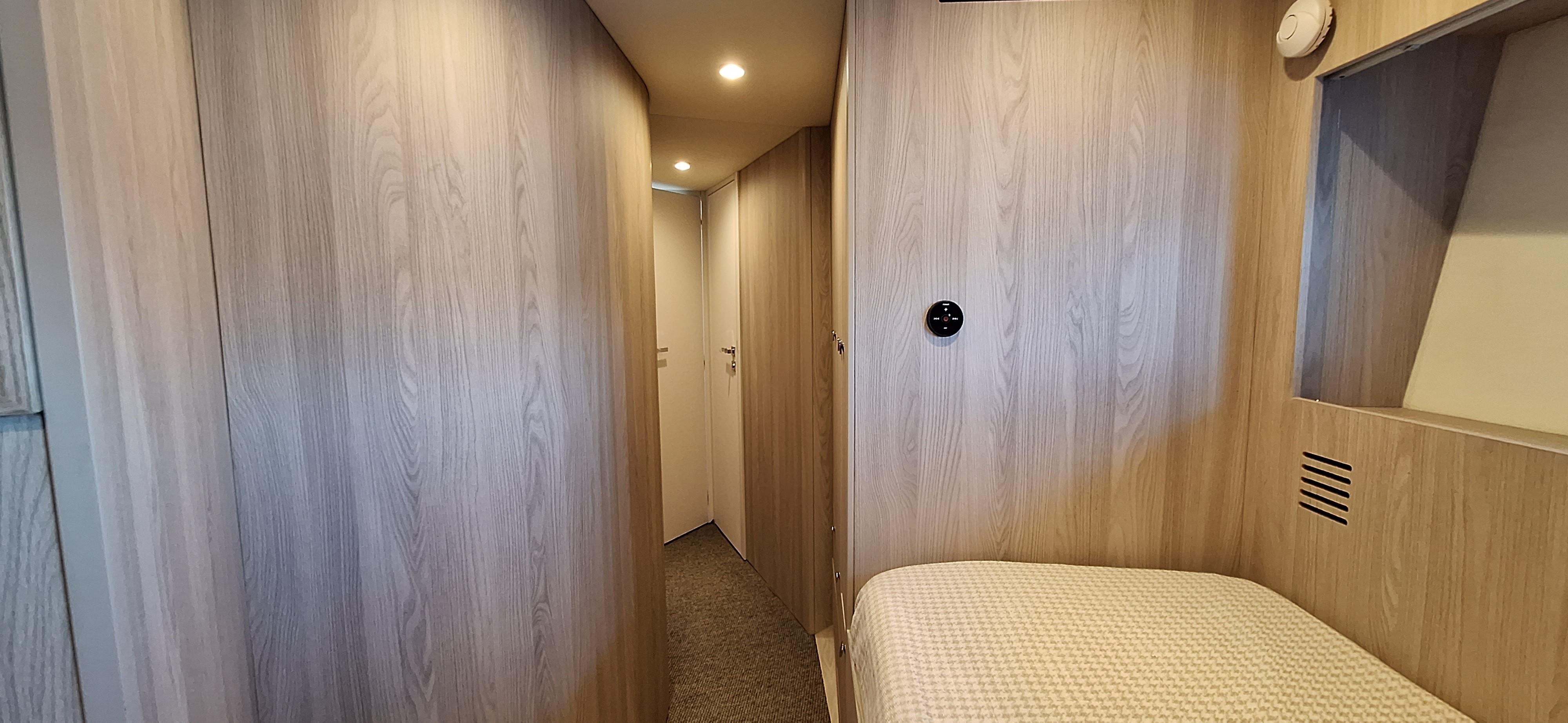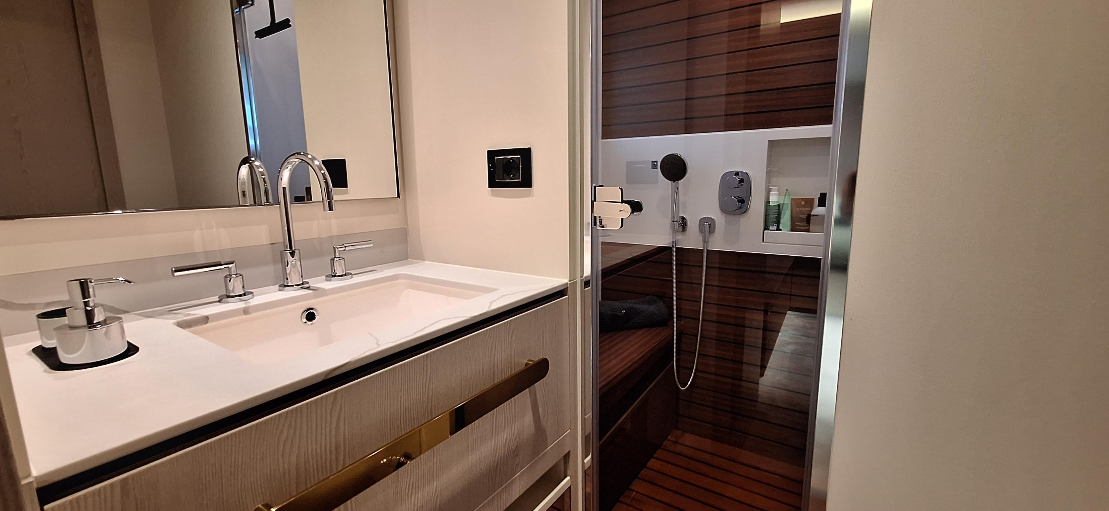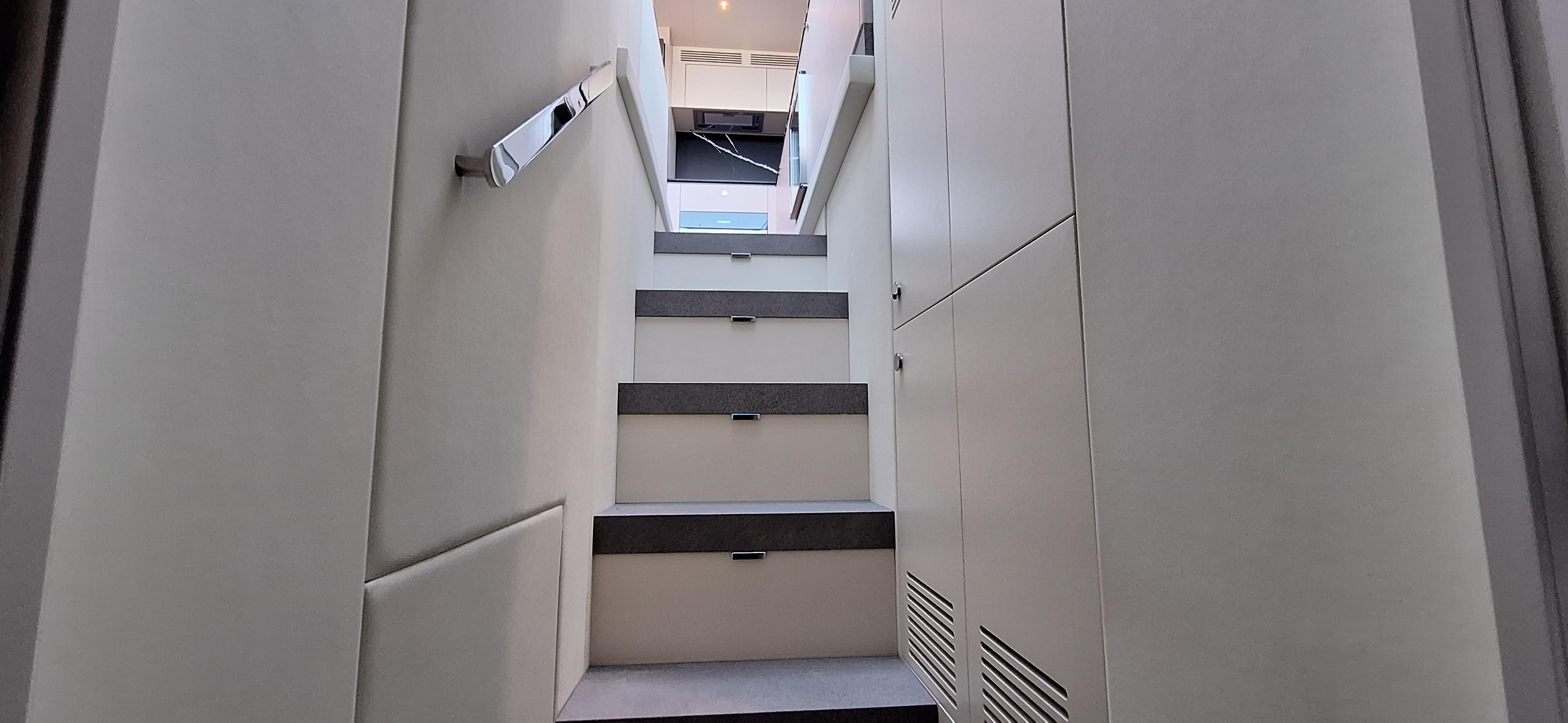 Het interieur is ontworpen door Achille Salvagni en ademt pure luxe: een donkere notenhouten vloer, hoogglans houtafwerking en perfect bijpassende stoffering zorgen voor een verfijnde en tijdloze sfeer.