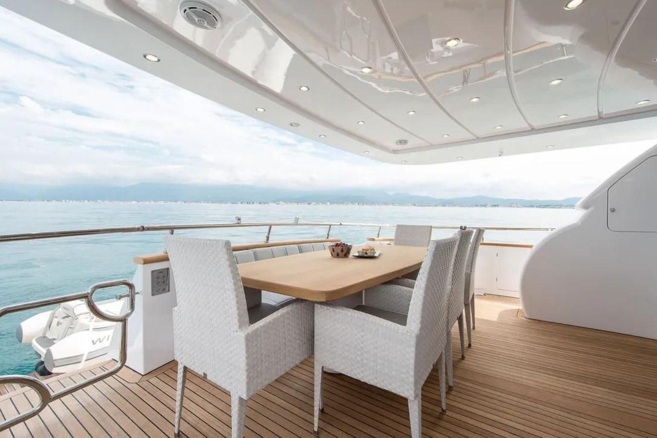 Exterior living spaces on the MAIORA 24S are thoughtfully designed, providing abundant opportunities for relaxation and enjoyment in three different areas. The aft deck has a large dining table for alfresco meals. The foredeck has a small table and bench seating under comfortable awning, and the flybridge is all about casual relaxation – with another alfresco dining table, stand-up wet bar, BBQ grill, and large deluxe Jacuzzi tub surrounded by thick sun pads under sun awnings.