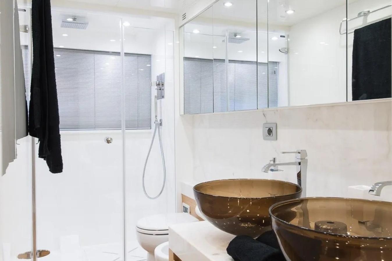 Below deck, 4 inviting en-suite guest staterooms offer comfortable accommodations for up to 10 – a large full-beam Owner’s suite, a VIP double cabin, and two twin guest staterooms that can convert into doubles, each with additional Pullman beds. The modular, modern design of the main saloon seamlessly integrates with the cabins and bathrooms, with the same light bleached wooden walls. Separate accommodation for 3 crew is also provided.