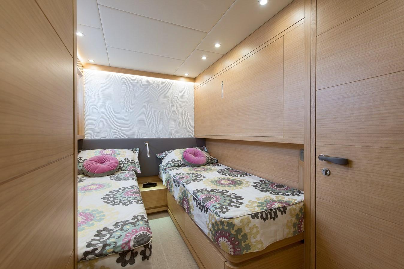 - 2 x Twin guest cabins to port & starboard, each with closets, en-suite bathroom, convertible bed mechanism (to double) and additional Pullman beds
