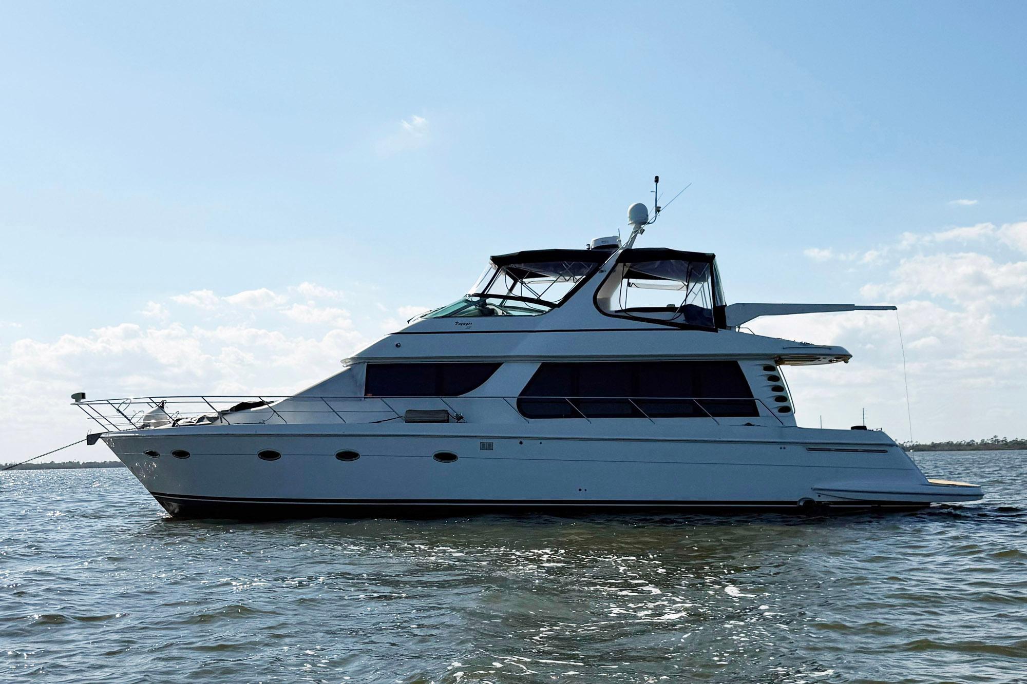 The Carver 57 Voyager is flagship of the Carver fleet, offers an ideal layout, with an open and spacious floorplan. The cockpit, salon and galley are on one convenient level, providing 360-degree views in climate controlled comfort. The pilothouse-style design has good visibility so guests can stay comfortable, if the weather is less than ideal. Below, she has three luxurious staterooms and two heads. She has all the desirable amenities, including 4 zone ac/heat, awesome galley, salon, lower lounge, sky lounge, large cockpit aft deck with seating, and an elegant cherry-wood interior, and tender included!!