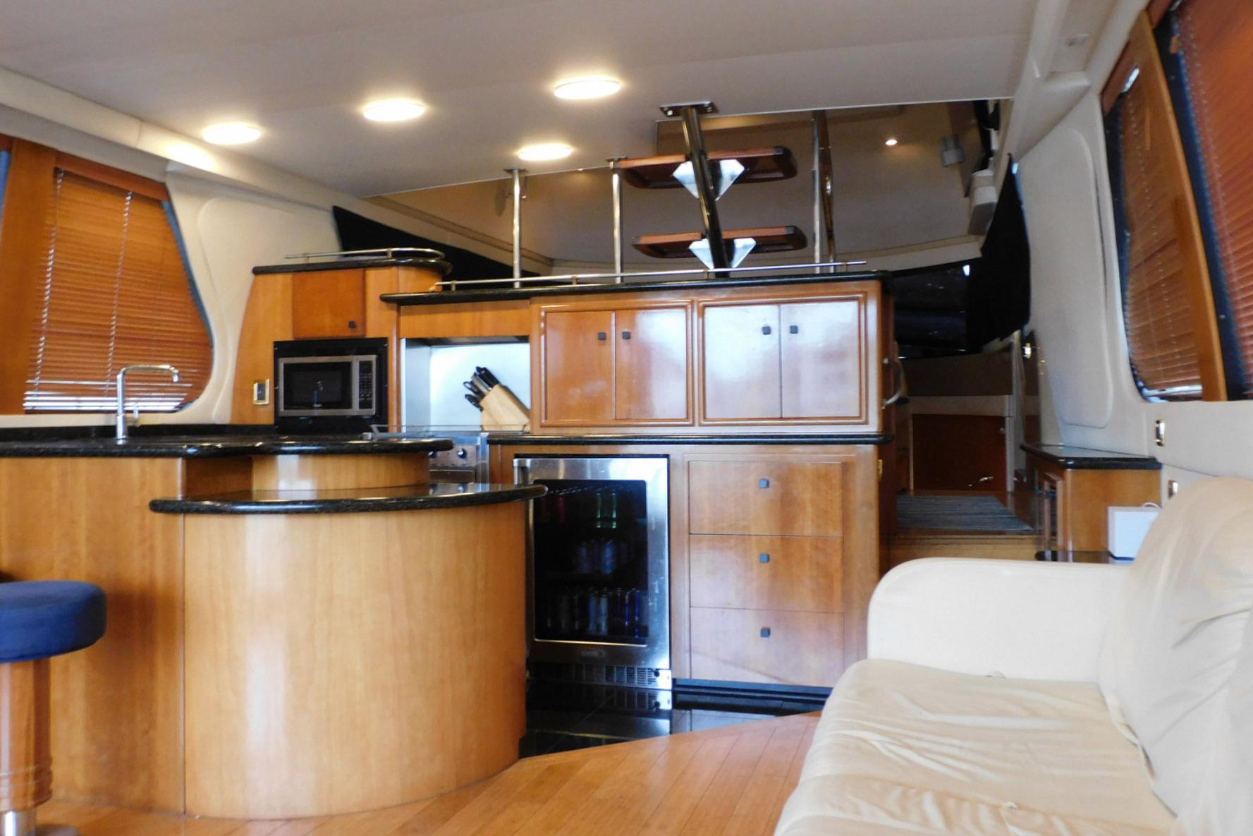 The outdoor "Sky Deck" area seats 10 people comfortably with wrap around seating, wet bar, refrigerator, sink, electric grill and dining table and blue LED courtesy lighting throughout. The dual stairways fore and aft offer quick access to the lower levels and swim platform.
