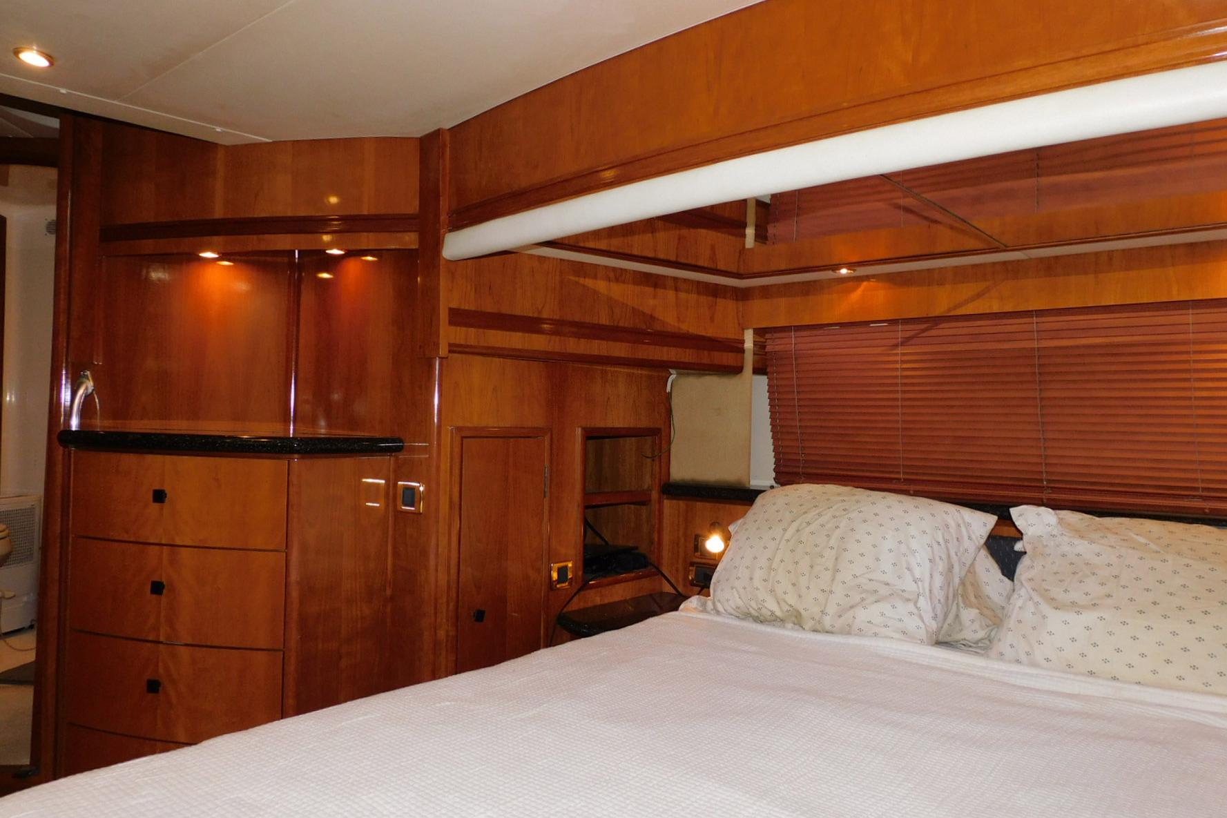 Mid ship, you will find a full beam master bedroom with excellent closet space and a master bath vanity and separate shower/tub with a separate head. The master has built in sound system and custom built in TV alcove, closets and port holes for ventilation and natural light. One of the Master closets is plumbed and prepped for a washer and dryer unit, but currently additional closet space.