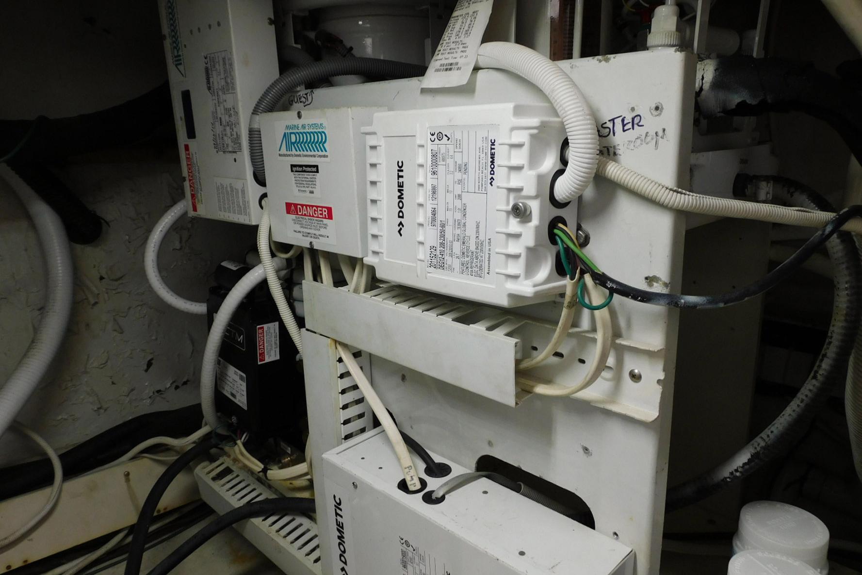 In the Salon there are controls for AC units, recessed lighting, VHF, electric panel access for 12V and 110V, and satellite TV systems.