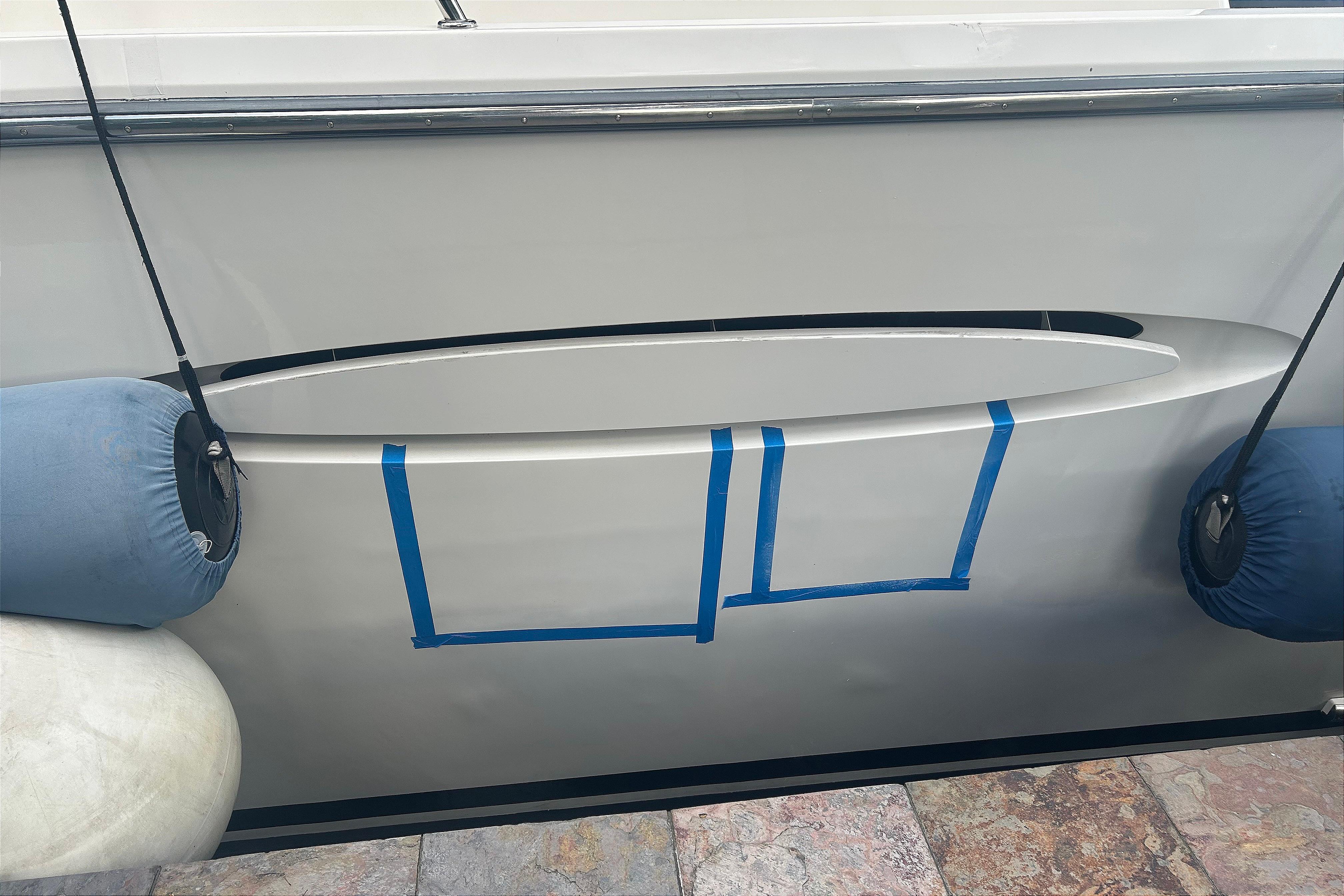 When purchased in 2019, a blue vinyl wrap was applied to the hull. The wrap was recently taken off. There are some nicks, dings & imperfections in the gel coat which has been protected for 6 years by the wrap, that are being repaired.
