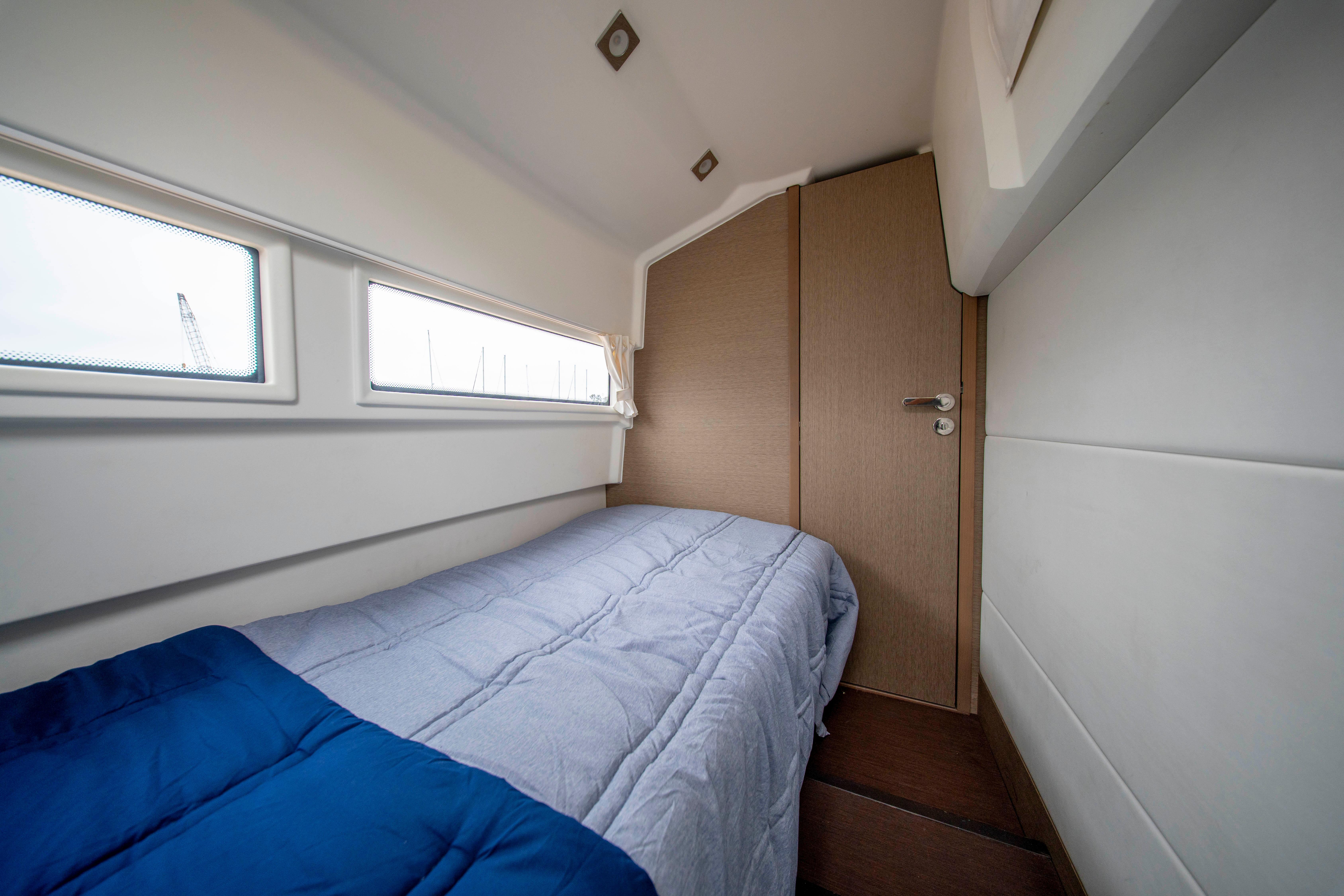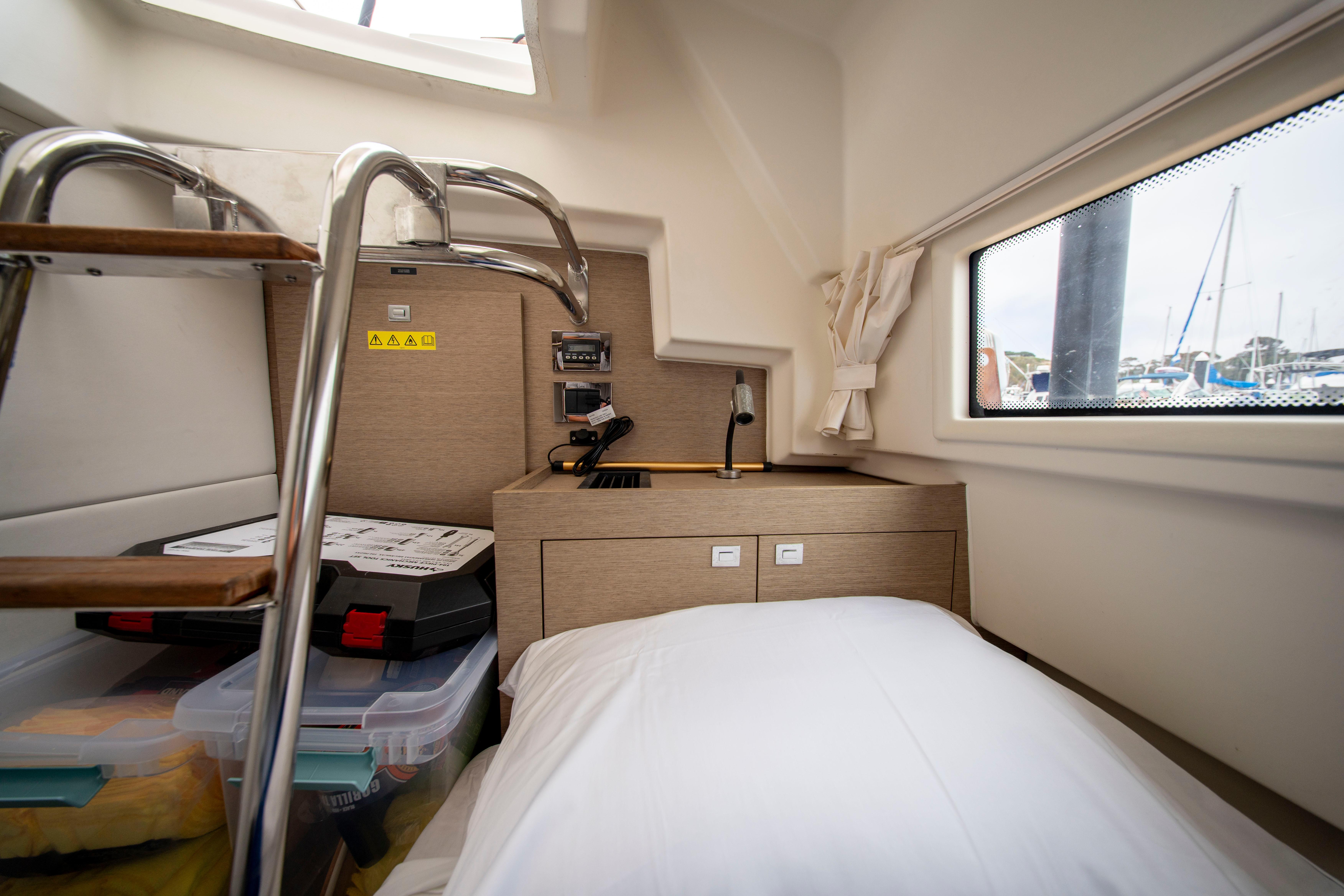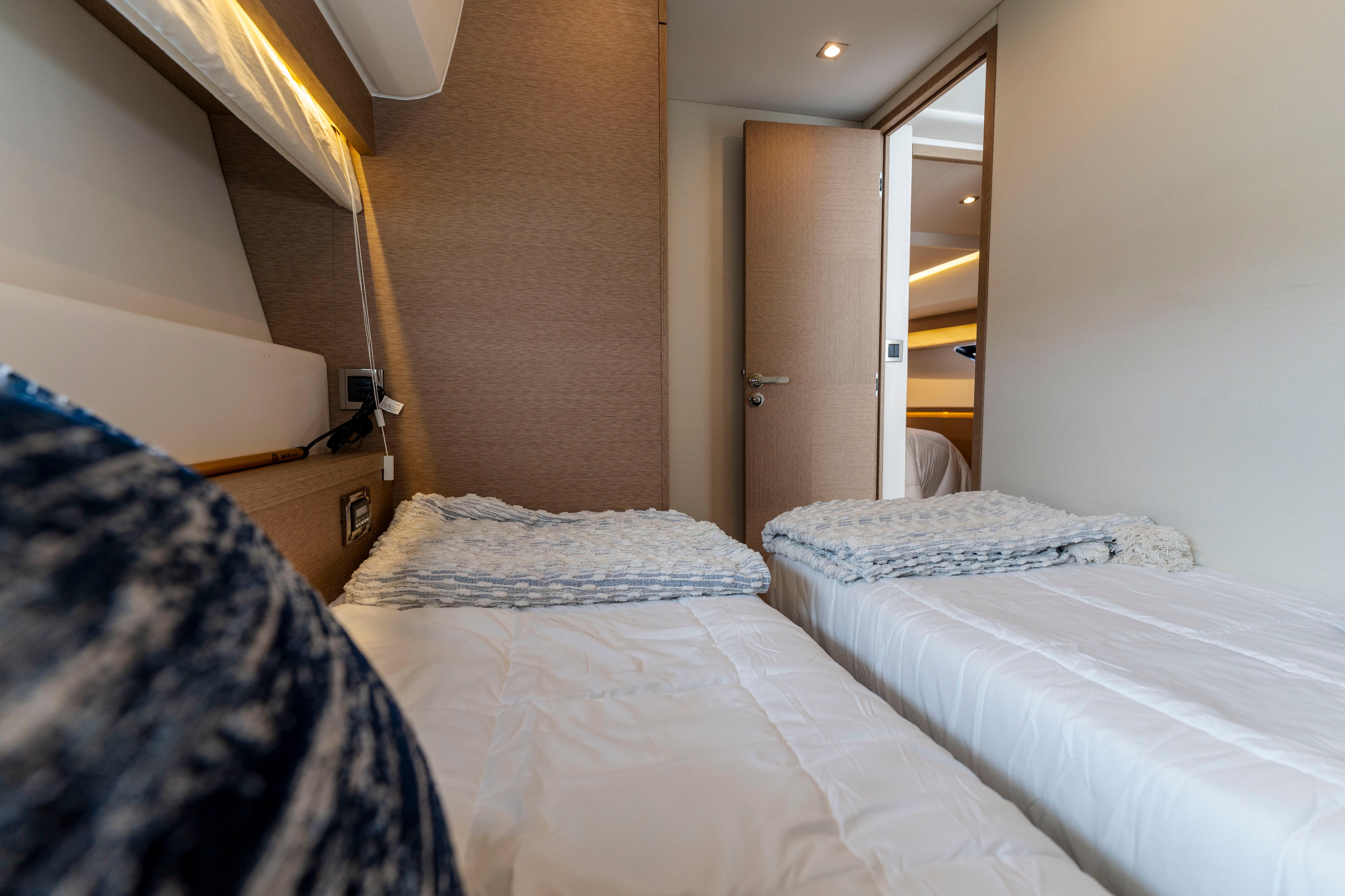 Guest Cabin: Twin berths with conversion capability and generous storage.