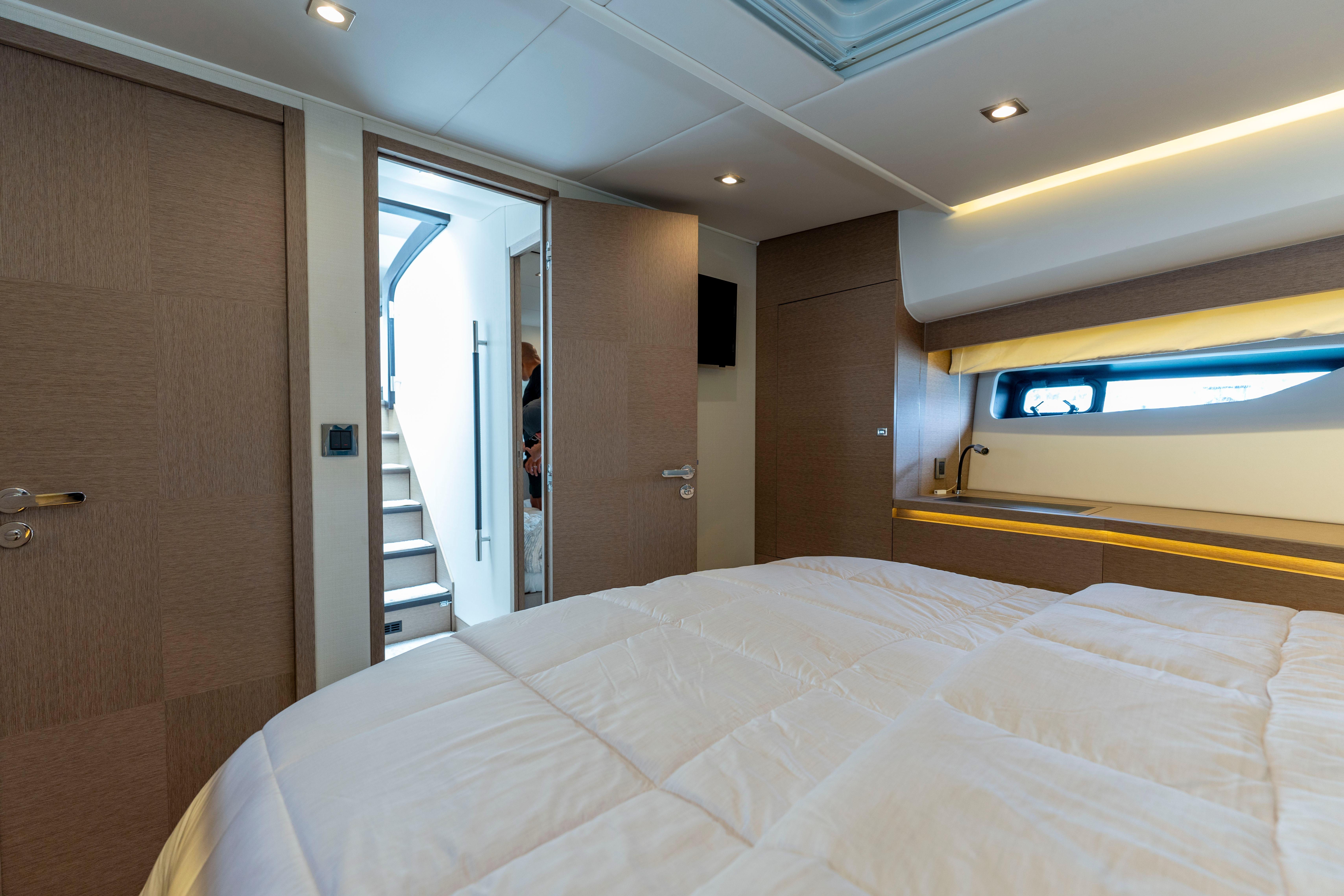 Full-Beam Master Suite: Located midship, the private owner's stateroom features a queen berth, hull-side windows, walk-in closet, and a spacious en-suite head with separate shower.