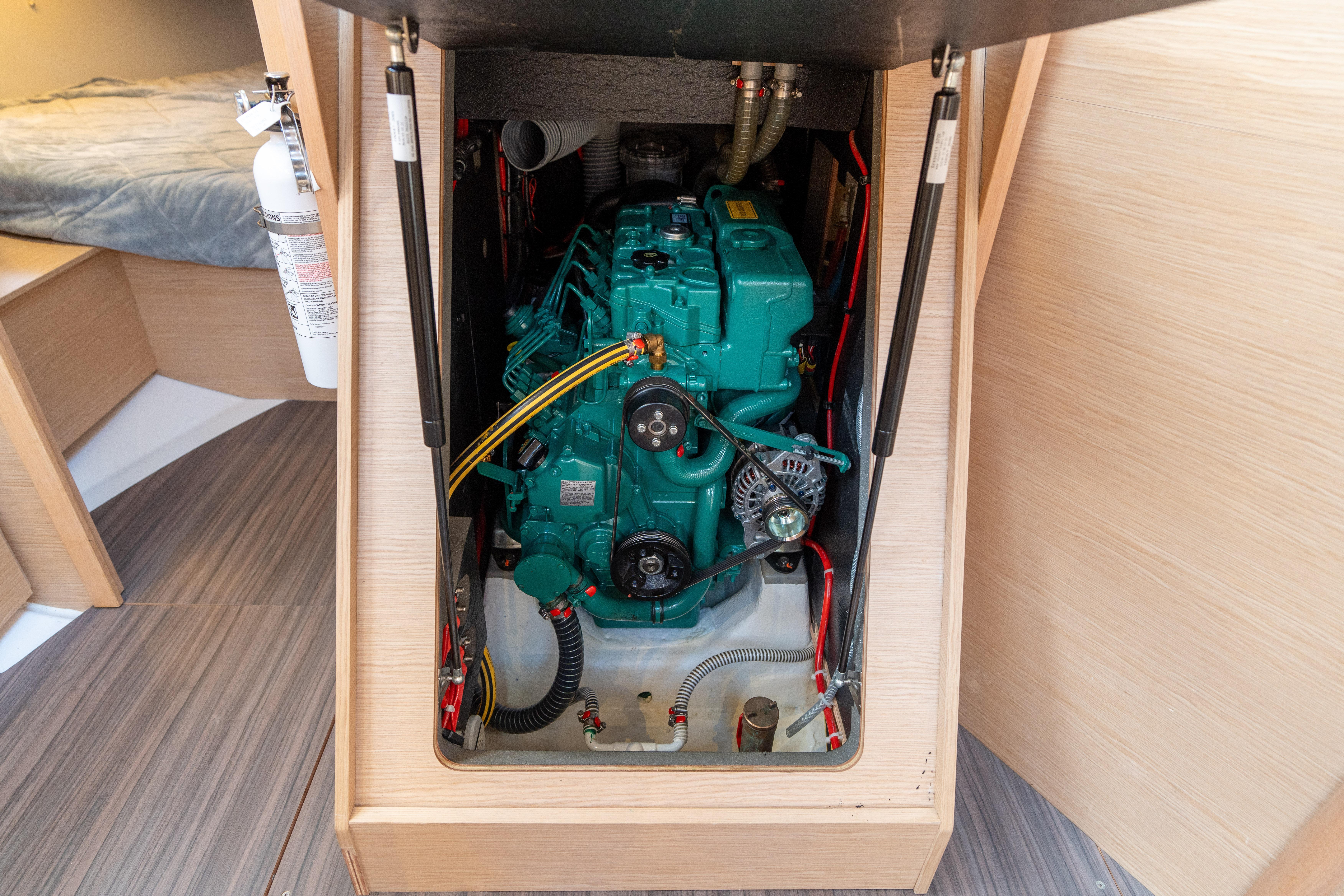 On deck, she features Flexiteek synthetic teak decking on cockpit and side decks, Carbonautica composite helm wheels, custom canvas package with bimini, dodger, connector, and integrated LED strip lighting, lifeline gates, stainless bow protection, retractable davits, outboard engine bracket, and the popular cockpit grill and sink module. A Mantus anchor system with 200’ chain, Quick chain counter & control at the helm, plus deck remote, ensure reliability and ease when anchoring. The upgraded Quantum tri-radial mainsail and 108% jib (new in 2024), plus a never-used North Sails Helix furling gennaker (~$6,000 value), round out a premium package that enhances performance and versatility.