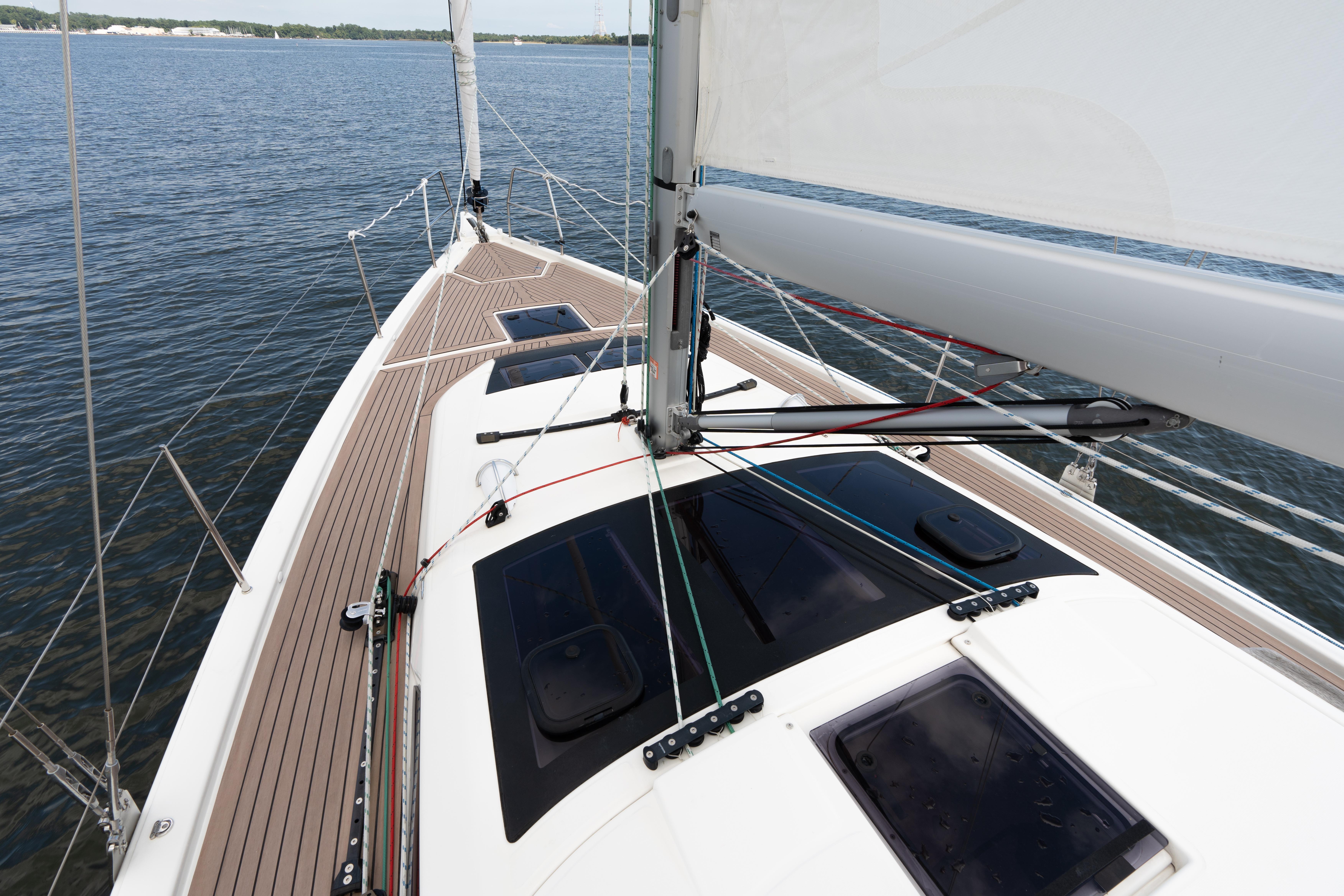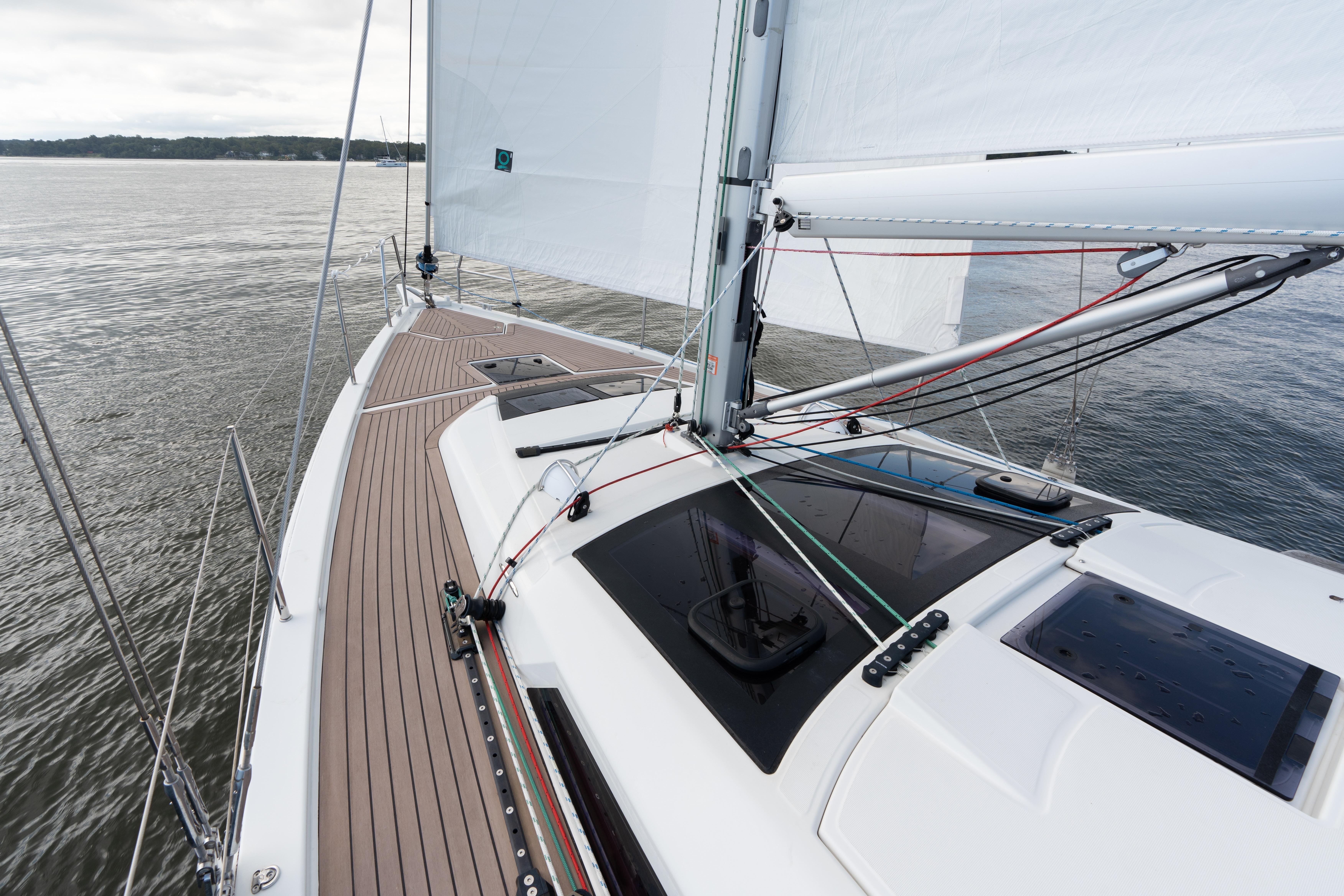 - Quantum Sails tri-radial 108% jib (2024) — 30.1 m², UV Sunbrella cover, telltales, draft stripes, window, bag