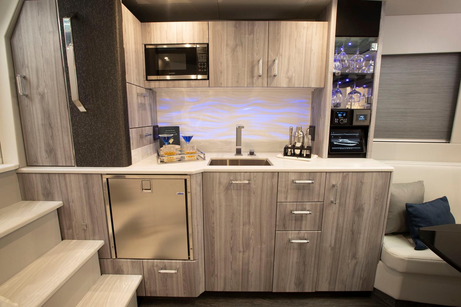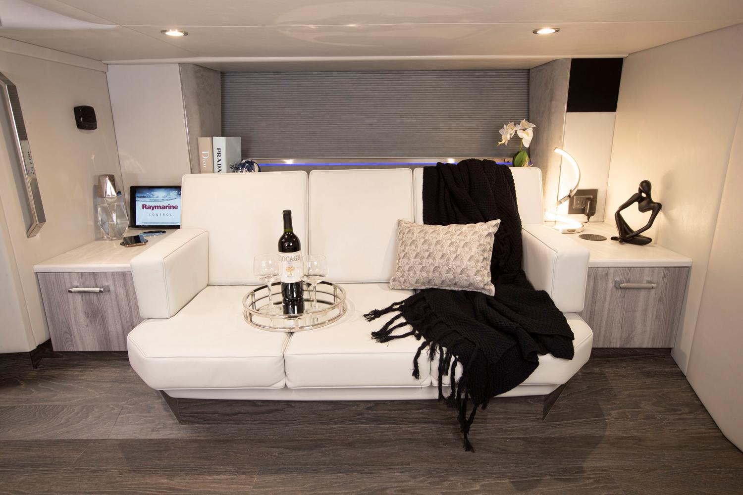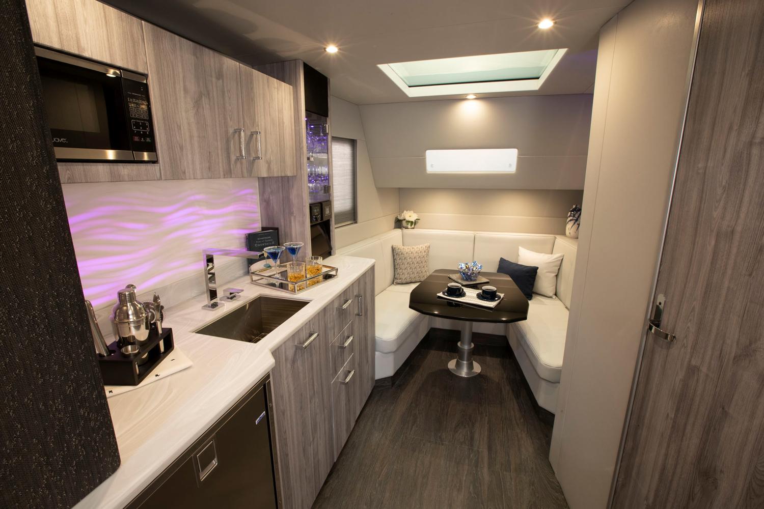 The 500 SSC amenities below offer a respite from the outside world with a true cabin experience. A complete galley at the cabin entry stairs, the large convertible U-lounge forward, a head with Corian surfacing, vanity sink and spacious shower create a residential feel. Slip aft to the separate stateroom with queen-size berth, sofa and complete entertainment suite.