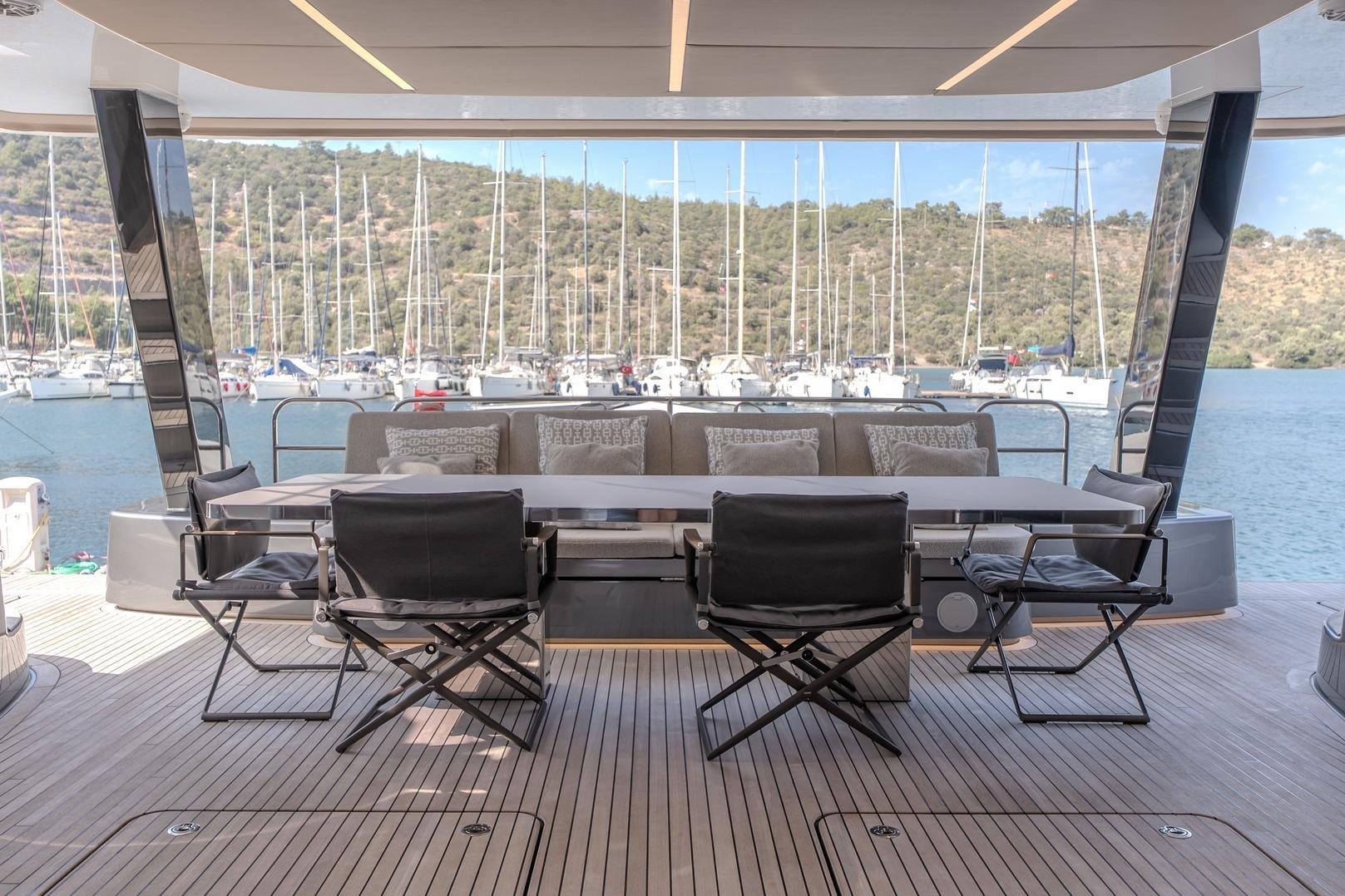 Non standard aft seating area and extended table on fly