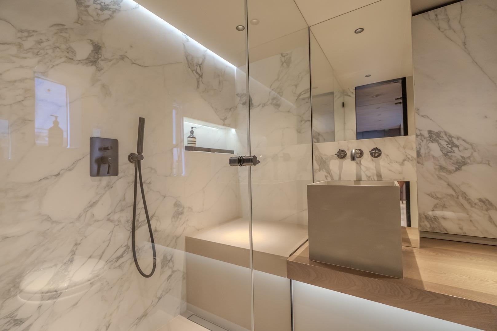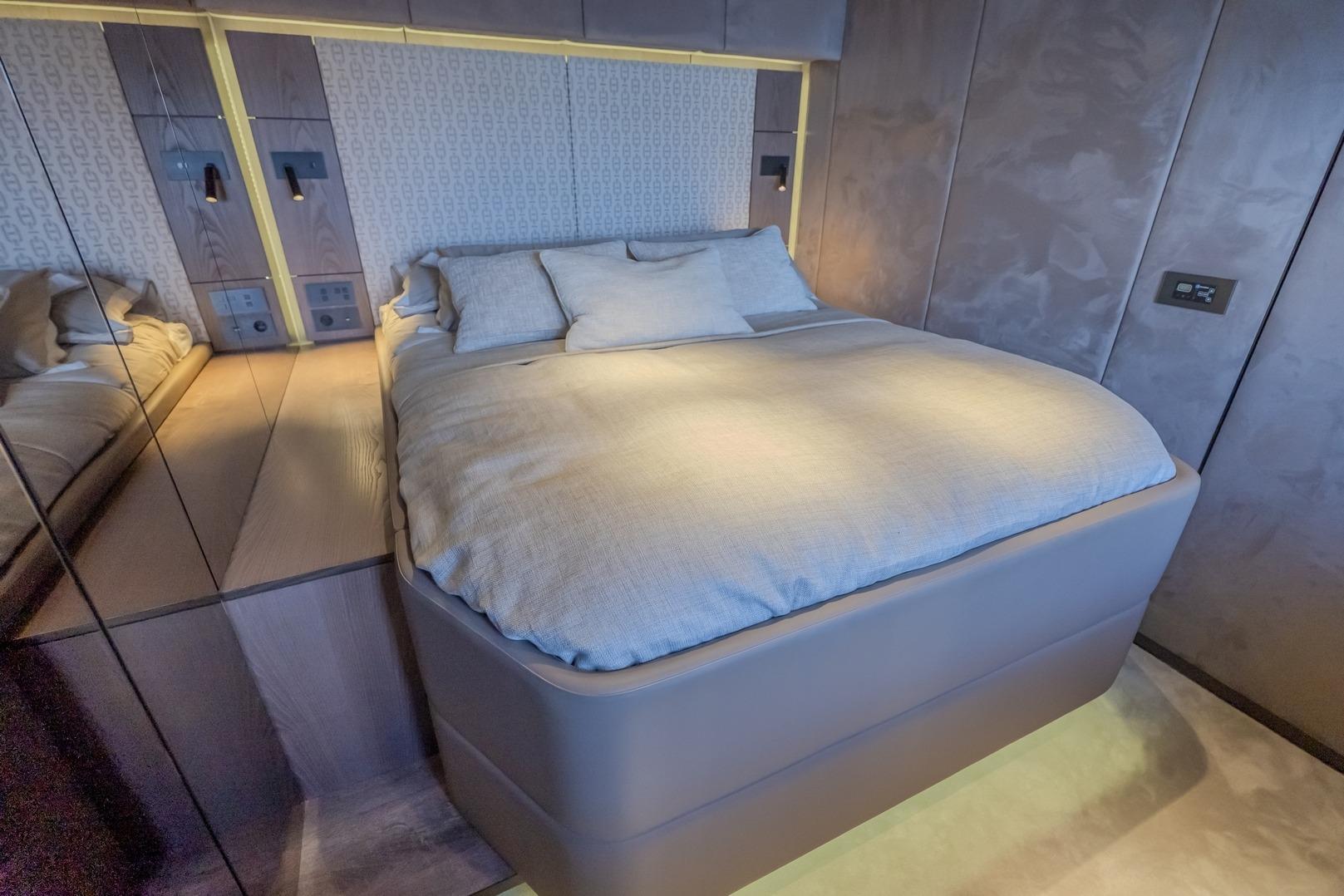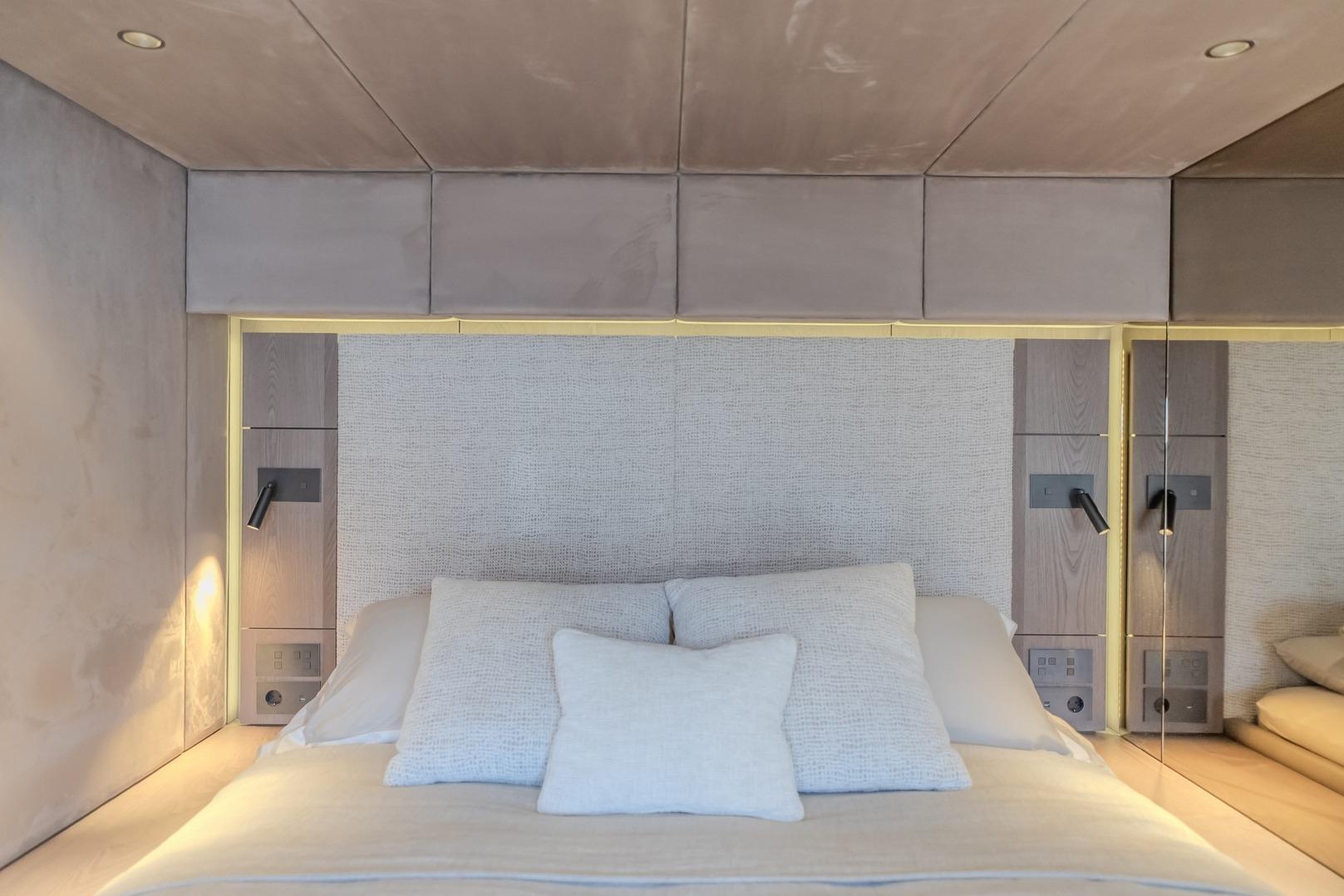 Fitted starboard forepeak Comfort: double bed and bathroom with composite painted wall