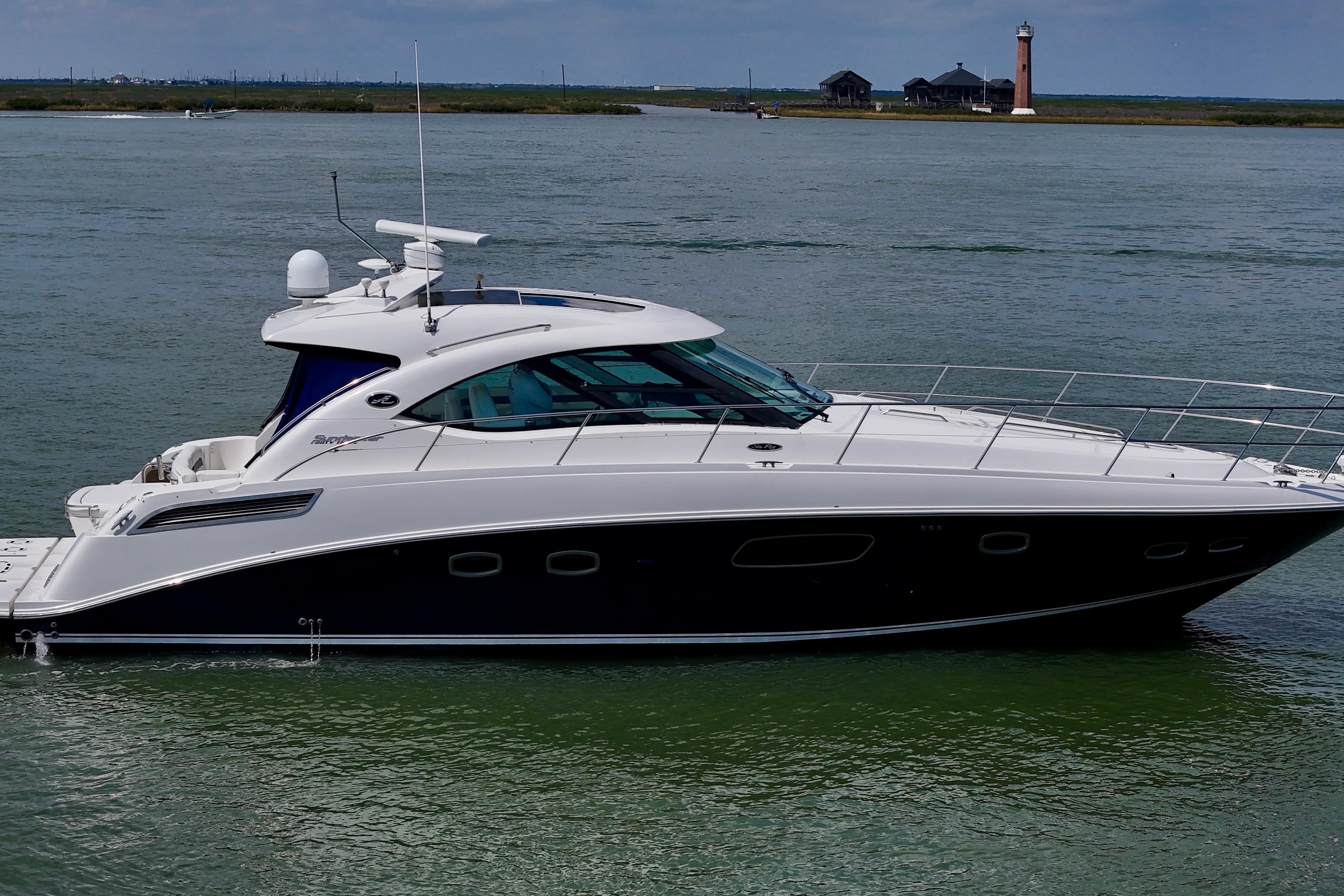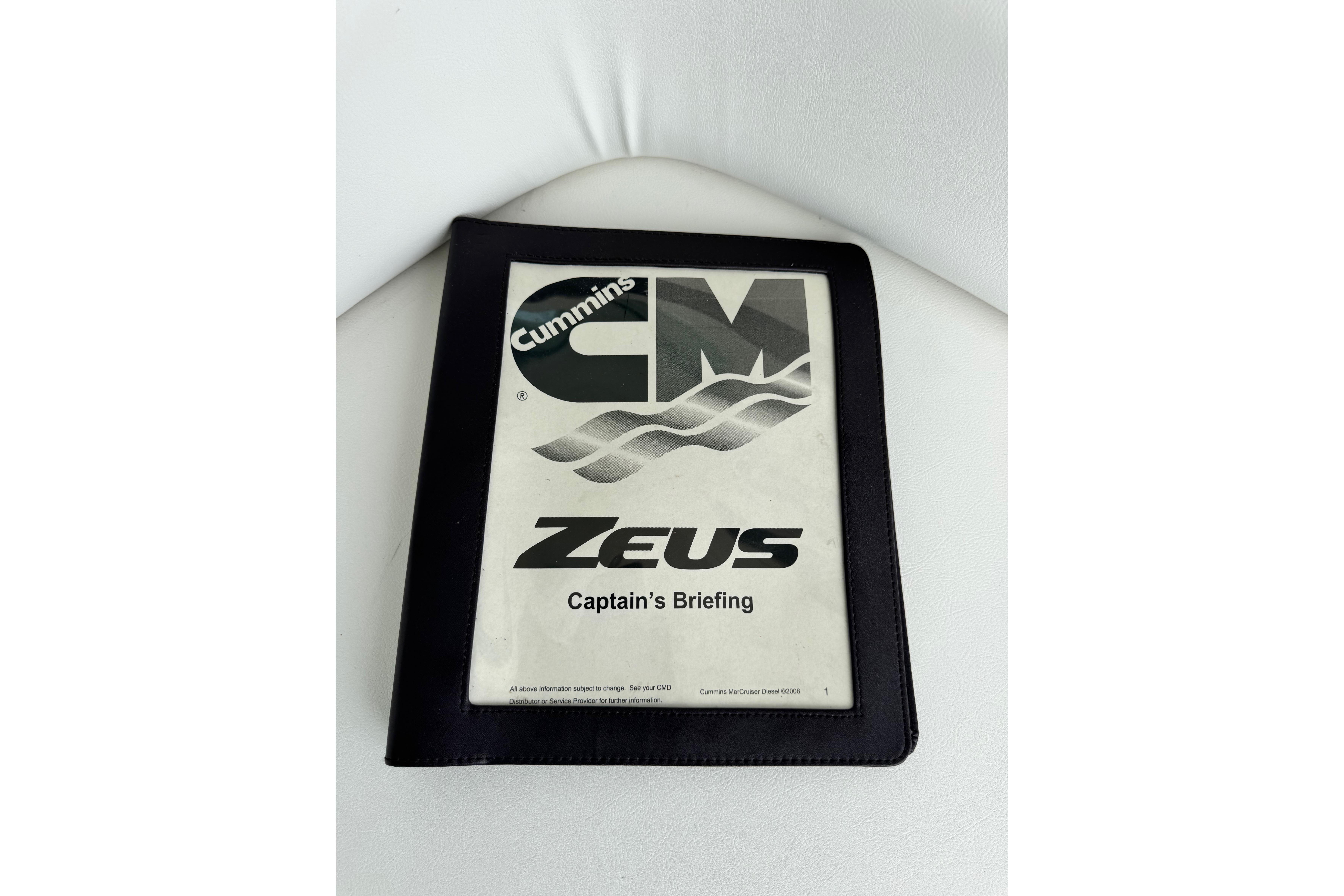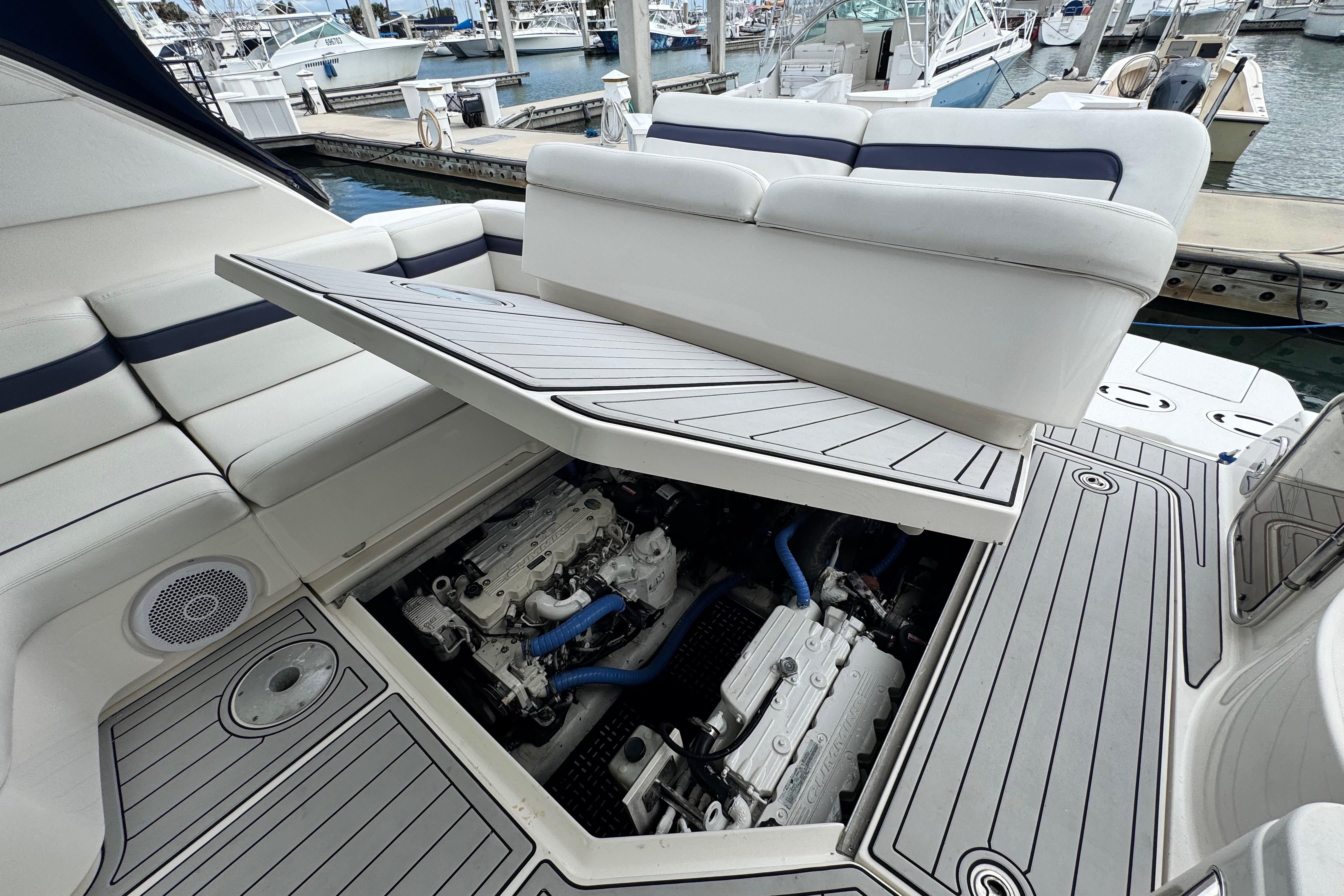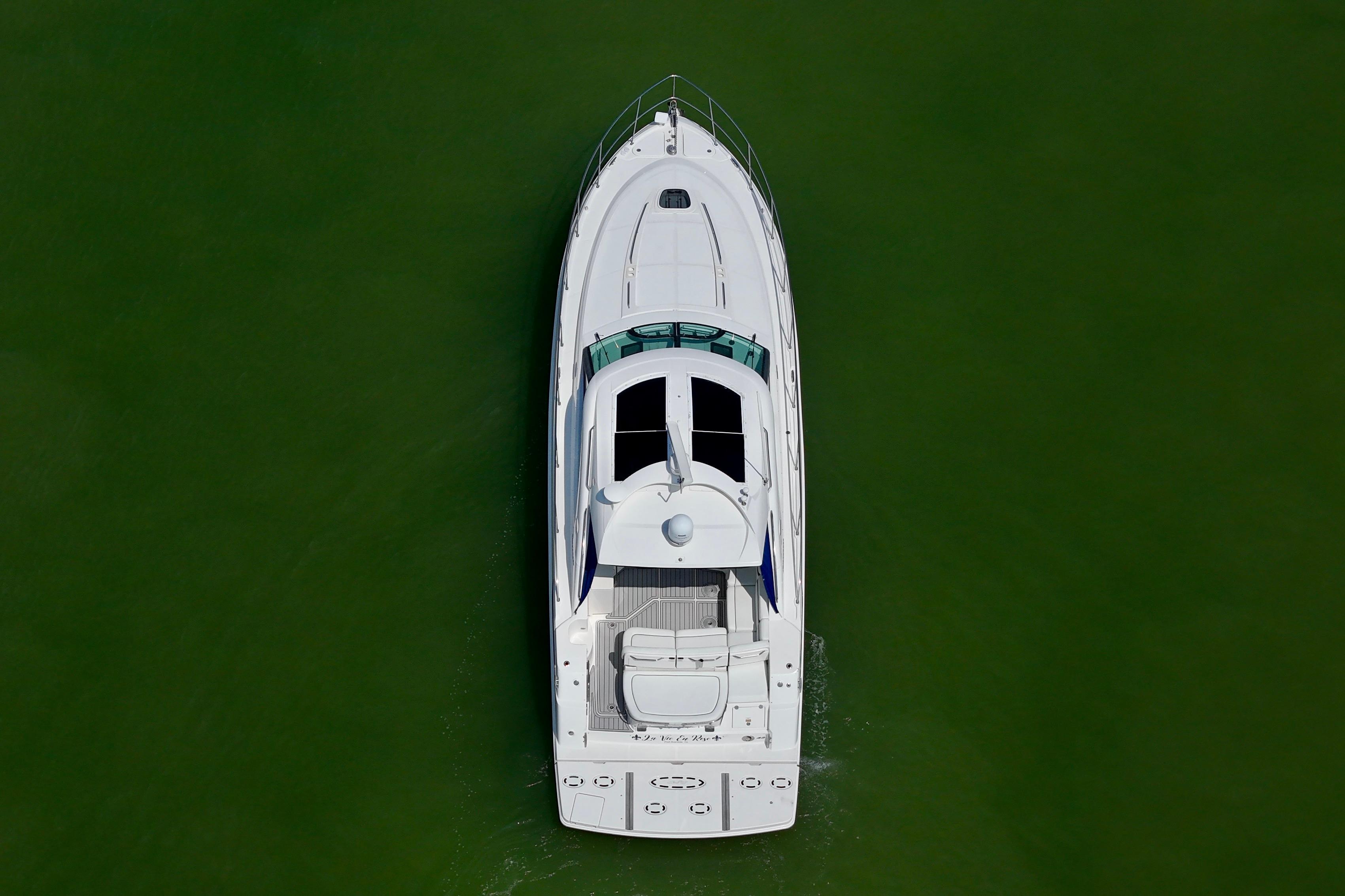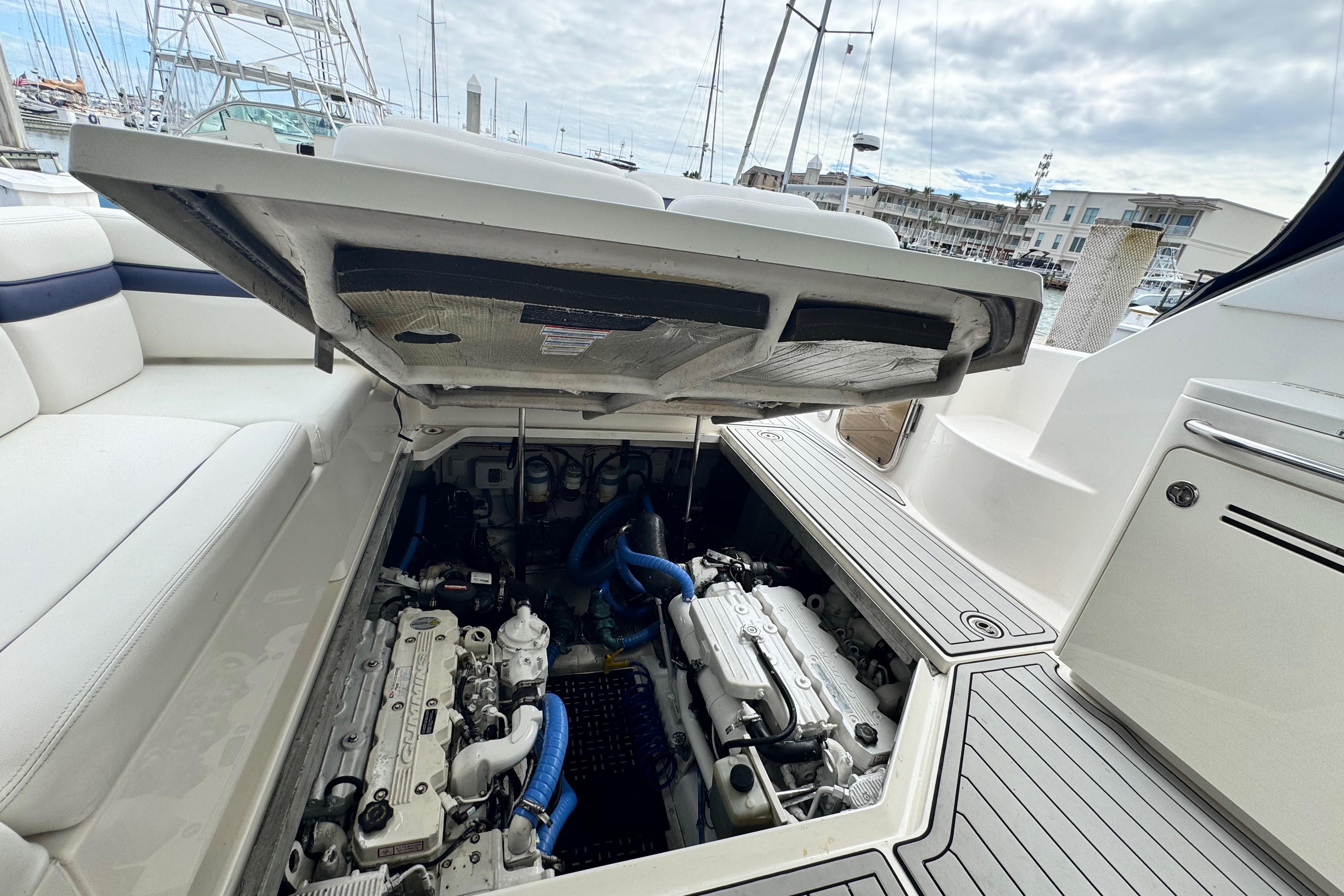 A production 47’ fiberglass composite express cruiser. Twin inboard turbocharged diesel engines with Zeus “Pod” drives. Single 120/240VAC diesel generator. Sharply-raked/flare bow with a stainless steel anchor roller. Reverse walk-through transom with a hydraulic-lifted fiberglass boarding platform. Dark blue and white hullsides with white boot stripes, (12) stainless steel framed portlights, stainless steel engine compartment air vents and plastic/stainless steel rub-rail. White fore deck/side decks with integral fiberglass toe-rails, stainless steel pipe bow/side rail, and one aluminum hatch. White helm deck with rigid frameless wraparound windshield and fiberglass hard-top with two opening skylights, stainless steel pipe hand-rails, and white radar scanner/antenna arch. Open aft cockpit with L-shaped bench seating aft, wet bar with refrigerator and grill to port; and grey closed cell foam sole panels. The engine compartment is located below the hydraulic lifting cockpit sole panel. Moving forward up one step and onto the helm deck - the helm station is forward to starboard, and a bench seat is to port. The cabin entry companionway sliding door is forward off-center. Enter the salon via the helm deck steps. A large L-shaped sofa, with table is to starboard. The galley is to port. Moving forward across the salon, the forward private head is to port, and the private shower stall is to starboard. Continue forward into the private forward cabin - with an island queen berth forward on center; and storage lockers outboard to port and starboard. Moving aft, across the salon and into the private aft cabin through the port access door - The private head is aft to port, and then two steps down into the private aft cabin - with two single berths.