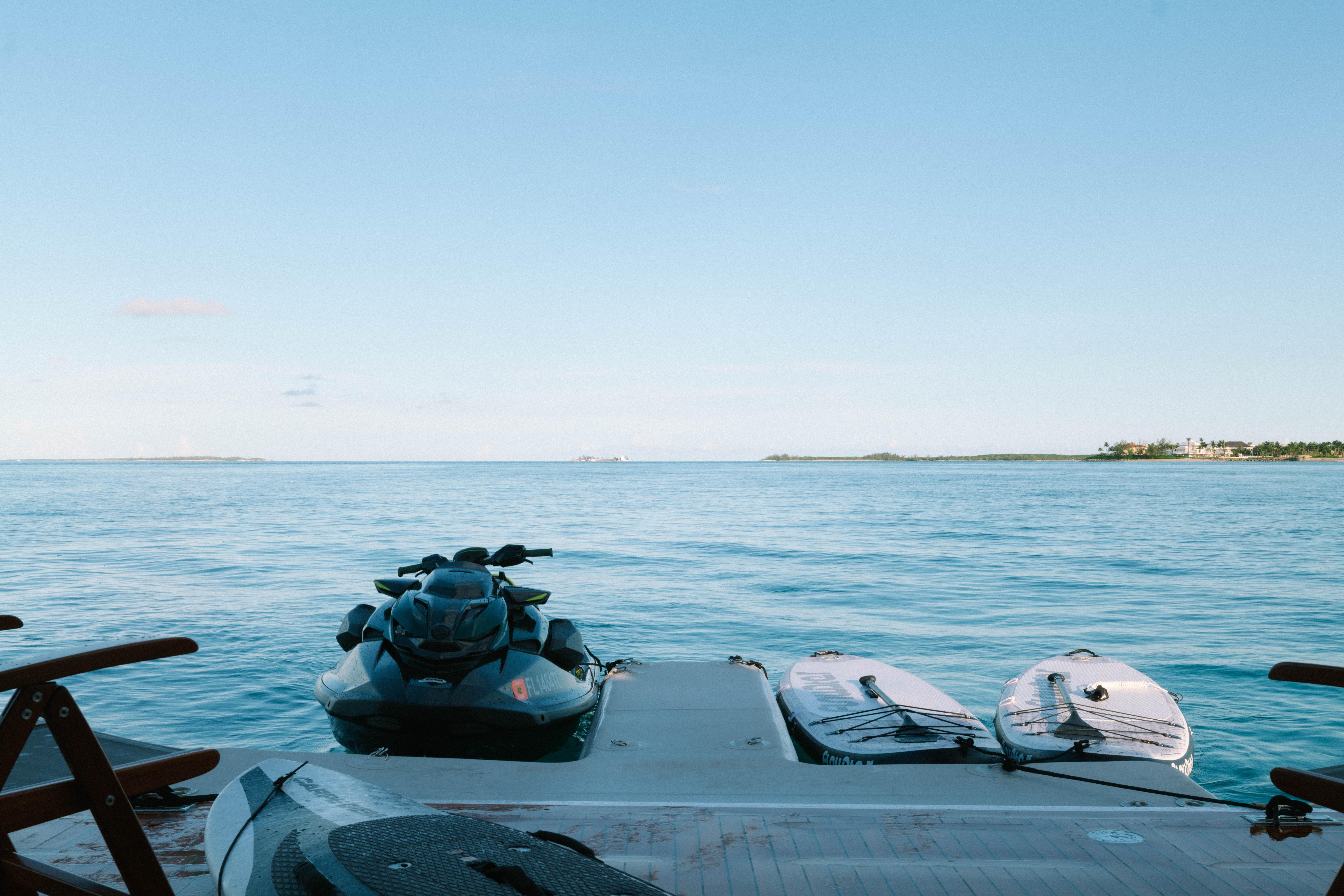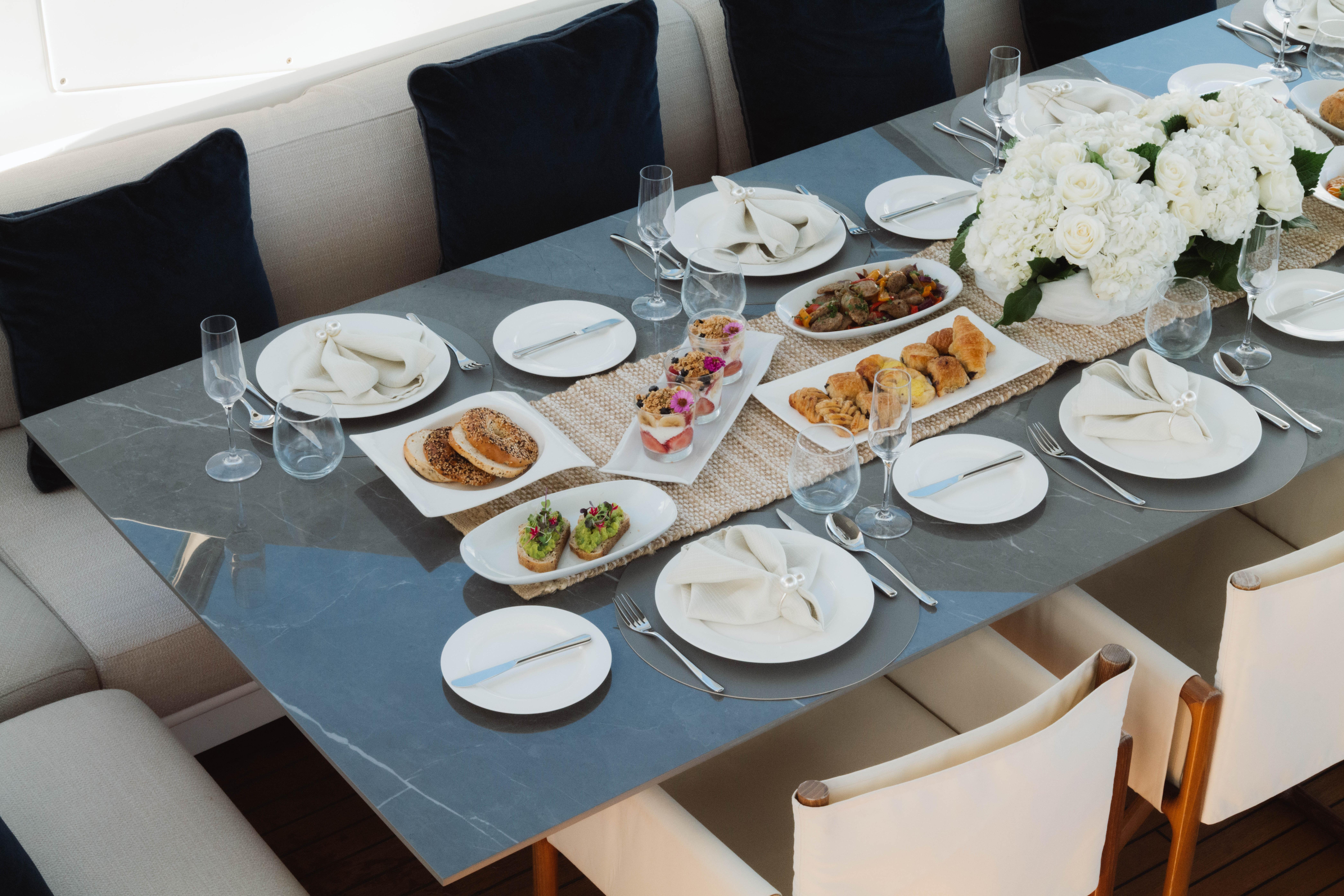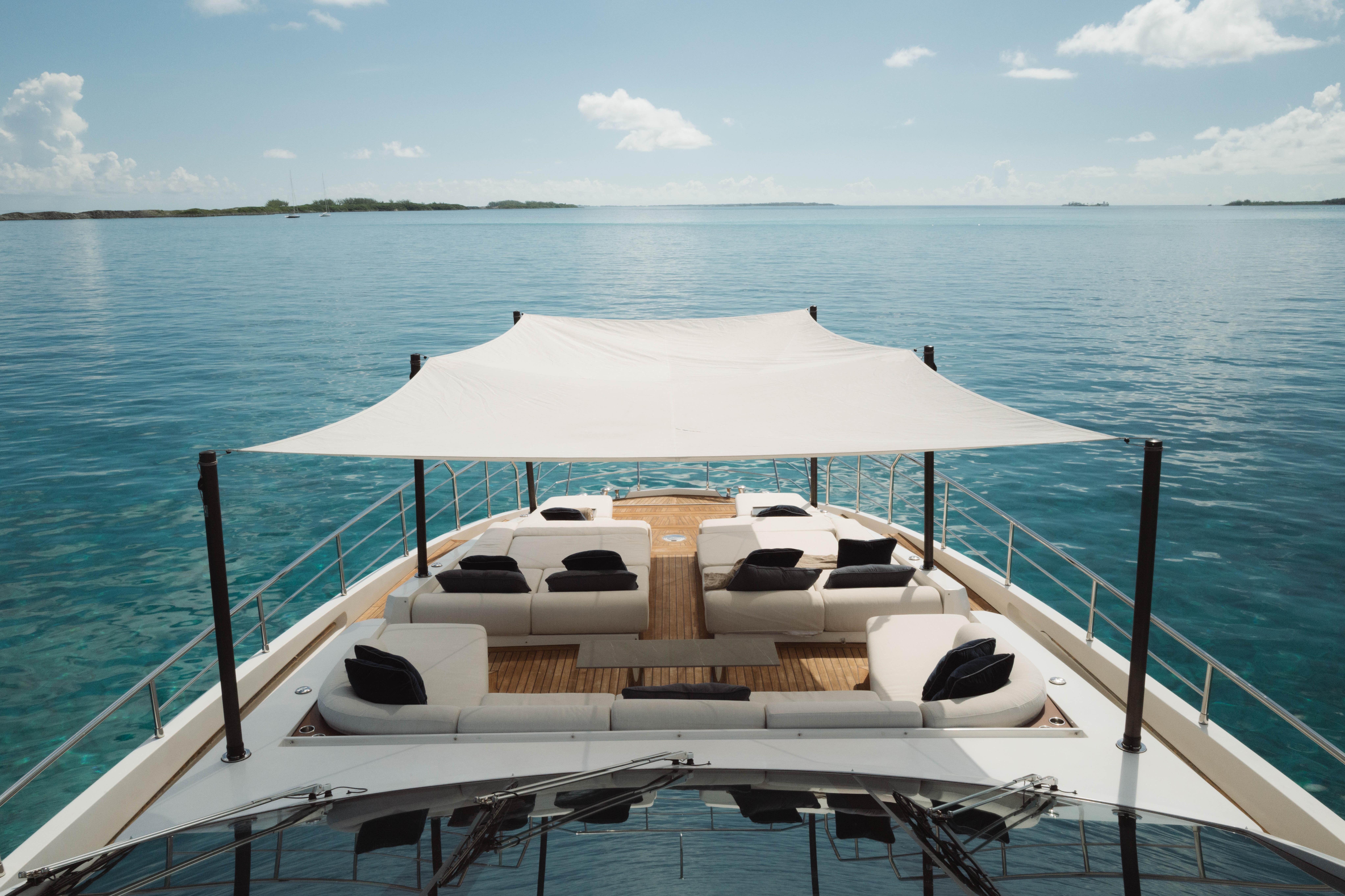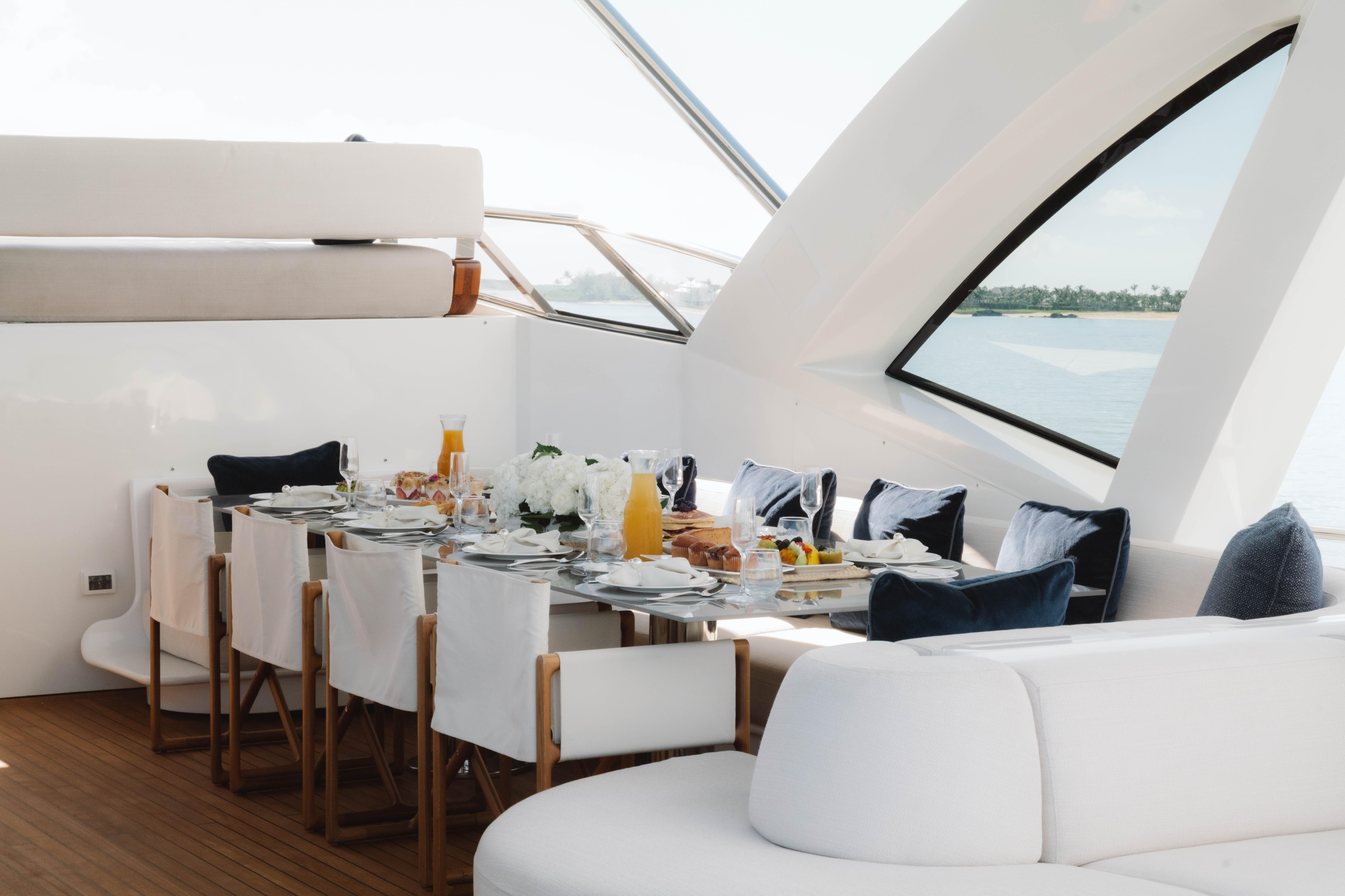 Expansive exterior decks provide versatile spaces for entertaining and relaxation, from her panoramic flybridge with retractable sunroof, Jacuzzi, and bar, to the refined beach club with floating dock for seamless access to the water.