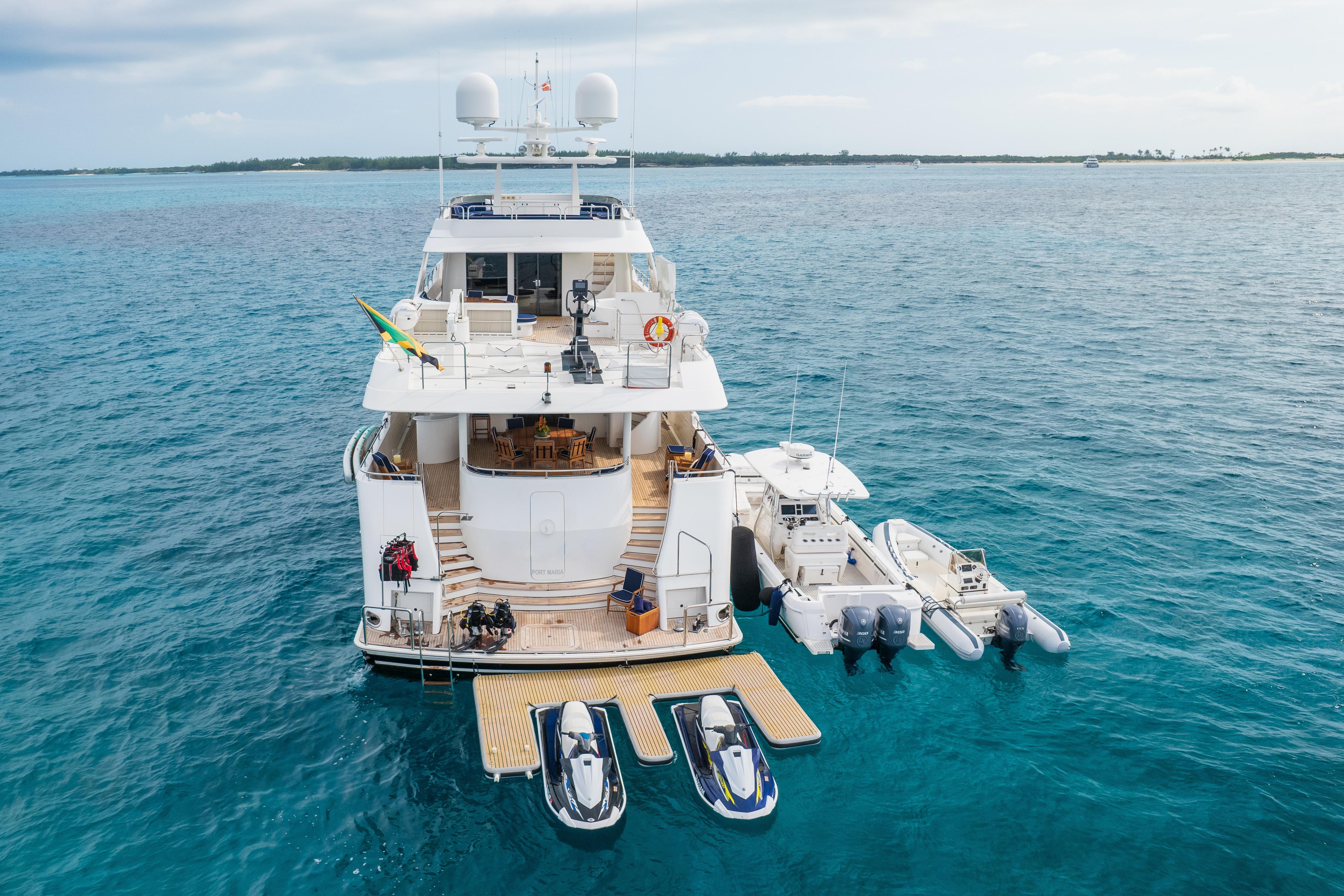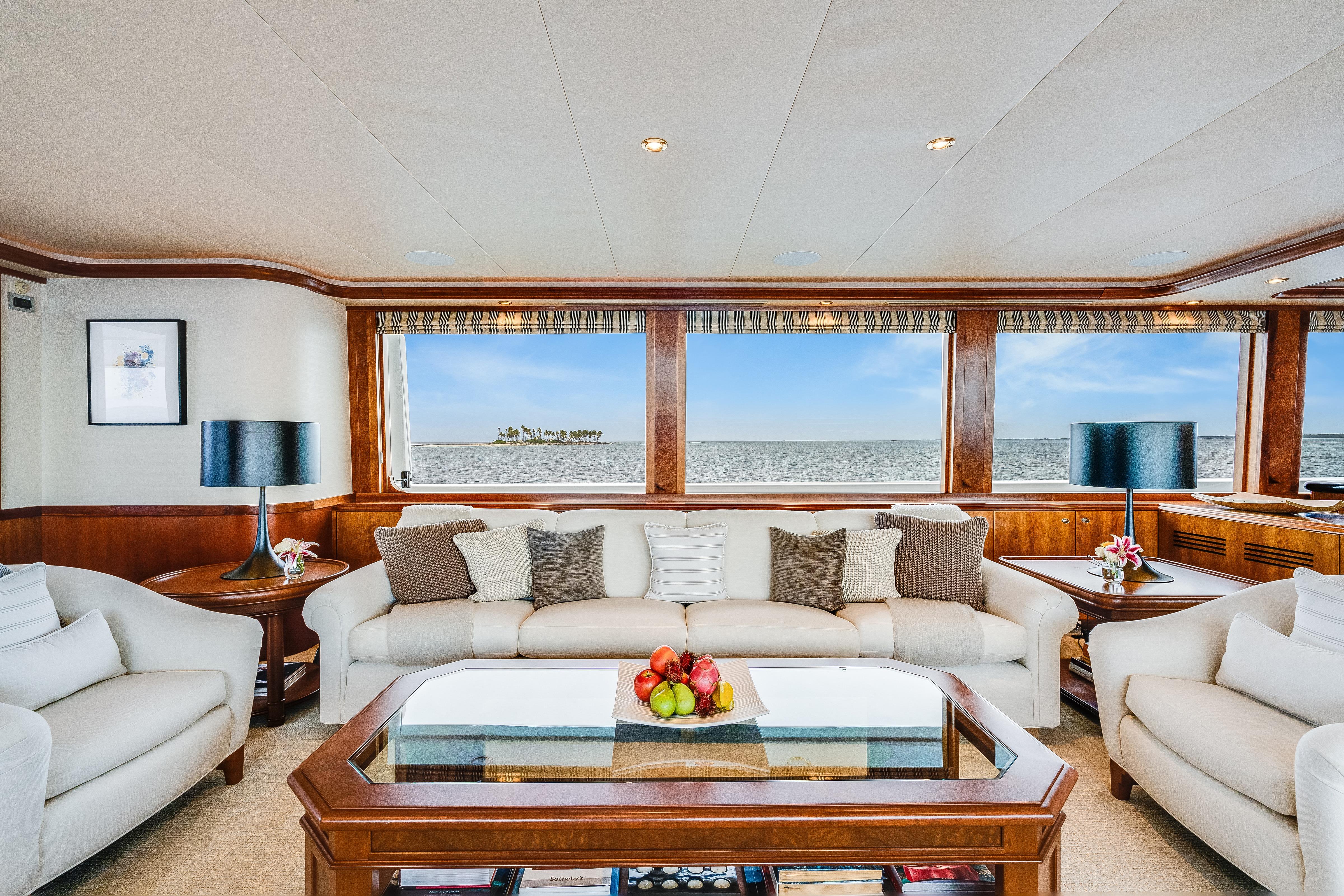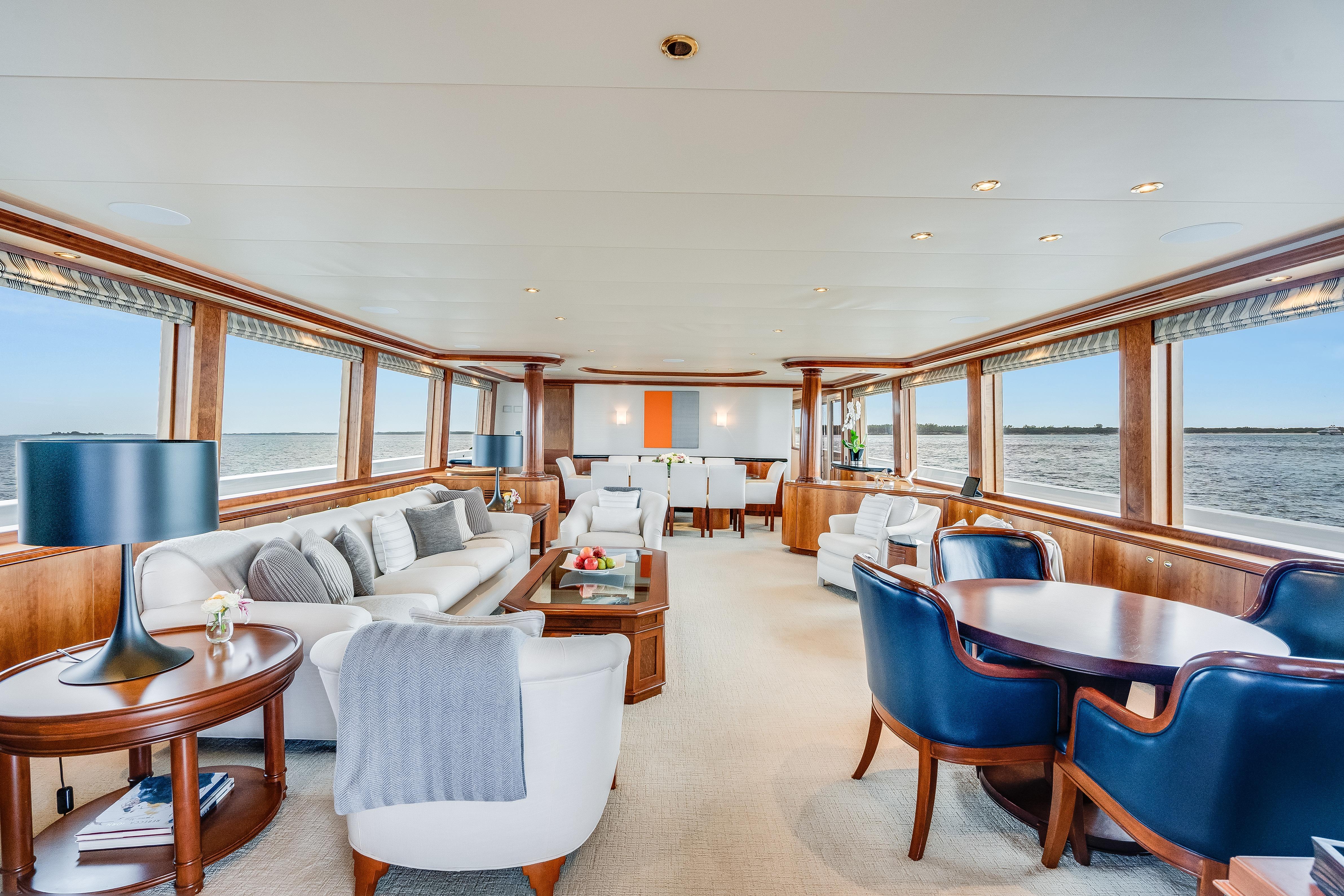 Her layout is designed for both comfort and entertainment, with a spacious main salon and separate dining area, a sky lounge with a games table and sit-up bar, and an expansive aft deck with circular dining, wet bar, and lounge seating. On the sundeck, guests can enjoy a Jacuzzi and sun pads with panoramic views.