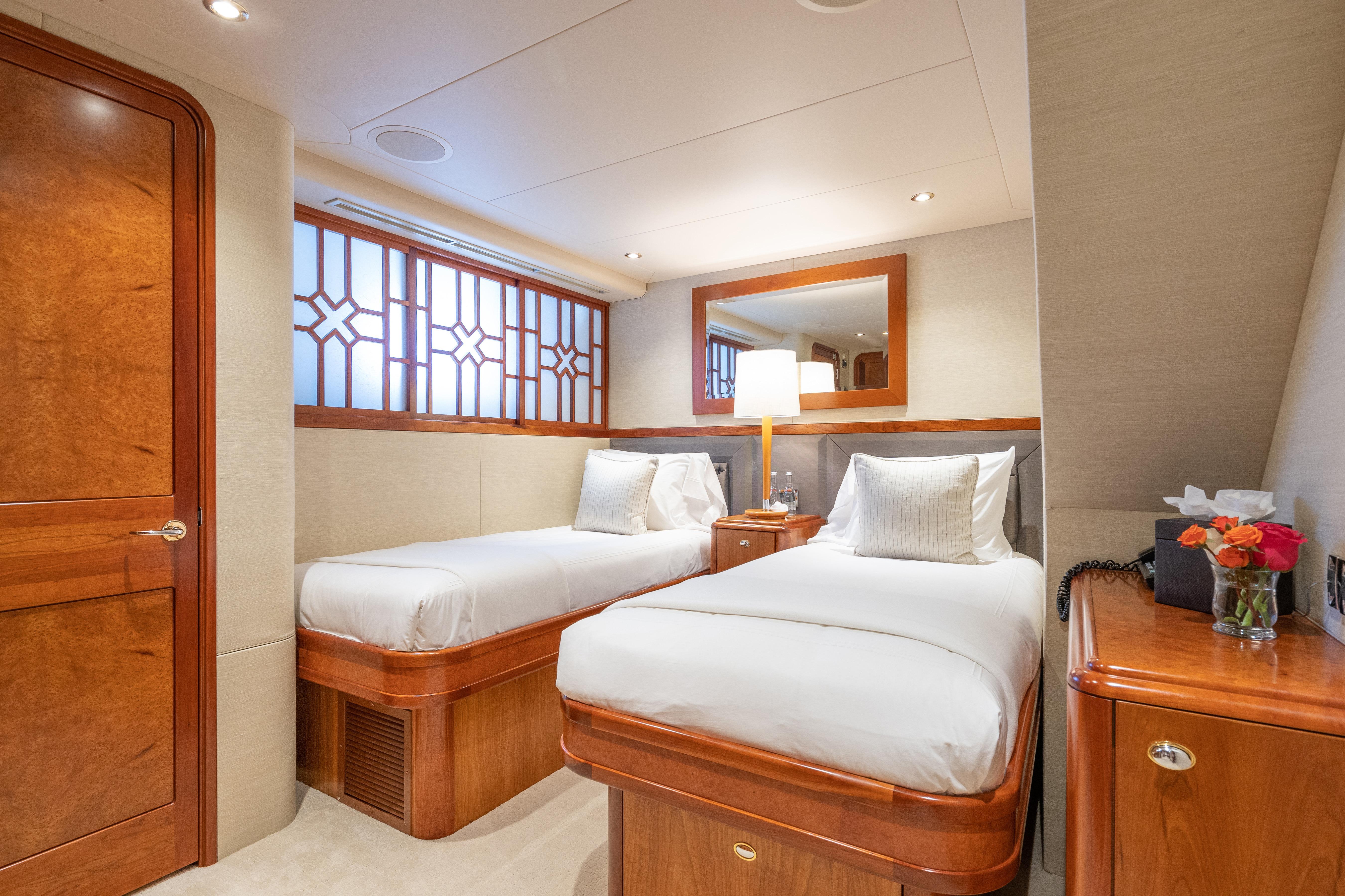 AVALINA accommodates 10 guests across five cabins, featuring a main deck master suite with queen bed and Jacuzzi tub, plus two doubles and two twins on the lower deck. Crew quarters allow for a team of seven. The cherry wood interior offers a warm and timeless aesthetic.