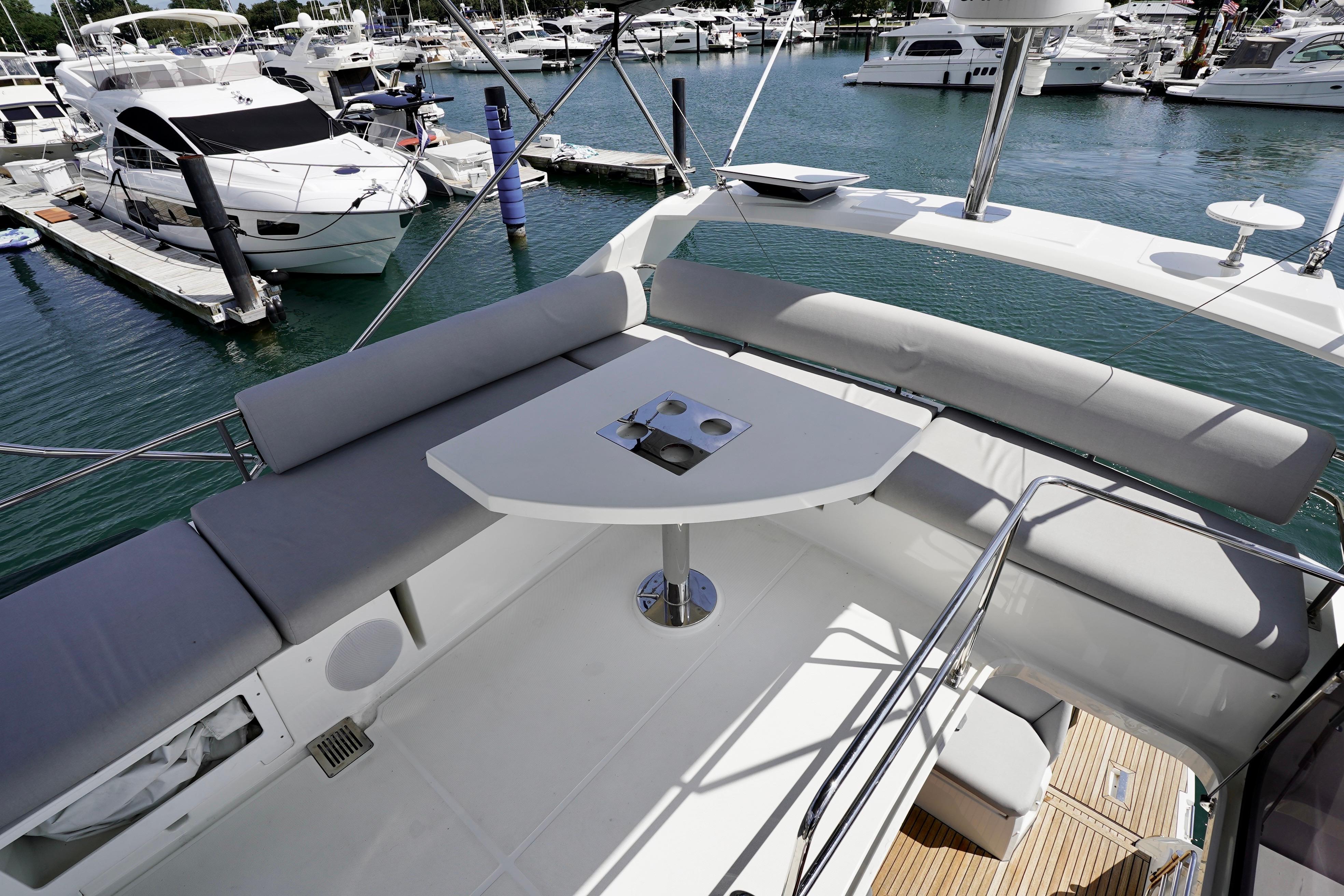 Wenge Interior Woodwork Brushed Wenge FlooringNorth American Package*Foredeck Sunpads with Adjustable Loungers*Teak Cockpit Table with Manual Hi-Lo*Main Deck Protective Covers for Exterior Cushions*2-Burner Cooktop*Miele Combo Microwave / Convection OvenMarlin Weiss Interior UpholsteryPrestige Luxury Package*Dishware, Flatware, Glassware Kit*Full Bedding in High-End Organic Cotton*Towel Sets in High-End Organic CottonElectronics Package*2x Axiom Multifunction Displays*1x Axiom Display on Flybridge*Autopilot for IPS plus Volvo Engine InterfaceBowers and Wilkens Sound PackageStern Mooring Cleats for Cross DockingFlybridge Protective CoversSoft Top Bimini on Flybridge with LED LightingBeach Club GalleyHydraulic Swim PlatformSunpad Cushion for Cockpit TableUnderwater Lights - BlueStern Docking Lights and SearchlightCentral Vacuum SystemUpgraded Tropical Air Conditioning / HeatingUpgraded Galley Countertops to Laminan StoneHi-Lo Table in Salon on Electric PedestalCarpeting in Both StateroomsPre-Install for TV'sFantom 18 RadarUSCG Safety Kit