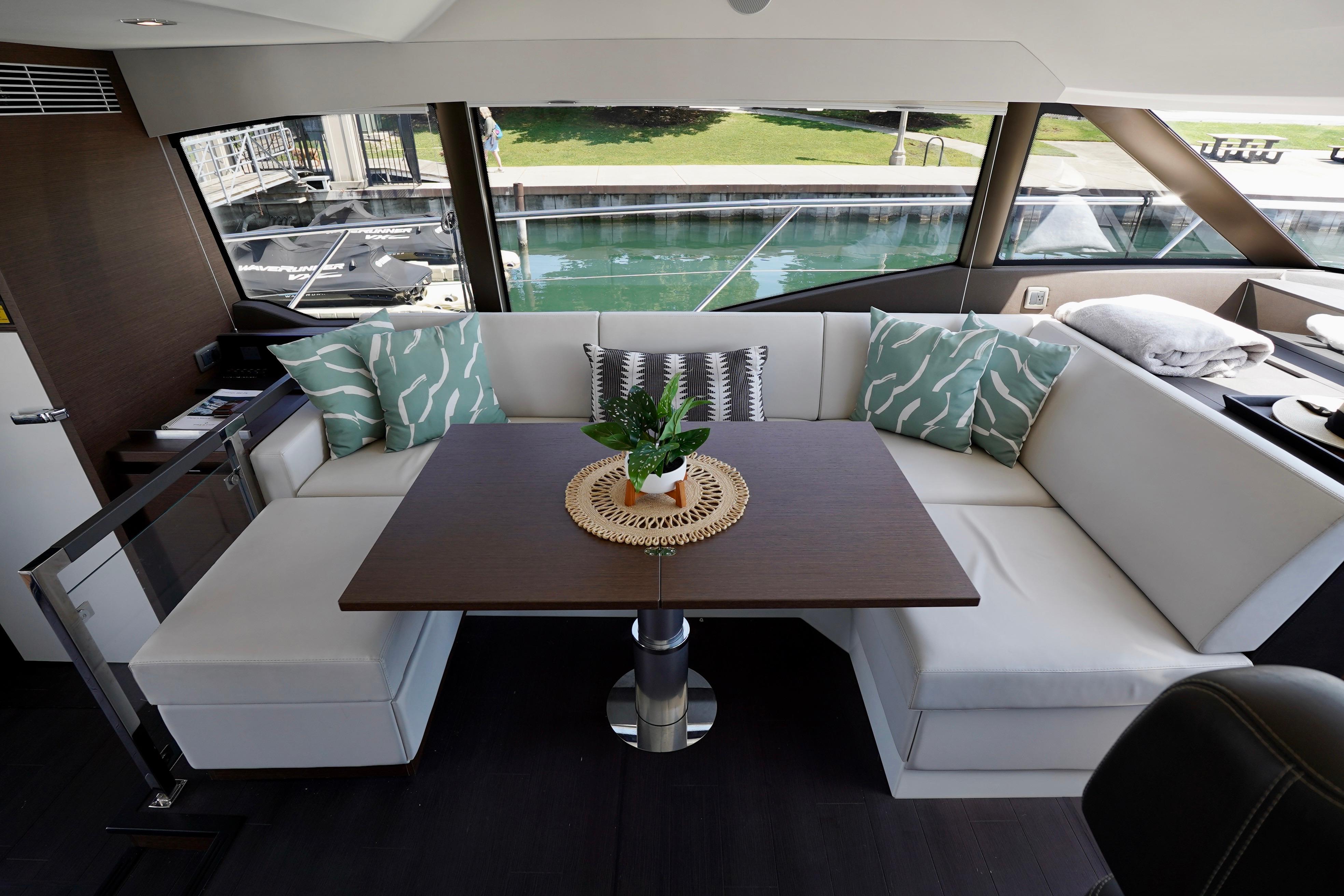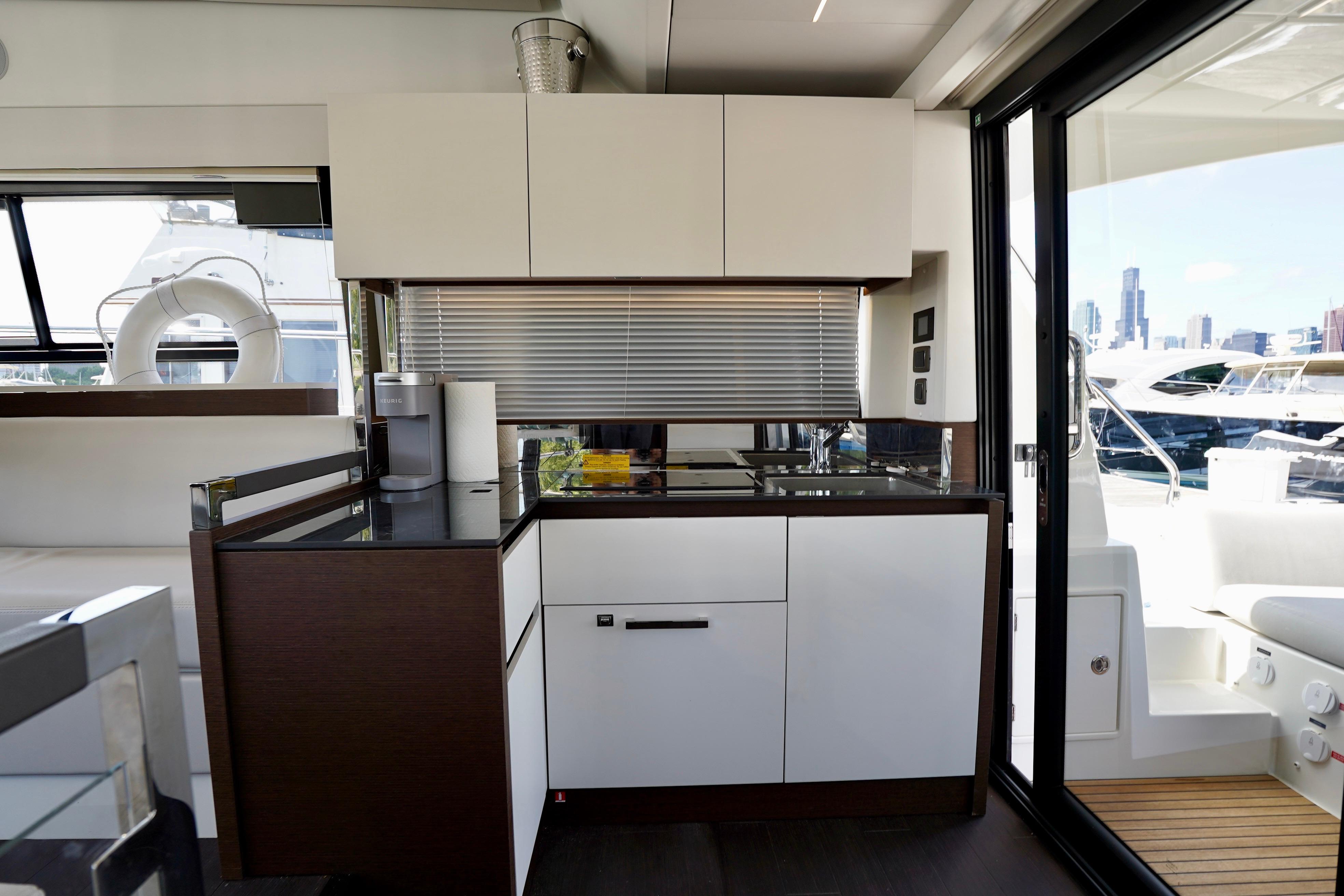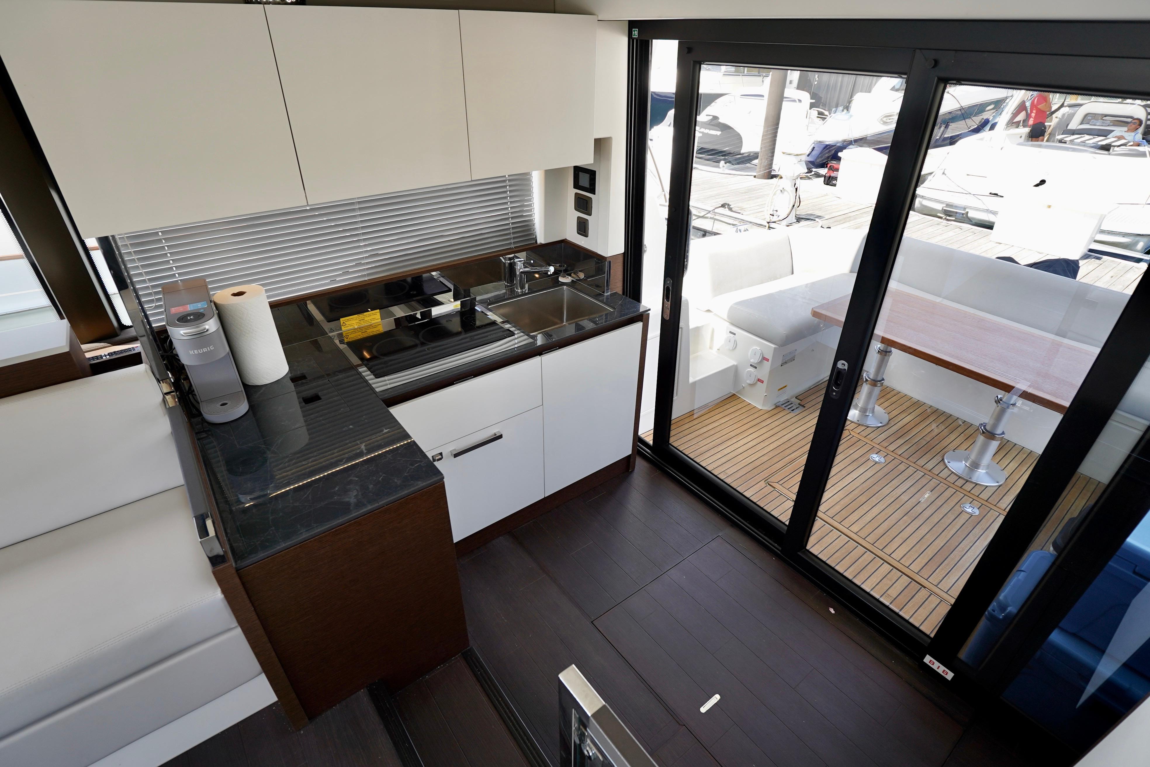 Upgraded Galley Package – premium appliances, ample storage, and seamless flow between salon and cockpit