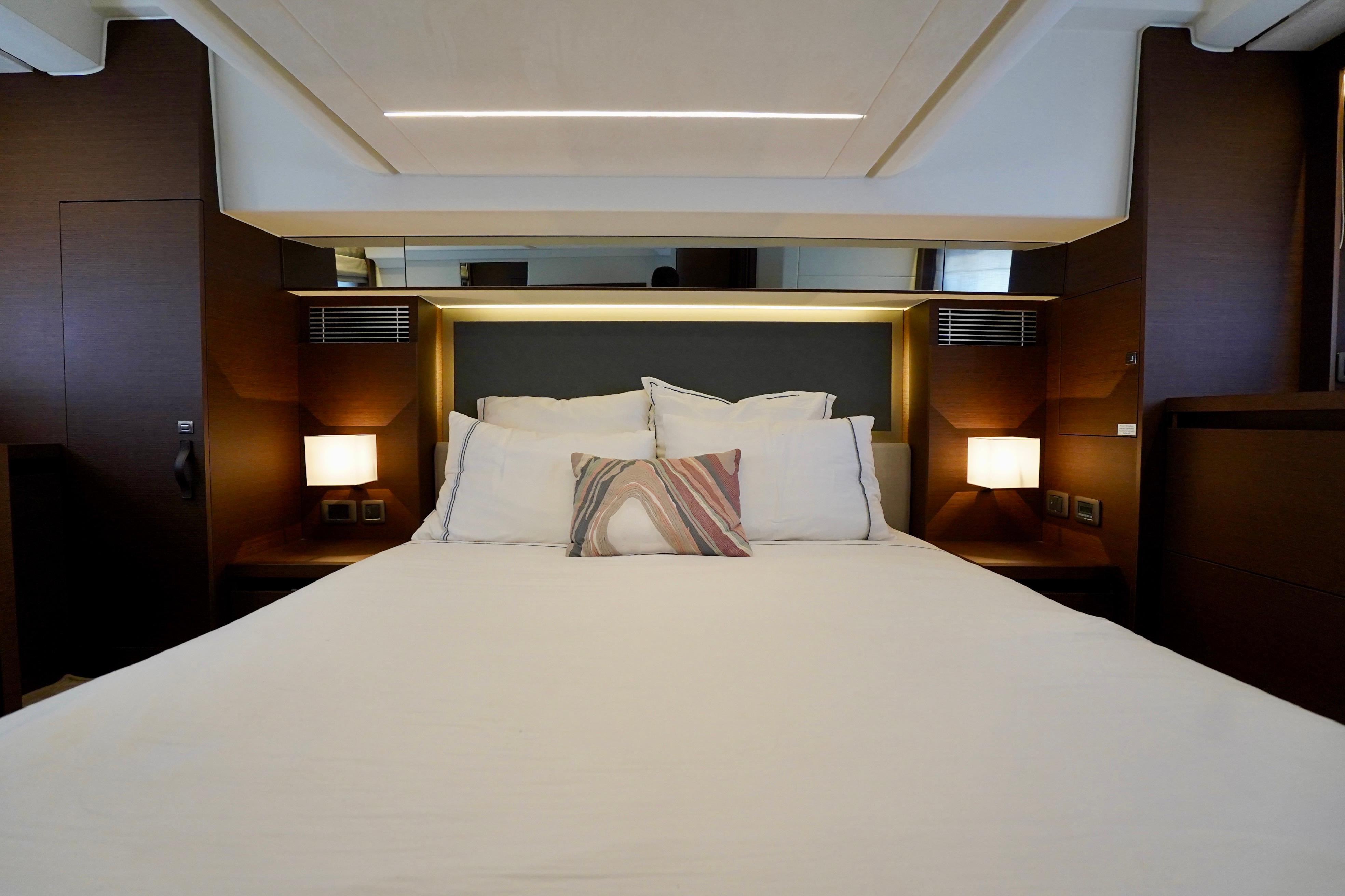Modern Interior – full-beam master stateroom with private ensuite, VIP forward, and bright salon with panoramic windows