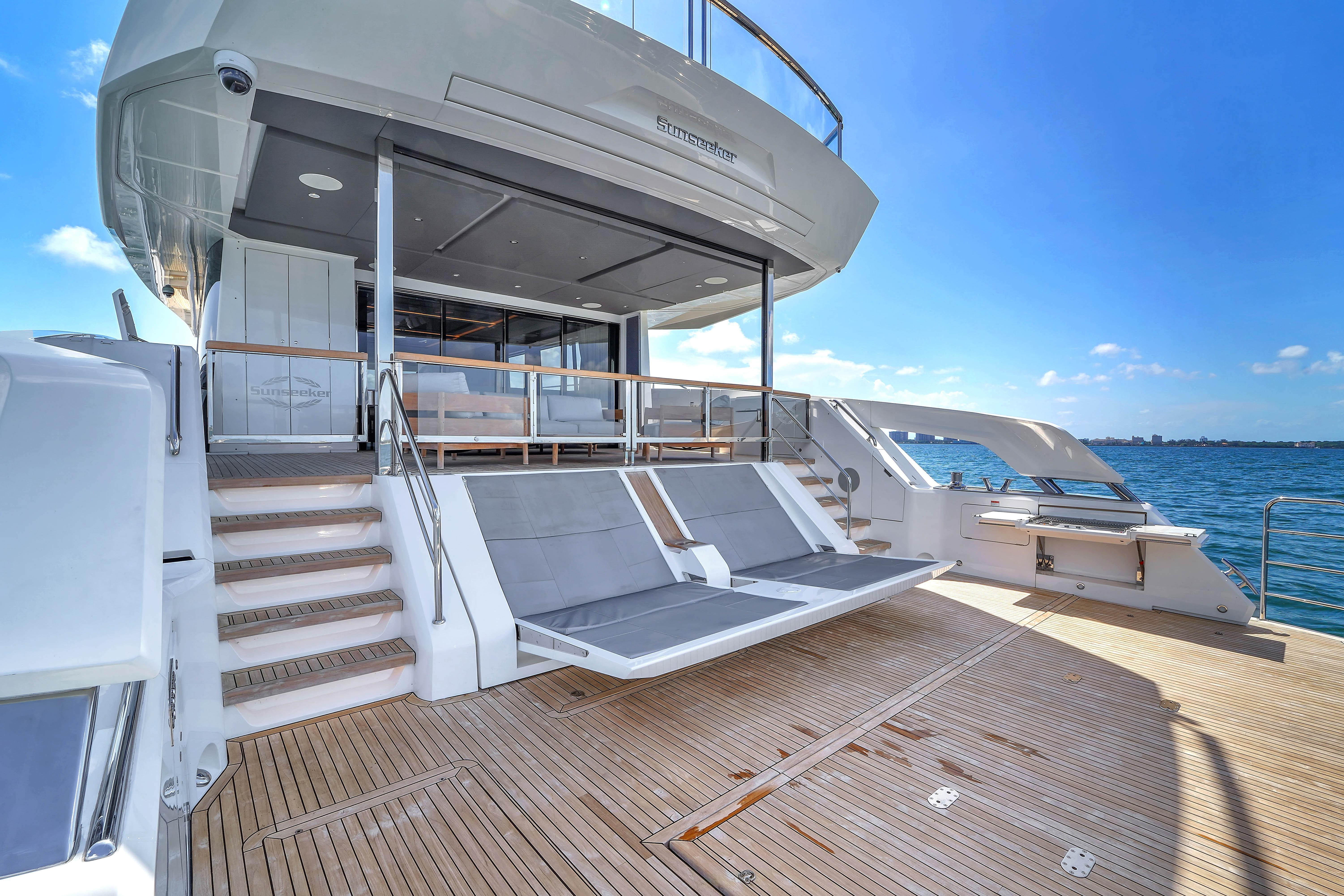 Expansive decks and a massive beach club invite effortless indoor–outdoor enjoyment, while new teak decks (being installed under warranty) ensure a pristine presentation. With an impressive range of 1,800 nautical miles and a top speed of 26 knots, she combines long-range cruising capability with the performance Sunseeker is known for.