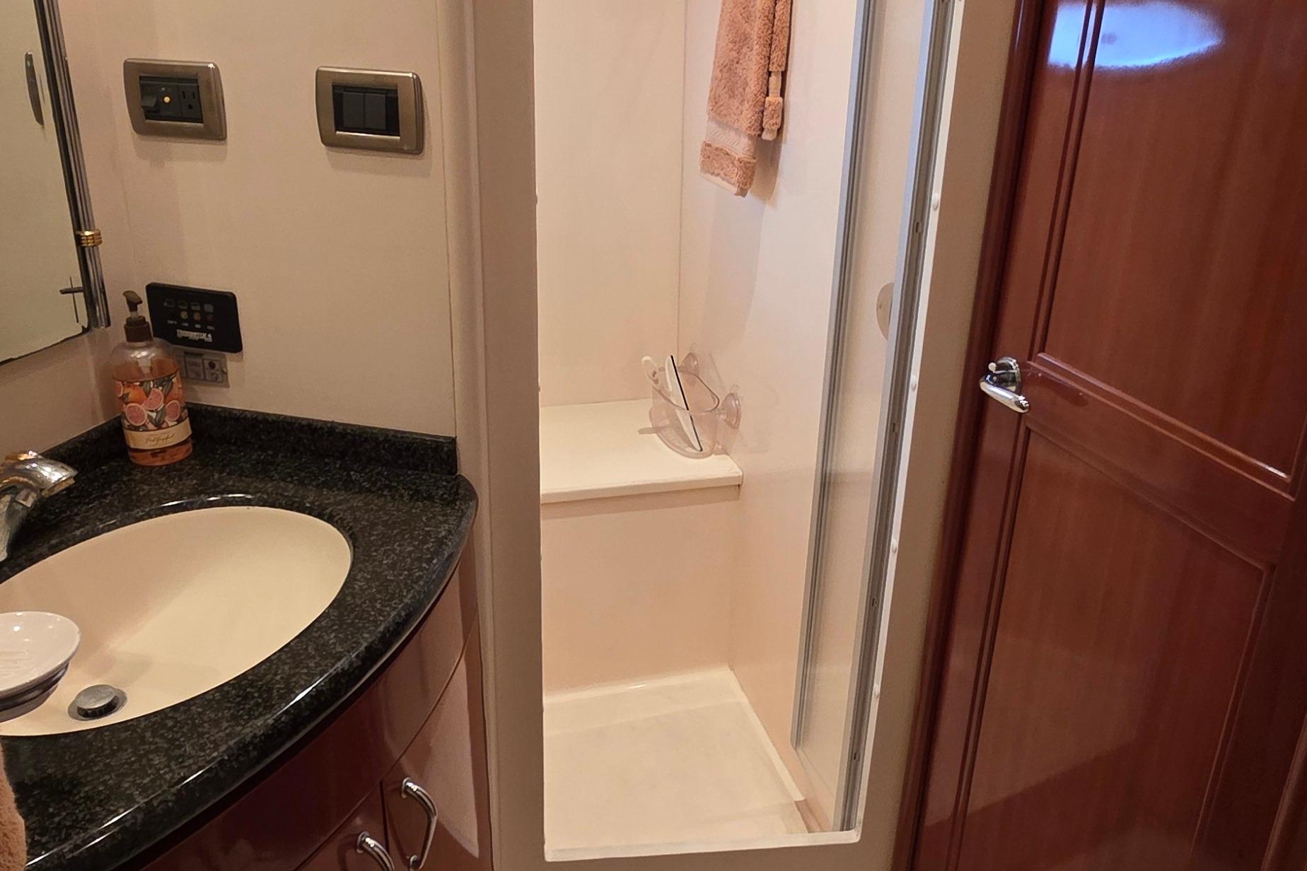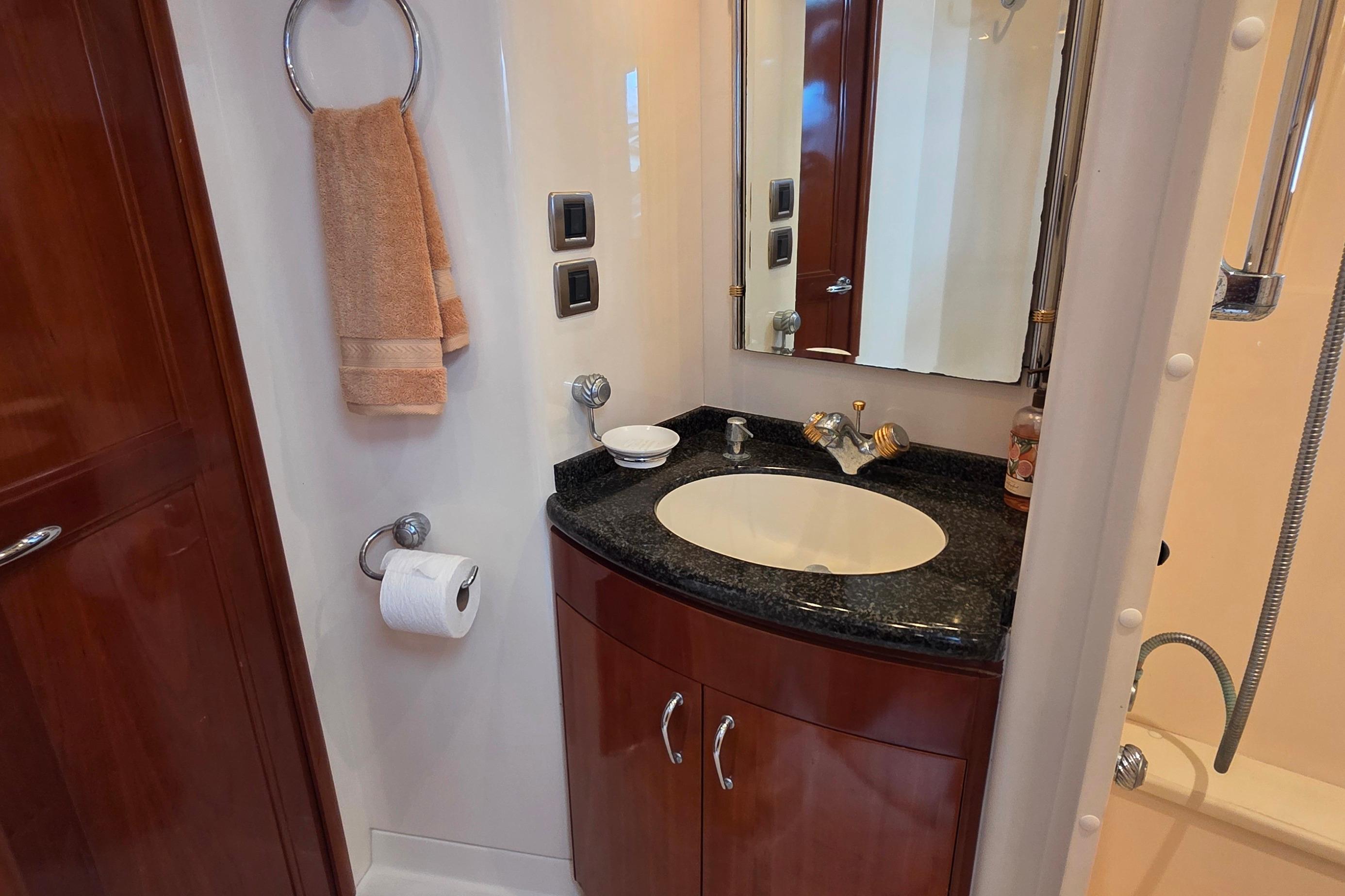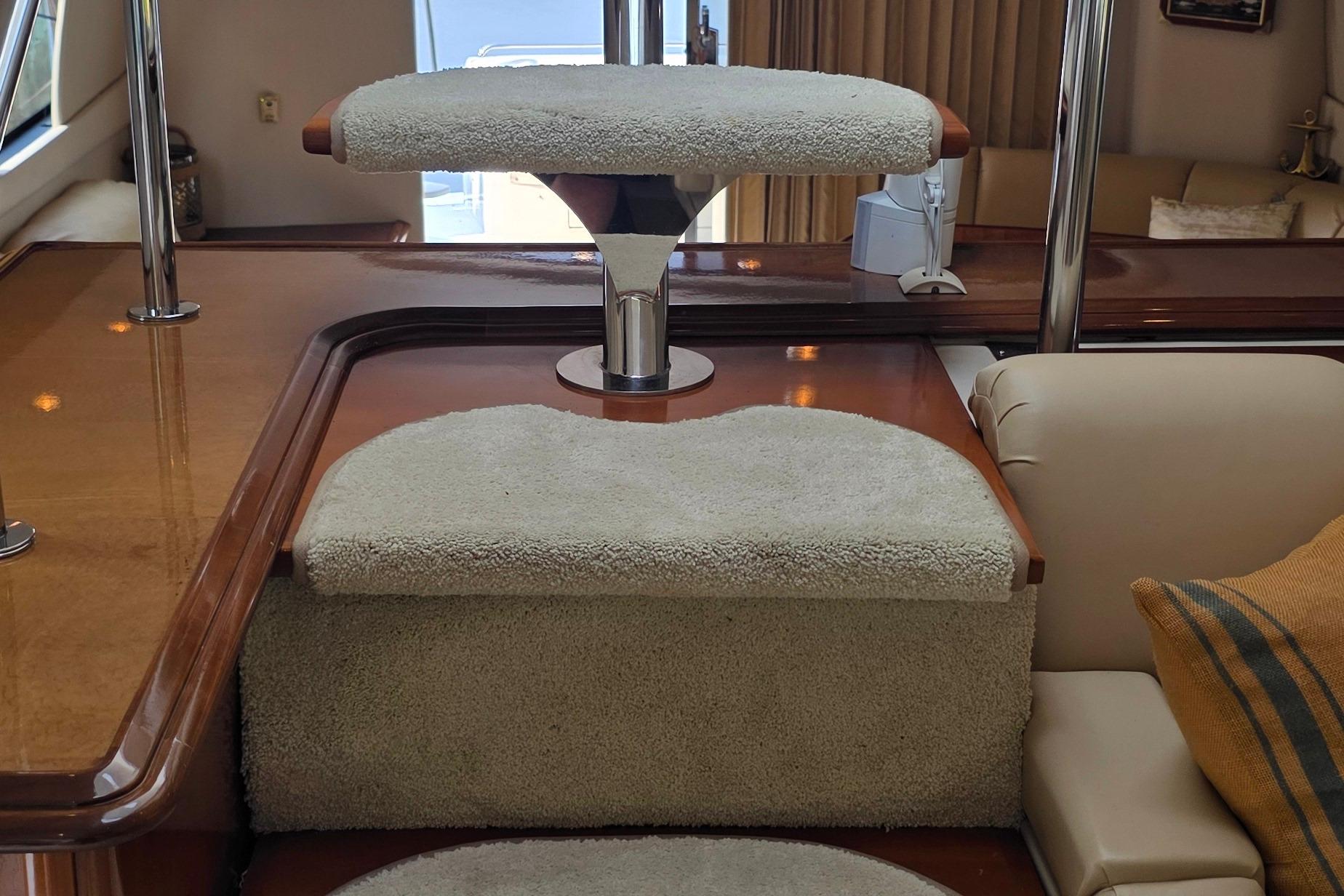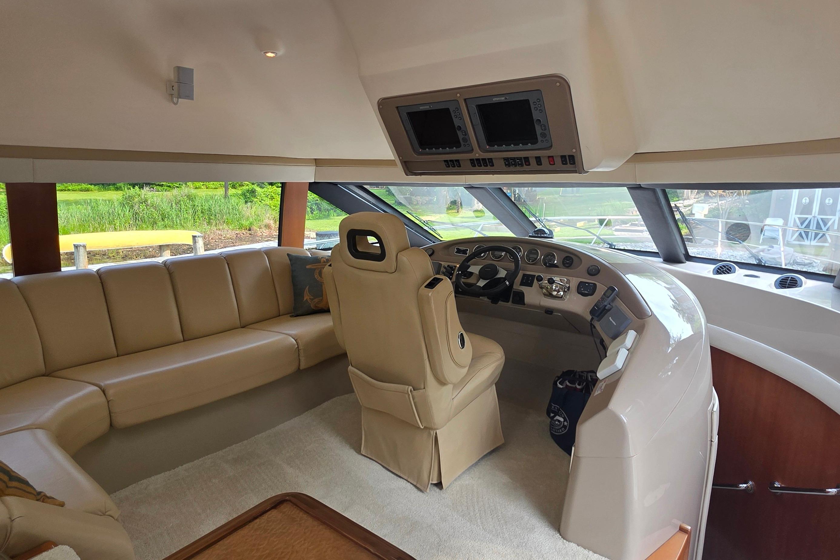 The lower pilothouse includes an L-shaped lounge, offering a comfortable command center. A large TV has been added to make this an additional social area as well. Navigation is supported by Raymarine electronics, including GPS and radar. Dual helm stations, one in the pilothouse and one on the flybridge, provide operational flexibility in various conditions.