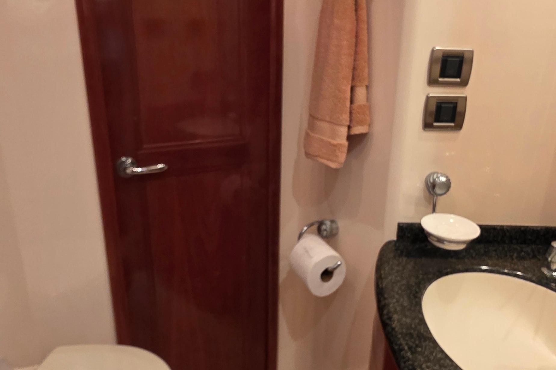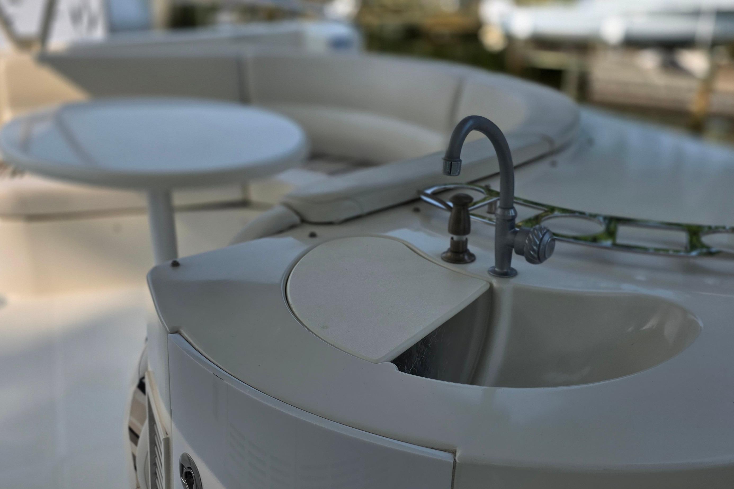 Up on the flybridge, a large social area awaits. This deck features ample seating, a wet bar, and a grill, creating a perfect spot for enjoying open-air views and entertaining. The bridge is topped with a hardtop and includes a full enclosure, providing excellent weather protection, and air-conditioning to extend your boating season.
