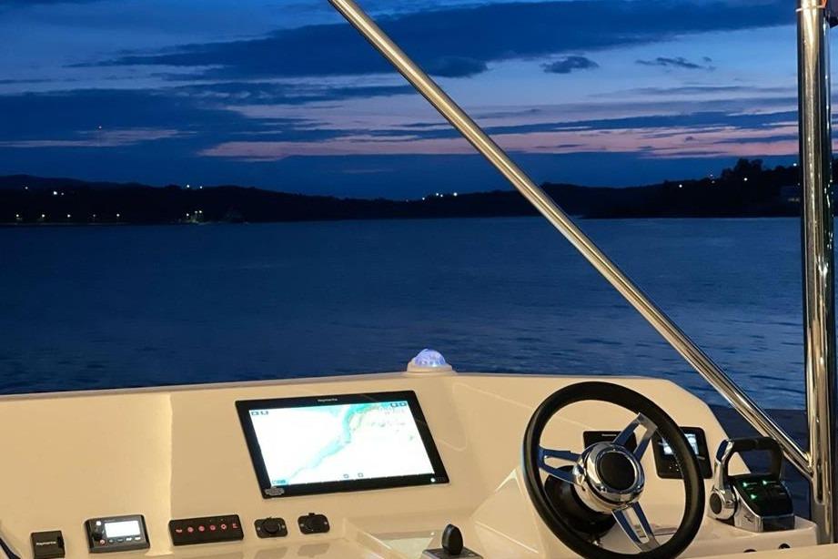 The flybridge provides a well-thought-out helm station with great visibility. Spacious seating and a large table allow for a great place to entertain family and friends and enjoy a meal with spectacular views.