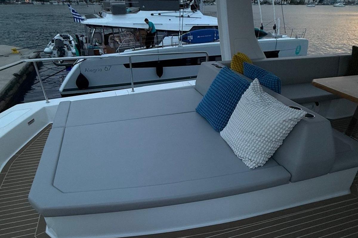 The saloon offers large, panoramic windows, an L-shaped lounge to port and a 2-person settee to starboard with an option to add an interior navigation station. The flow is seamless with access to foredeck through the forward saloon door.