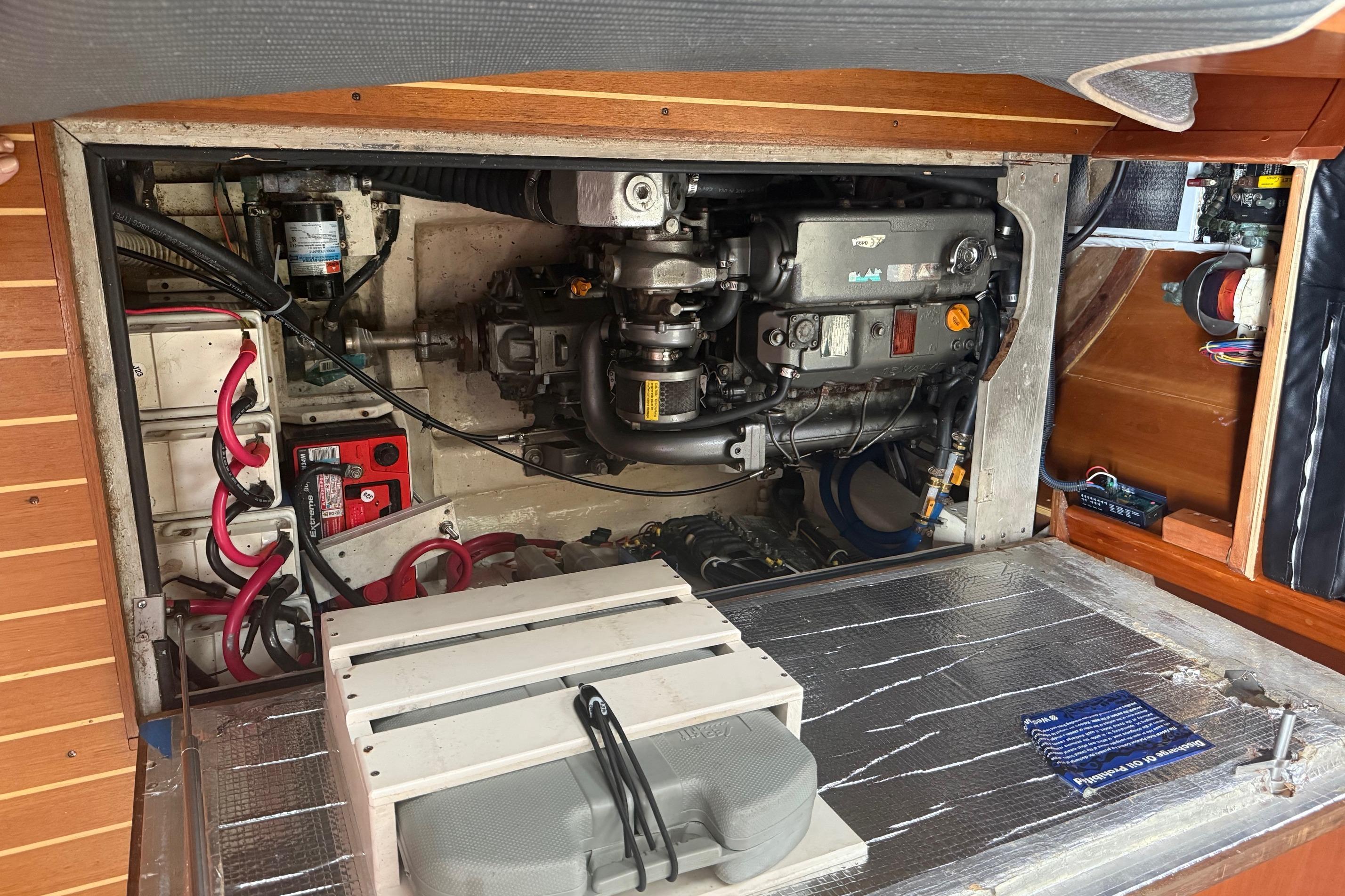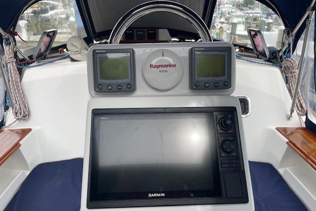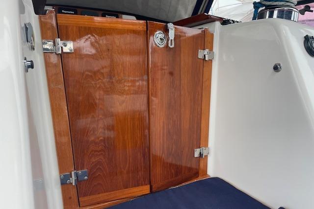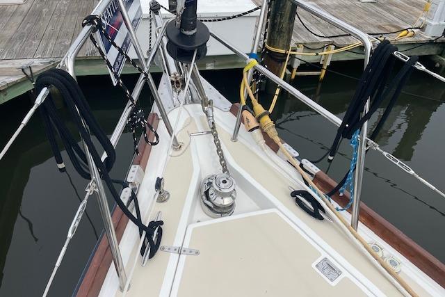 Walk through access to the cockpit is made possible by an opening transom. The cockpit is comfortable with plenty of seating and a fold up table. High gloss varnished combing pads add a nice touch to the cockpit. A well situated custom arch supplies support to the davits, solar array and the exterior navigation gear. In the cockpit is a large sail locker, on the bow is another deck storage locker with access to the rode chain and windlass system.