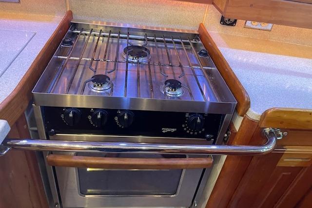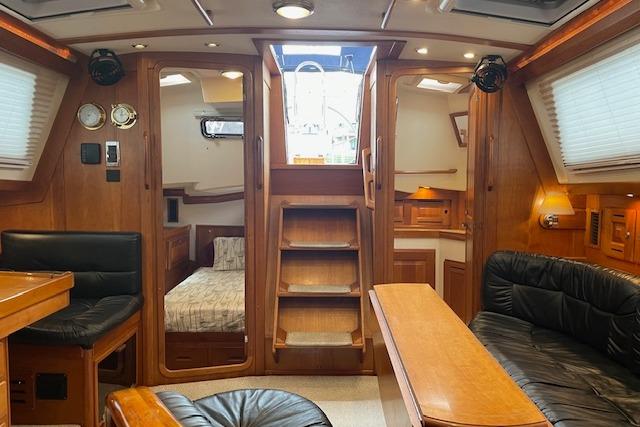 The Tartan 4400 has a well lit raised salon layout with two queen bunks, one forward and one aft. The boat has ample storage and two full heads. Through out the interior is beautiful cherry joinery and the lockers and cupboards though out the boat have solid cherry raised panel doors. The interior wood is protected by a glowing satin varnish. The forward cabin has a centerline queen with private access to the forward head, which has its own enclosed shower stall. In the Salon is a oval shaped table with a large wrap around sate. The navigation station sits to starboard in the salon and has with ample drawers and storage space. The navigation equipment and ships panel are located within easy reach of the comfortable built in Navigation seat. On the starboard side aft is a comfortable cabin with plenty of storage and a queen size berth. To port is the aft head. Carpet is easy to remove and covers the beautiful teak and holly cabin sole.