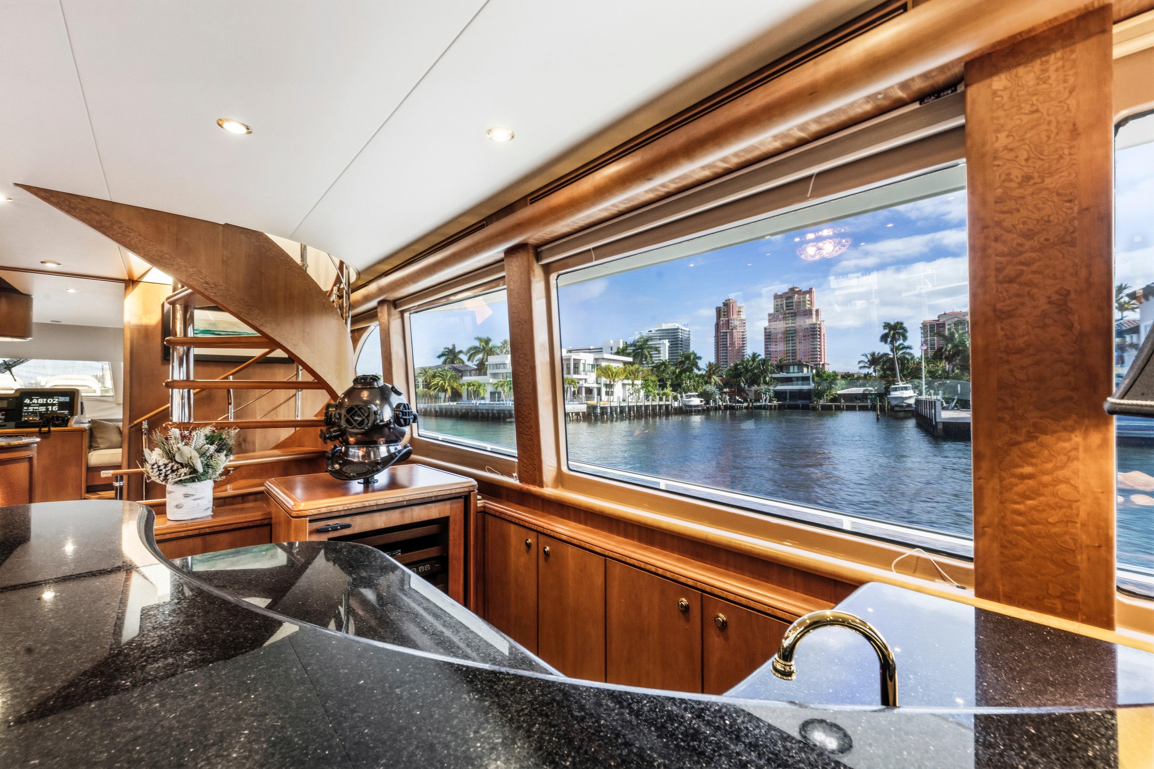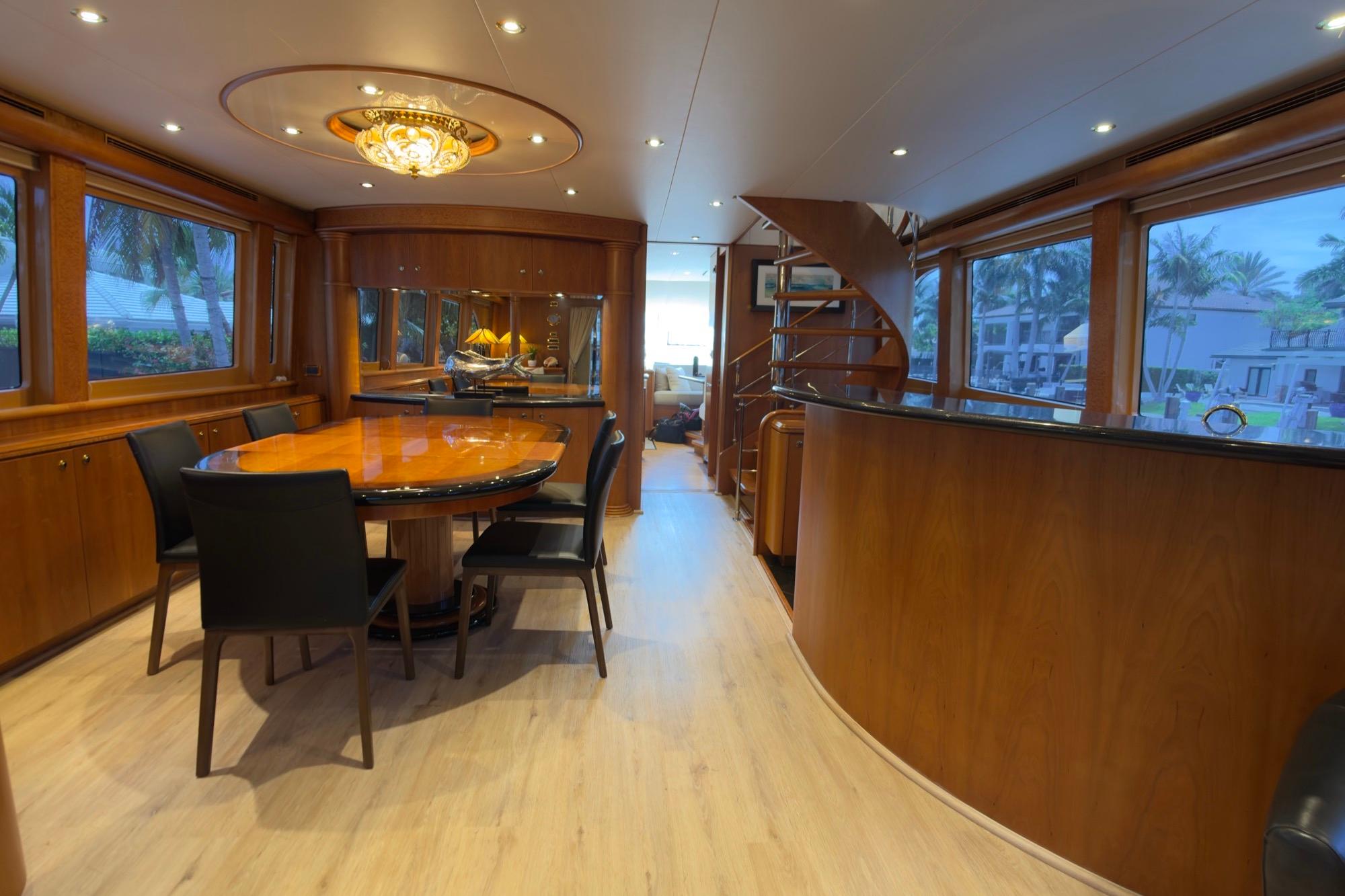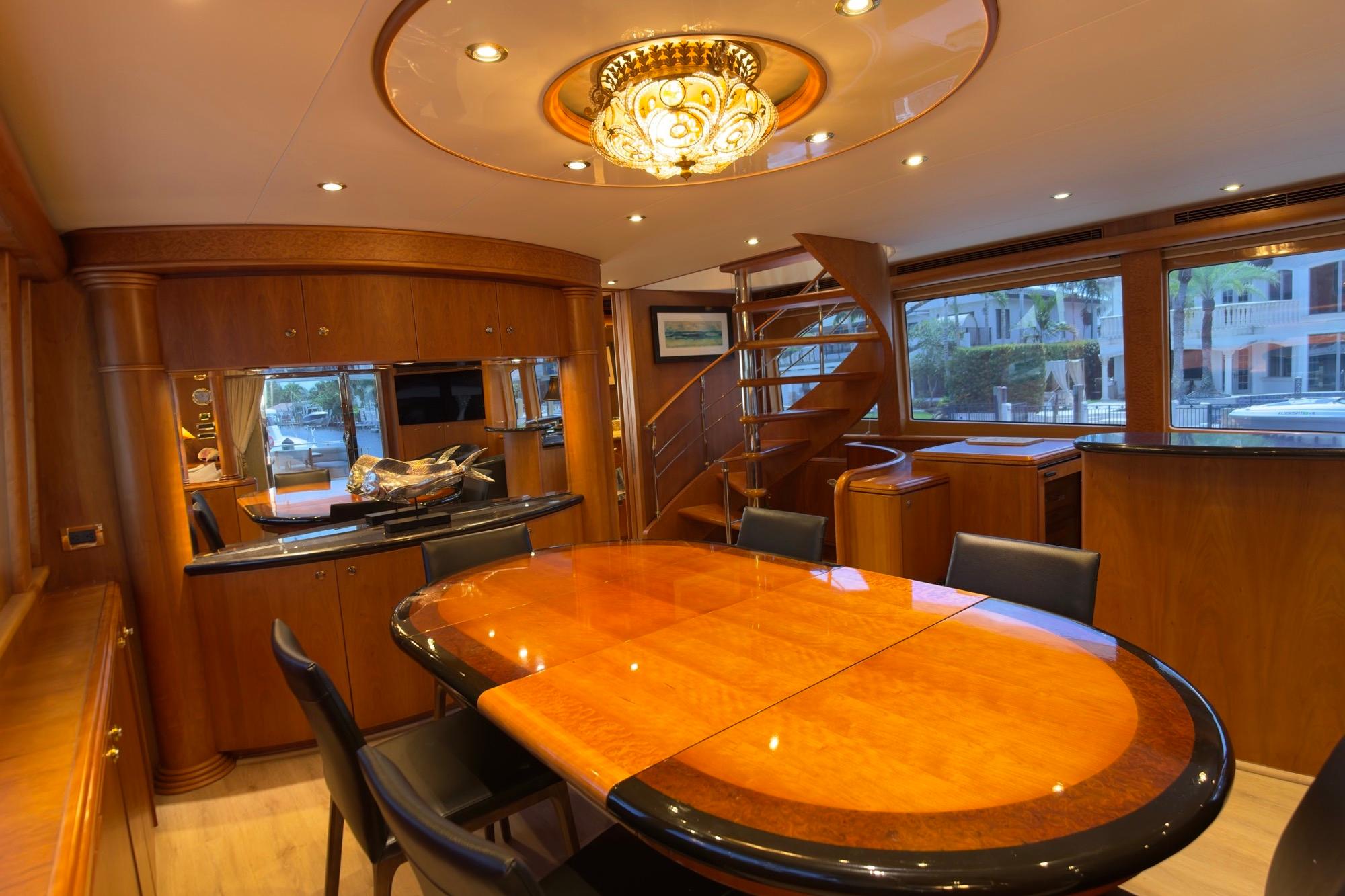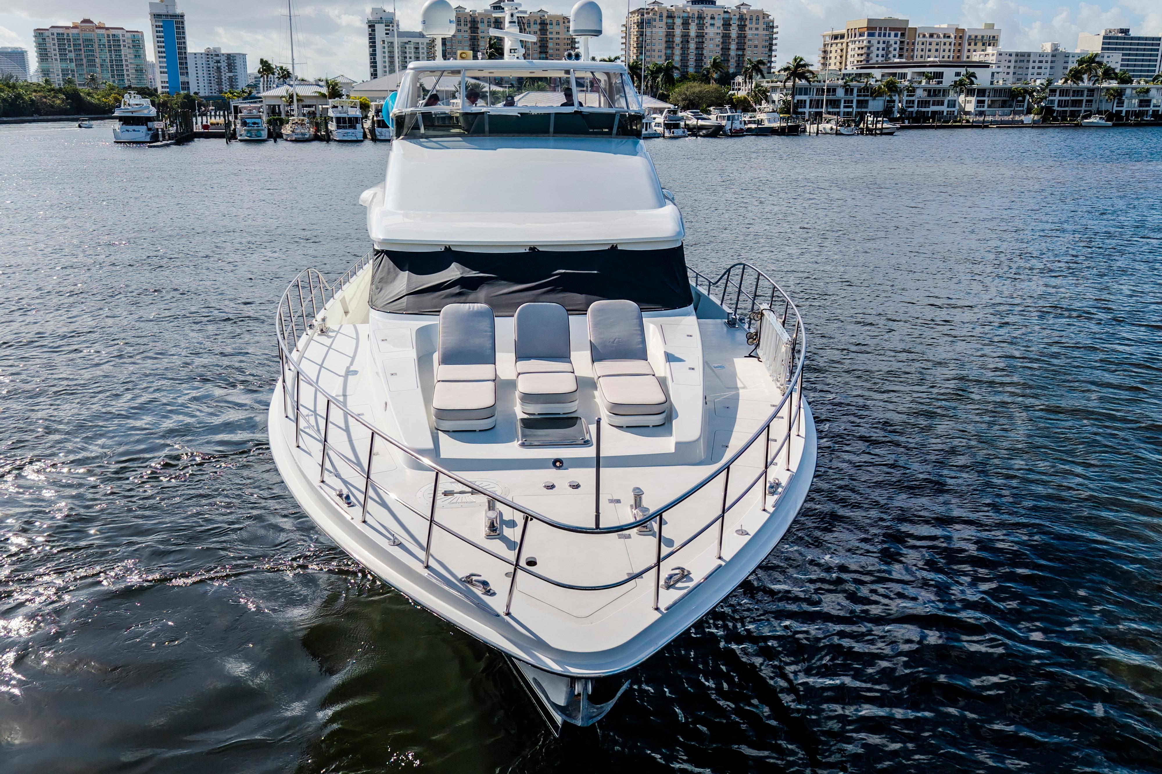 The layout offers four staterooms plus crew quarters, providing generous accommodations for extended cruising. The interior is spacious and finished with a custom millwork package. A removable hardtop can be secured on the bow in a matter of hours when needed.