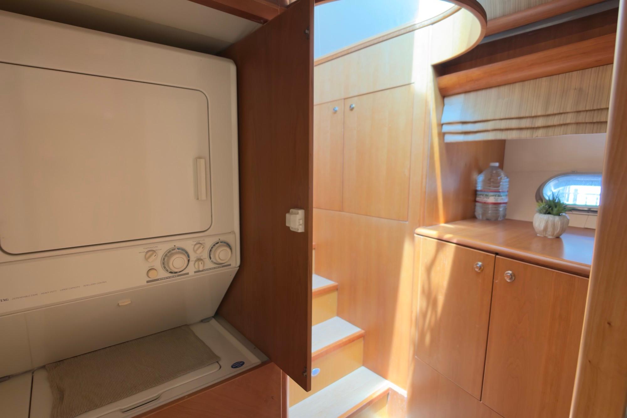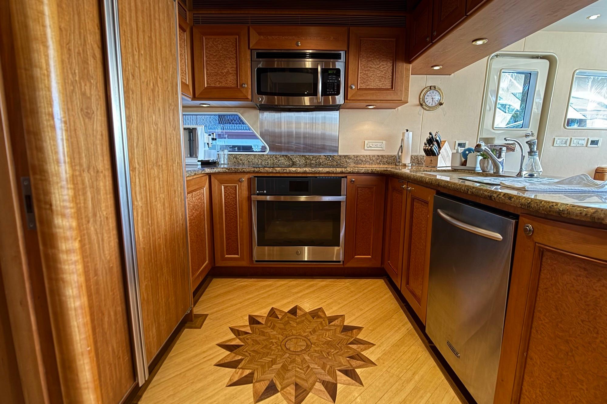 The country-style galley sits just forward of the main salon. It functions like a true home kitchen, with ample workspace for prep and service and a thoughtful layout. Full-size, commercial-grade appliances complete the package.Upgraded granite counter tops and backsplash