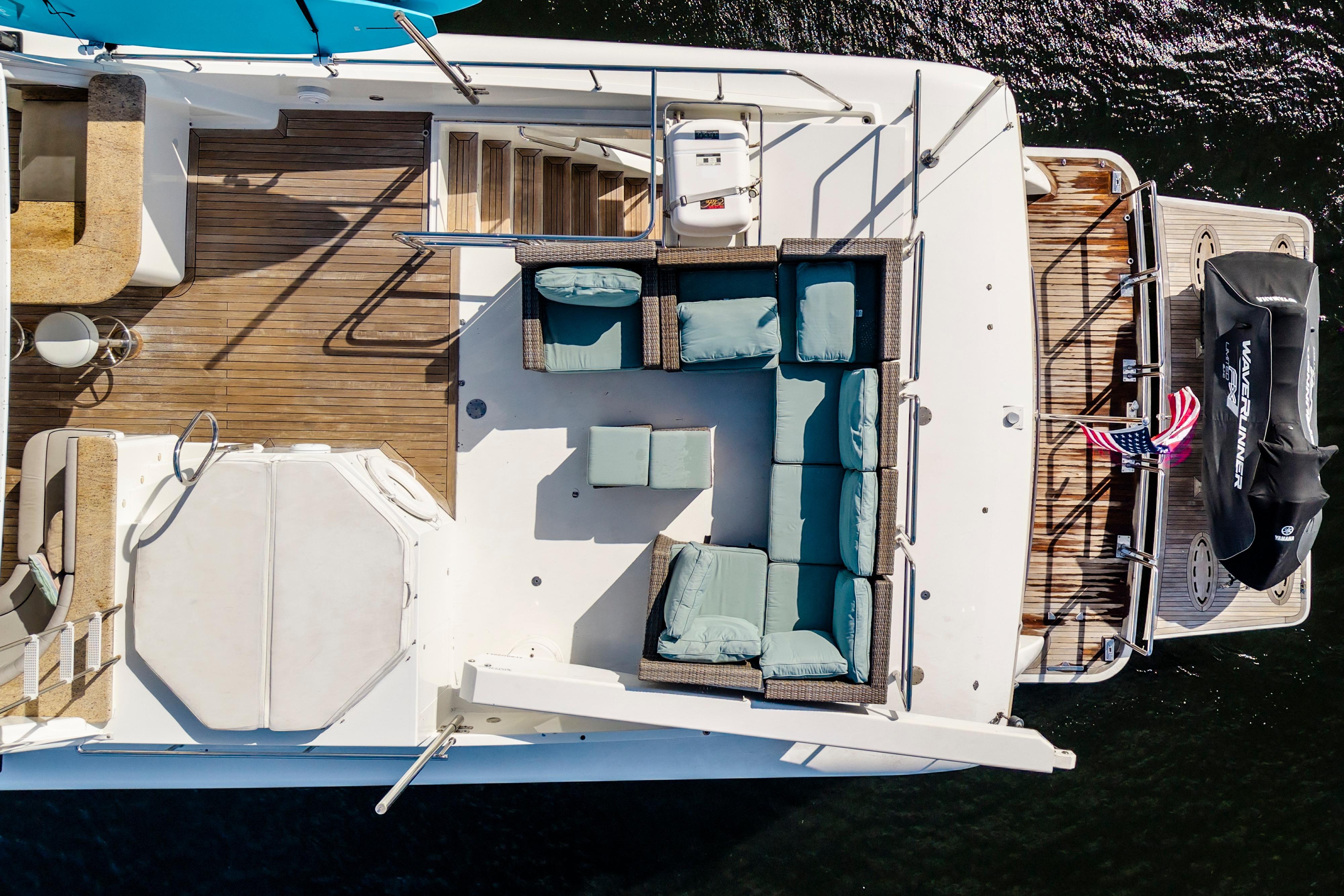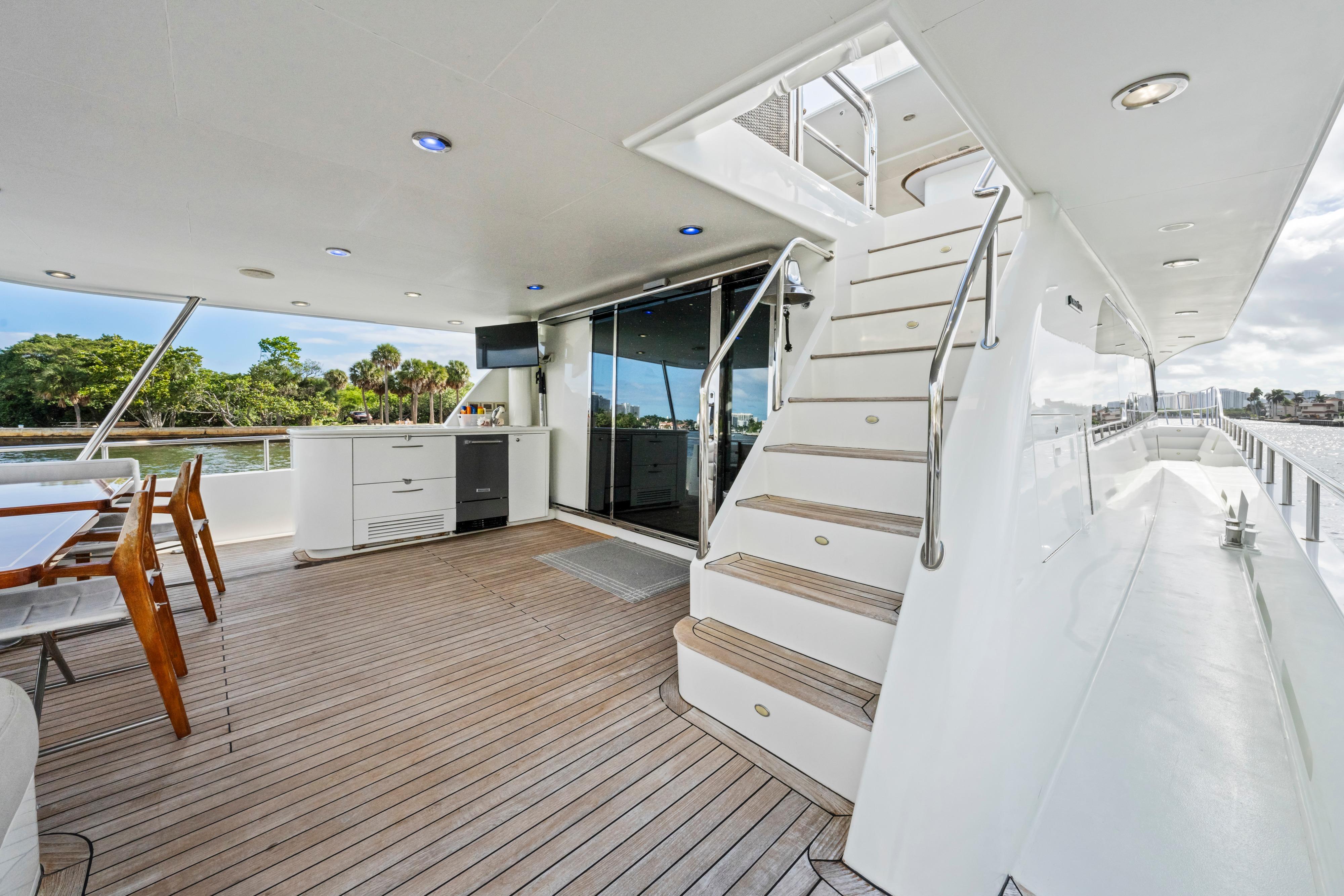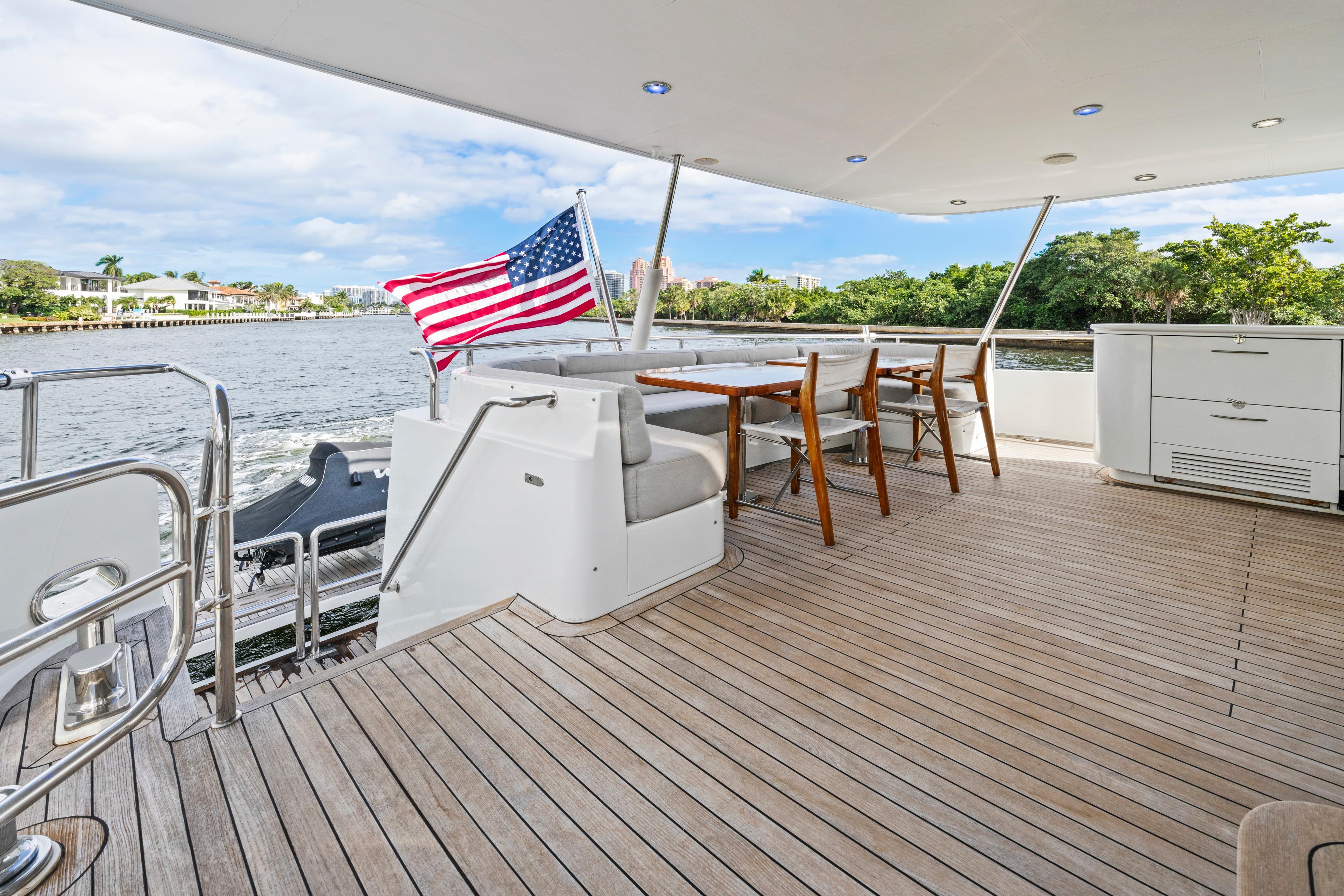 The flybridge is expansive, with large entertaining and seating areas. A hydraulic swim platform carries the tender.