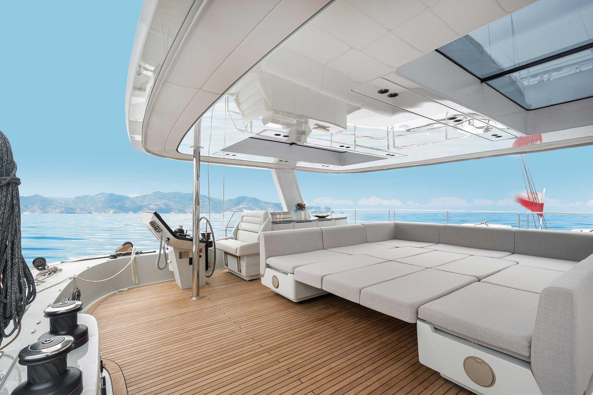 The flybridge houses the main helm station, big sunpads, a bar with barbecue, as well as a height-adjustable dining table which can be levelled with the U-shaped settee to extend the lounging space. Inside the aft cockpit, guests enjoy a full-beam relaxation area equipped with a large dining table, a fridge and ice maker, a sofa, and sunpads.