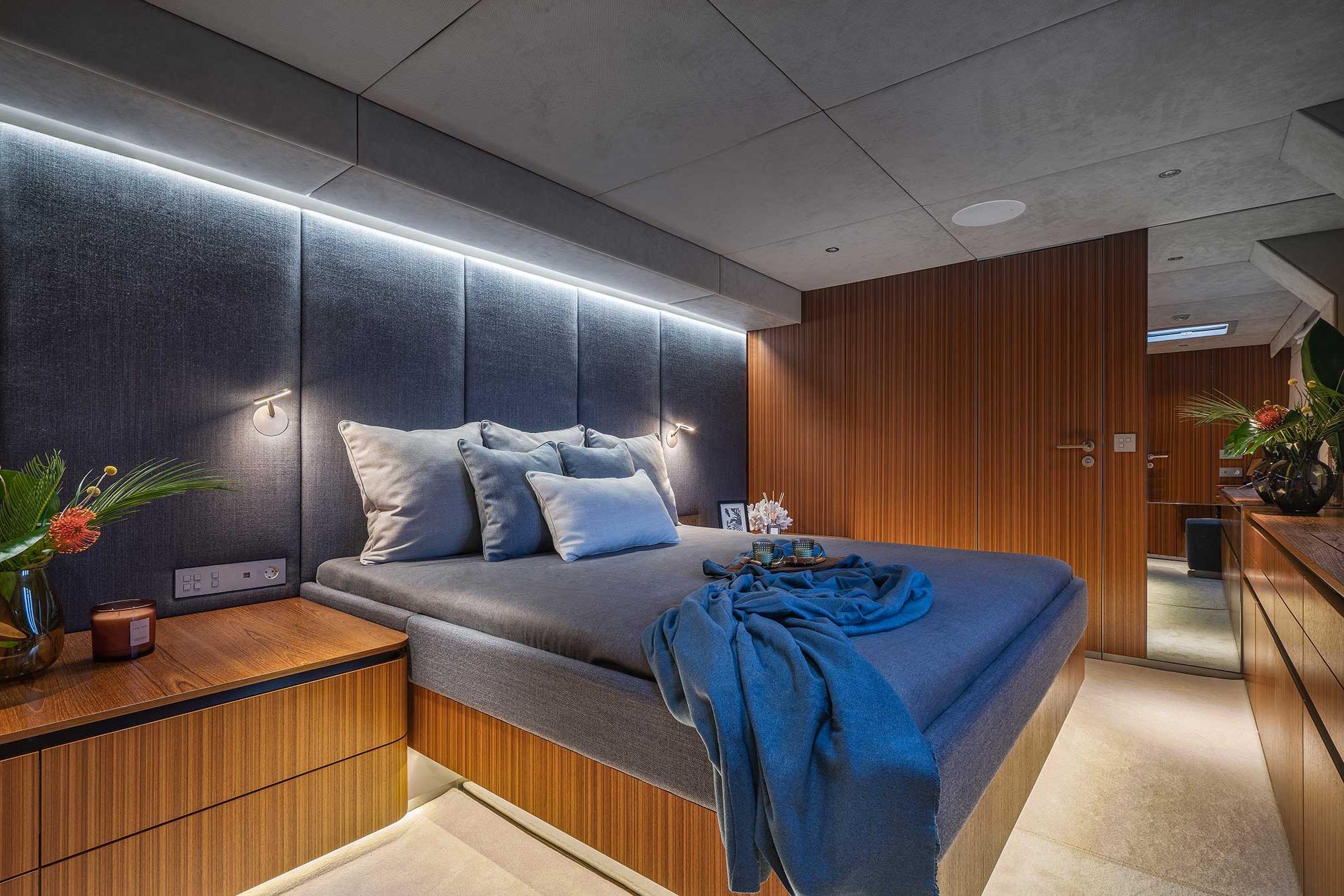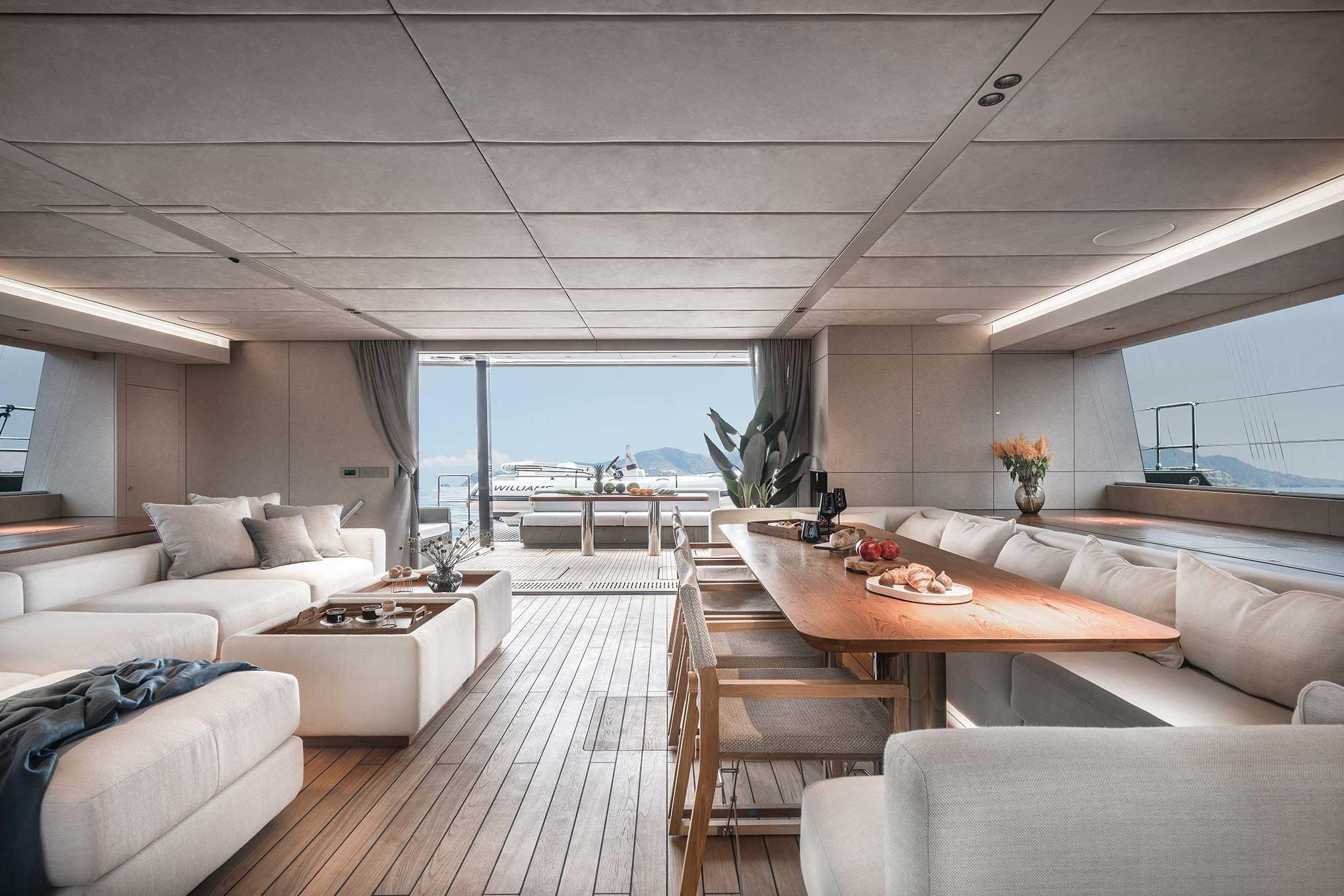The sailing yacht’s main deck saloon offers plenty of lounging and dining space with two oversized sofas, a big dining table, and easy access to the wine cooler and fridge. To the bow, the automatic door opens onto the large bow terrace, featuring a sunken lounging spot perfect for basking in the sun.
