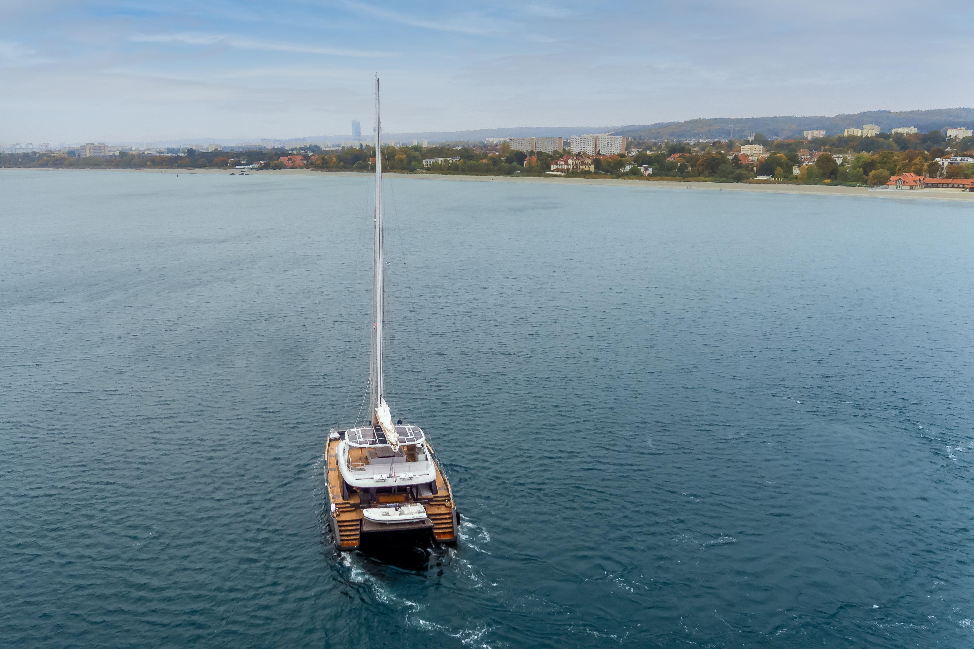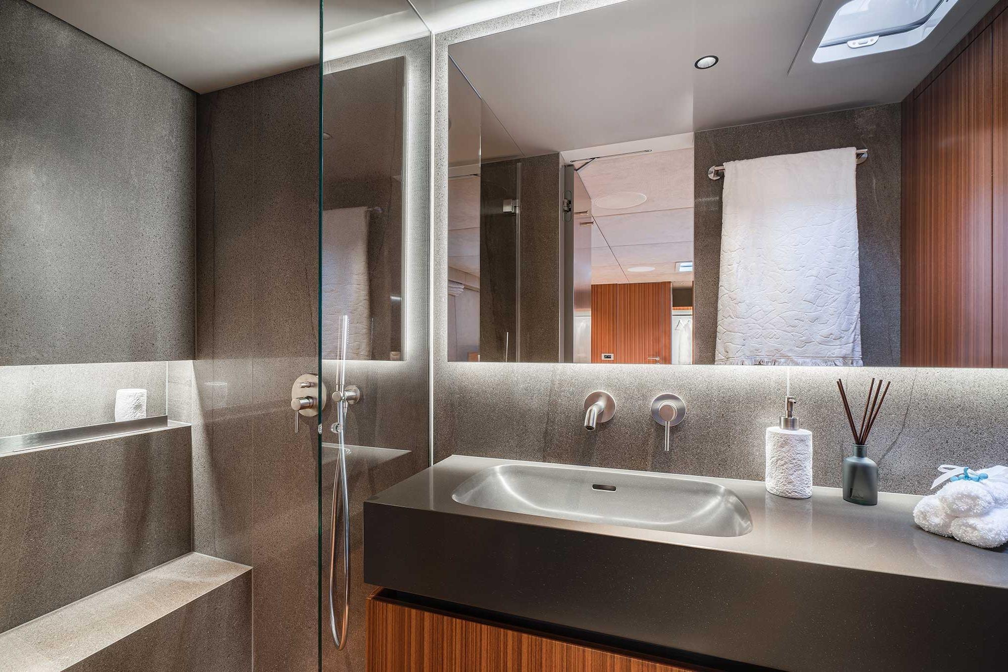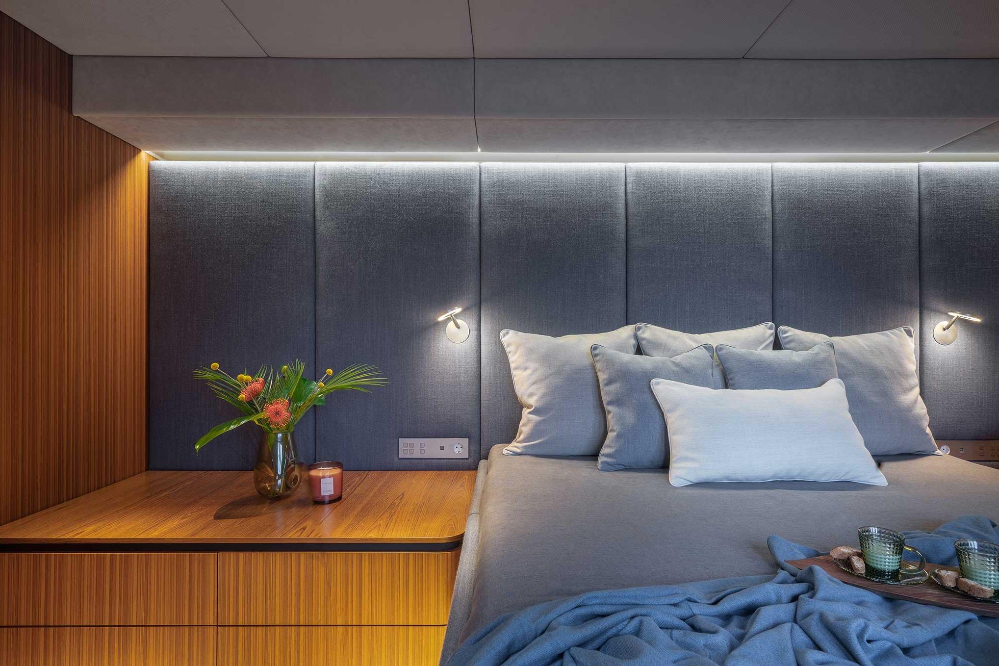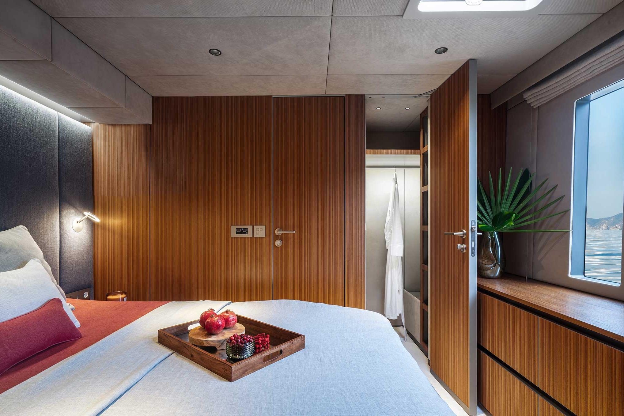 The Sunreef 70 Candy accommodates up to eight guests on board in all luxury amongst her four-cabin layout. Located in the central part of the port hull, Candy’s master suite is fitted with a king-size bed, a pop-up tv, a vanity desk, and a walk-in dressing. The remaining three guest cabins also offer a supreme level of comfort, ample storage, and beautifully appointed bathrooms.