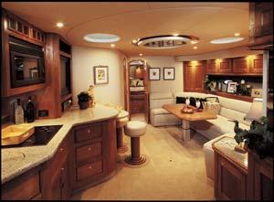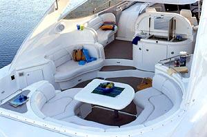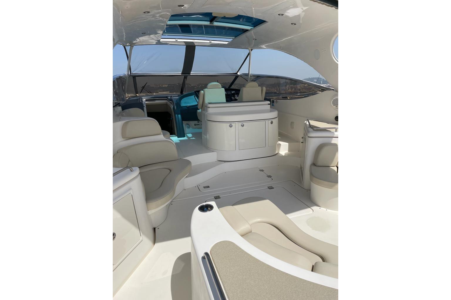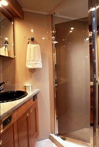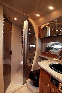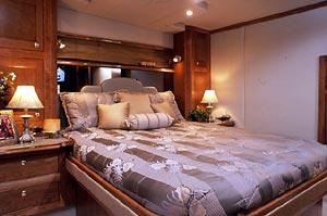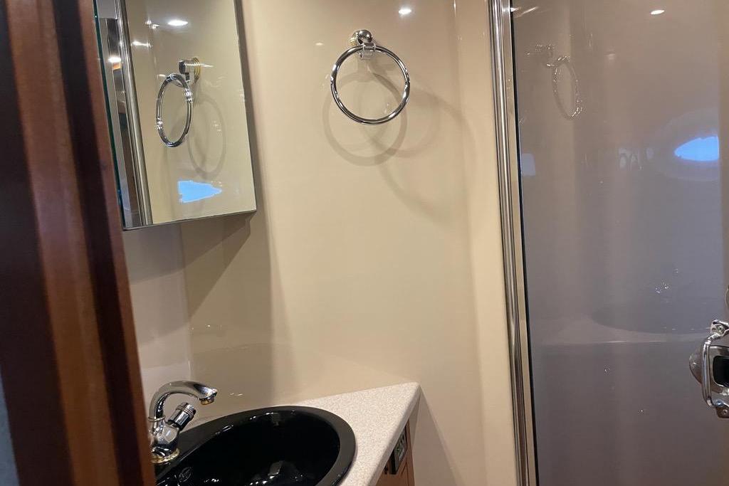 The Cruisers Yachts 5470 is an offshore thoroughbred, with the performance, handling, accommodations and storage necessary for long-term cruising. The abovedeck configuration includes: a walk-around helm area that gives the pilot and co-pilot easy helm access; generous horseshoe seating aft that can be electrically converted to a spacious sunlounge; an aft deck / platform seating area; a wet bar with refrigerator / icemaker for onboard entertaining and plenty of storage for water toys. A camper top and front and side curtains will keep owners and guests protected from inclement weather, while a bimini top will cool off hot summer afternoons on the water. The airy interior of the 5470 Express is aglow with the warmth of cherry wood and exquisite detailing. Owners have a choice of interior layouts: a three-stateroom layout, a two-stateroom layout with additional living space, and a two-stateroom layout with separate office space. The two-stateroom layout features a forward stateroom with large island berth and a deluxe amidships master stateroom, which boasts a large island berth and a walk-in, cedar-lined closet. The three-stateroom layout includes a third cabin with twin berths or, owners may opt to use the third cabin as an onboard office. The 5470 features a full-service galley, equipped with a large refrigerator / freezer with icemaker, a double sink, an electric three-burner stove, a microwave / convection oven with exhaust fan and a coffee maker. The 5470 provides a large, crescent-shaped dinette with an electric lift dinette table that stows under the floor and raises automatically for use. Forward of the galley to port, she also offers bar-style seating for informal dining. This yacht includes a stereo with six-CD changer and a TV / VCR with remote. The forward head offers secondary access from the forward stateroom. The aft head, located to starboard aft of the dinette, serves as the master head, with private access.