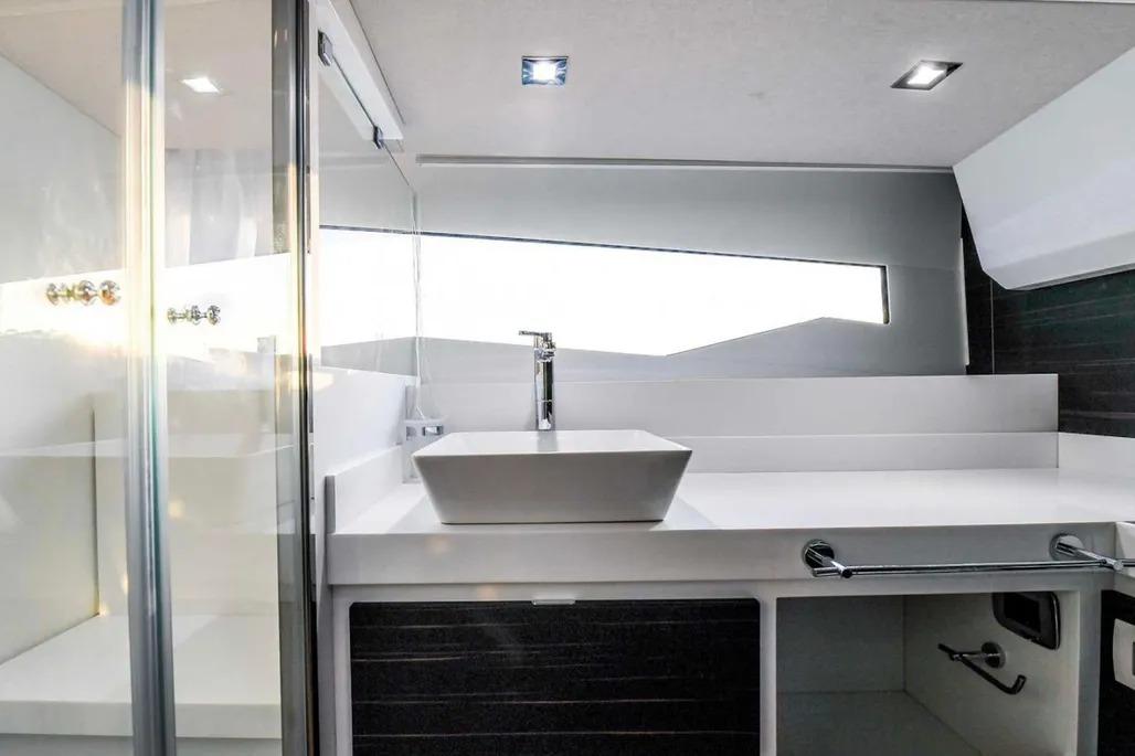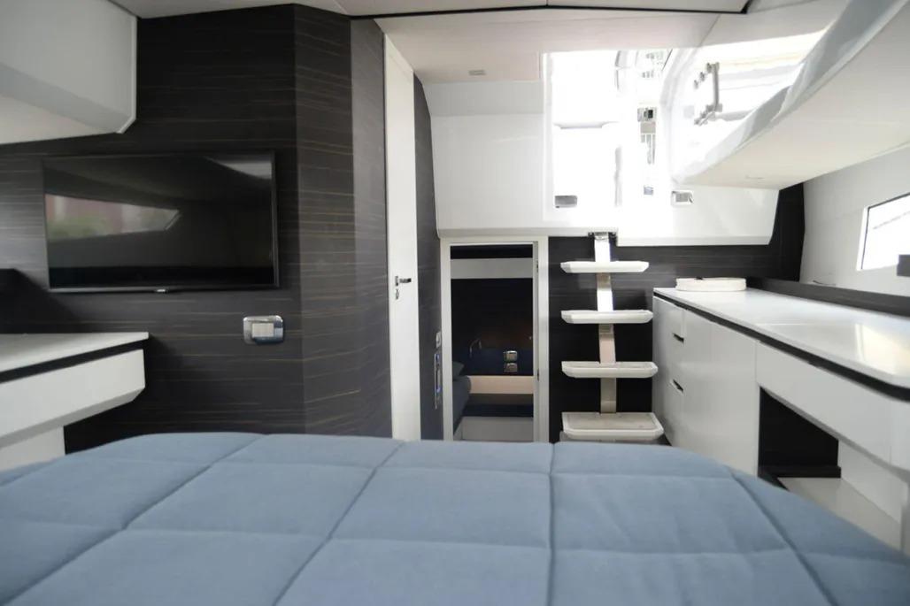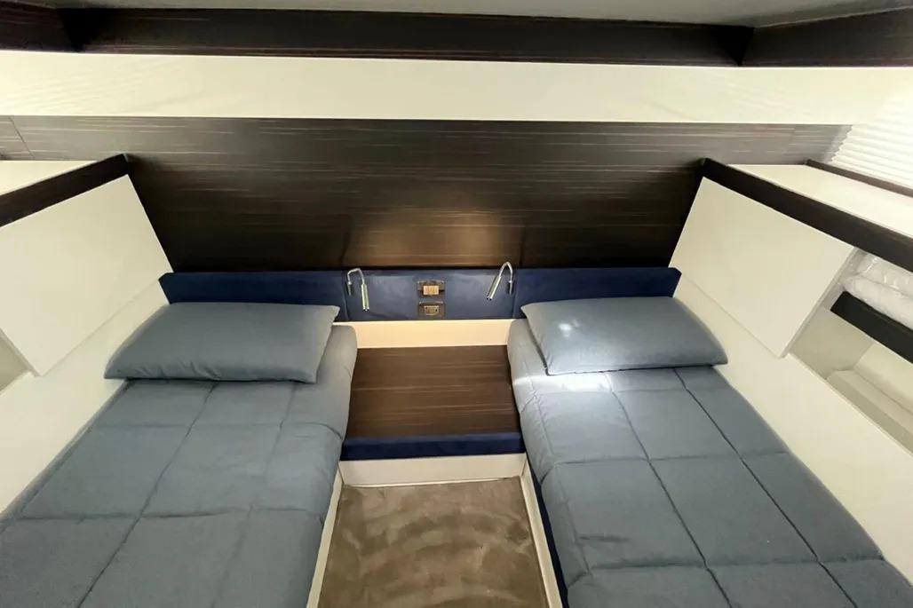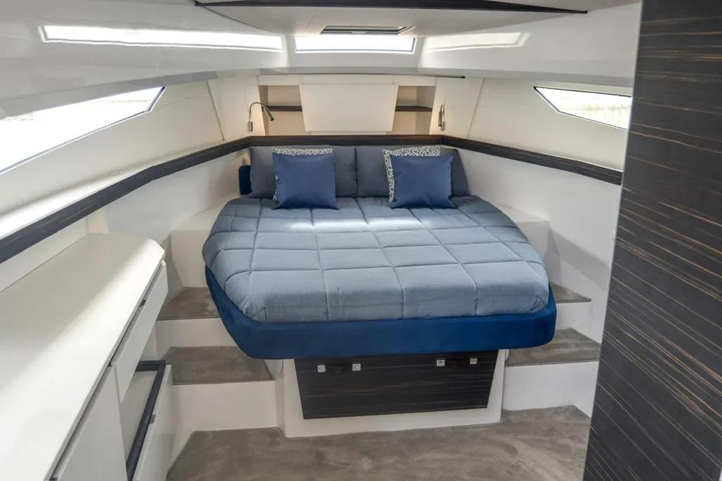 Below deck, the 39 SW offers a surprisingly spacious interior for its size, making it ideal for weekend getaways. The owner’s cabin features a double berth with refined storage solutions, while the twin cabin provides excellent headroom and natural light. A separate, fully equipped day head with enclosed shower adds comfort and practicality. With air conditioning, a Fusion entertainment system, and a Samsung Smart TV, the yacht provides both luxury and convenience.
