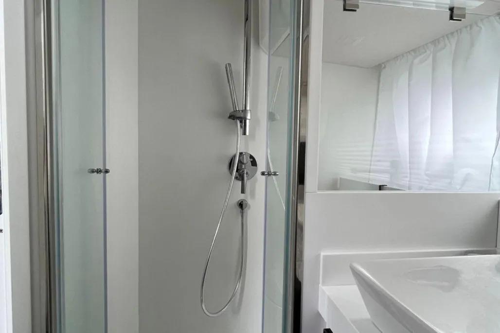 Full teak decking (cockpit, bathing platform, foredeck, and fold-down balconies)