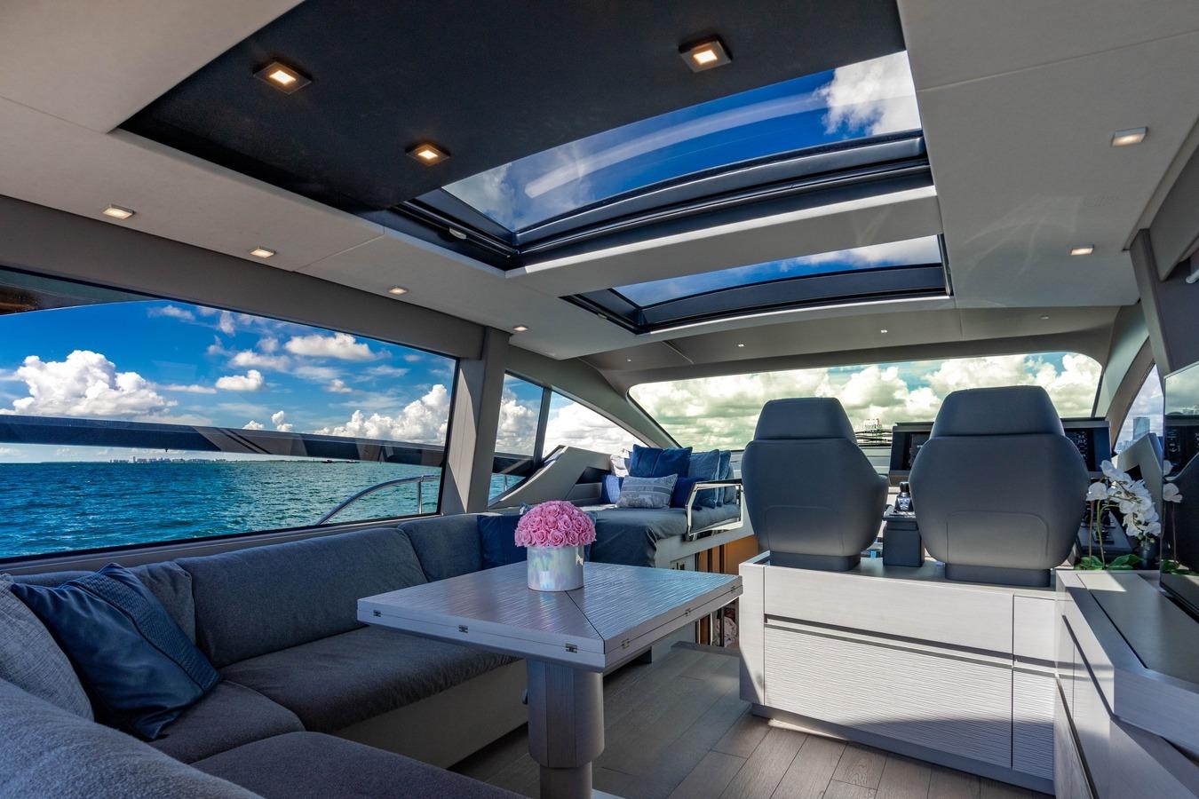 The Pershing 7X model was the winner of ‘Best Exterior Design’ within the 64 – 80ft category at the World Yacht Trophy Awards, and this yacht’s sleek, striking design by Fulvio De Simoni with metallic charcoal hull color is a real head-turner.