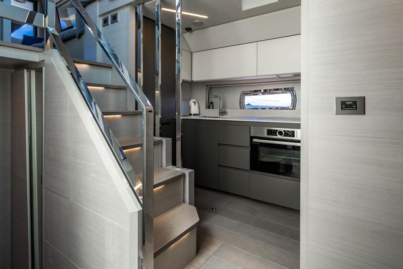 The lower deck of UNREEL houses the yacht's cabins and is accessible through the staircase from the main salon.