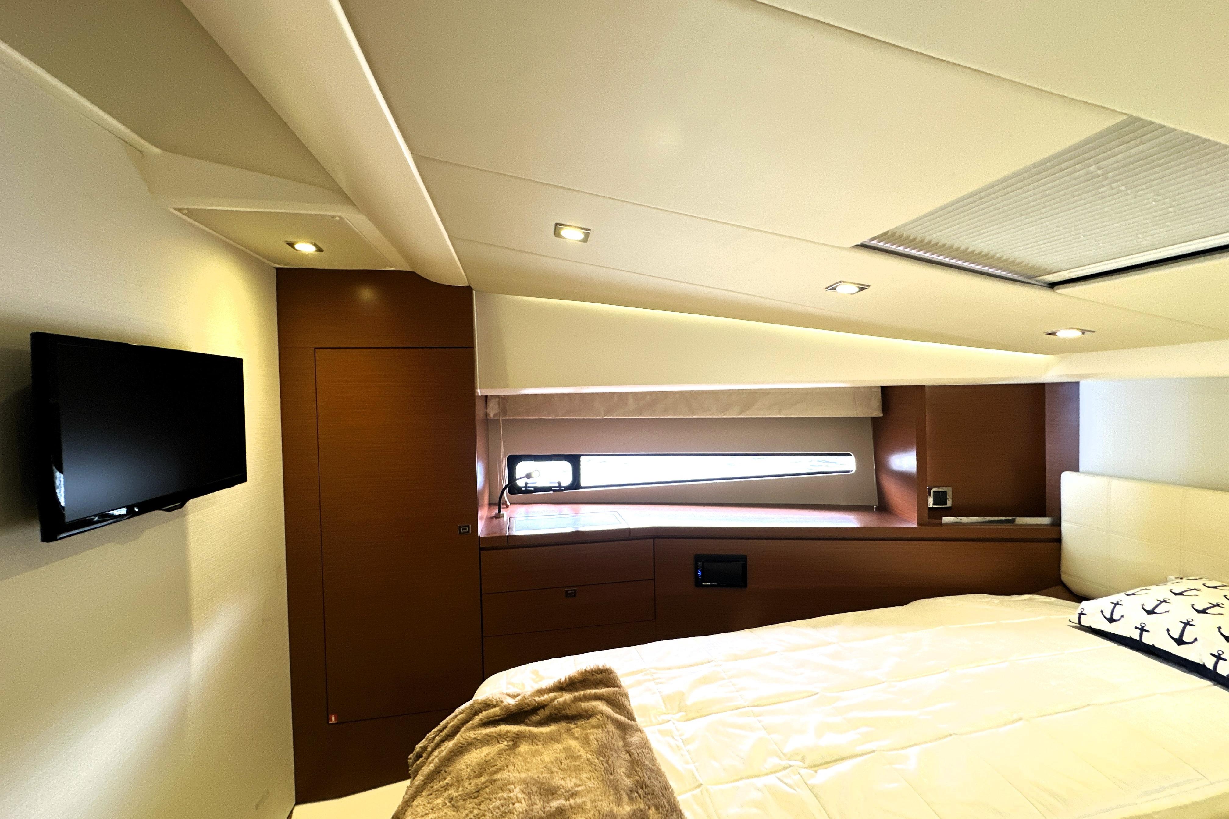 The forward VIP stateroom provides a welcoming retreat for guests, with generous headroom, smart storage solutions, and private access to the guest head. Stylish finishes and natural light create a relaxing space that feels much larger than expected on a 45-foot yacht.