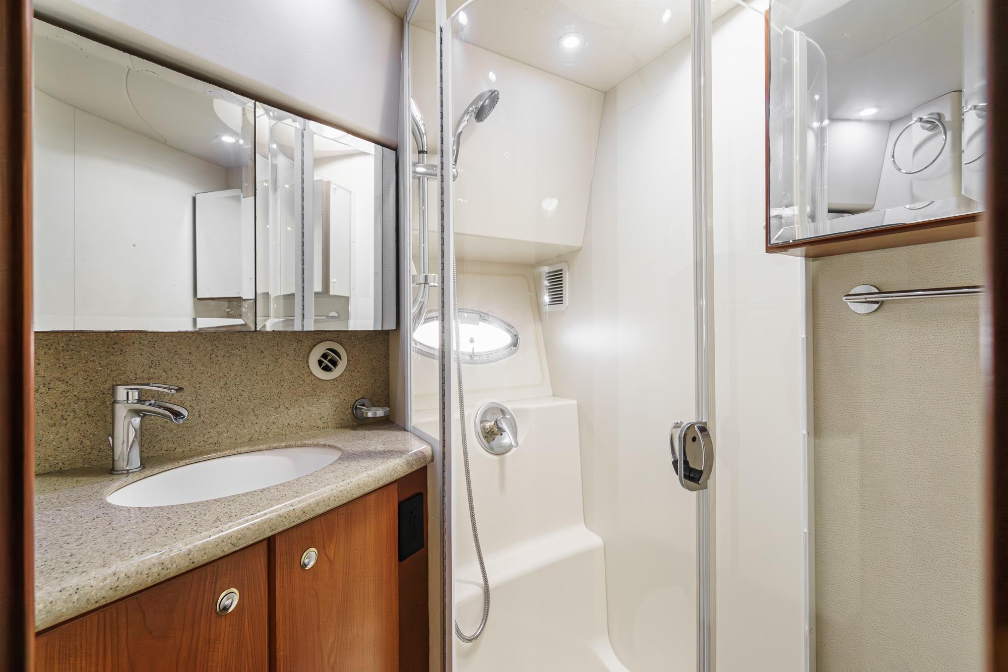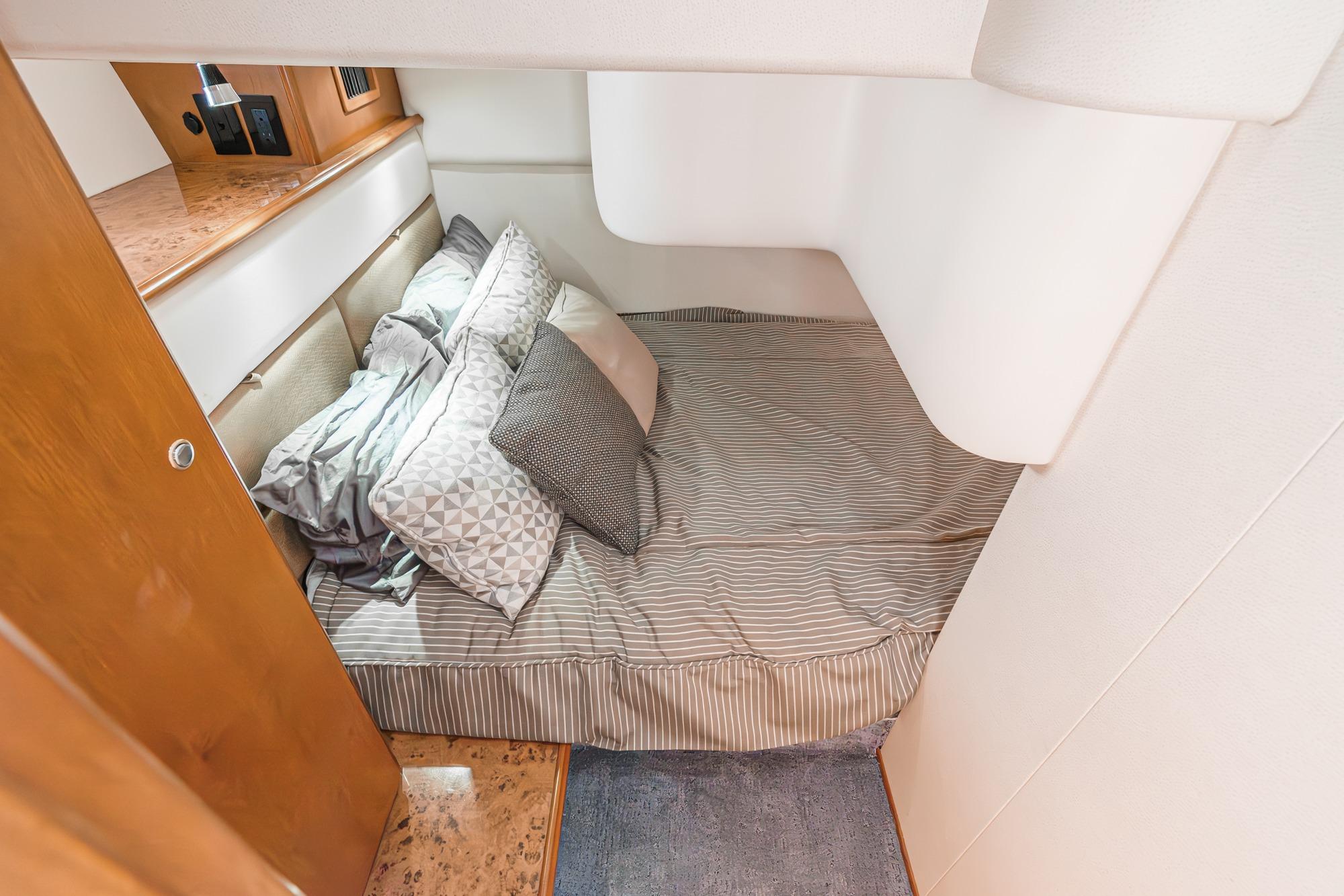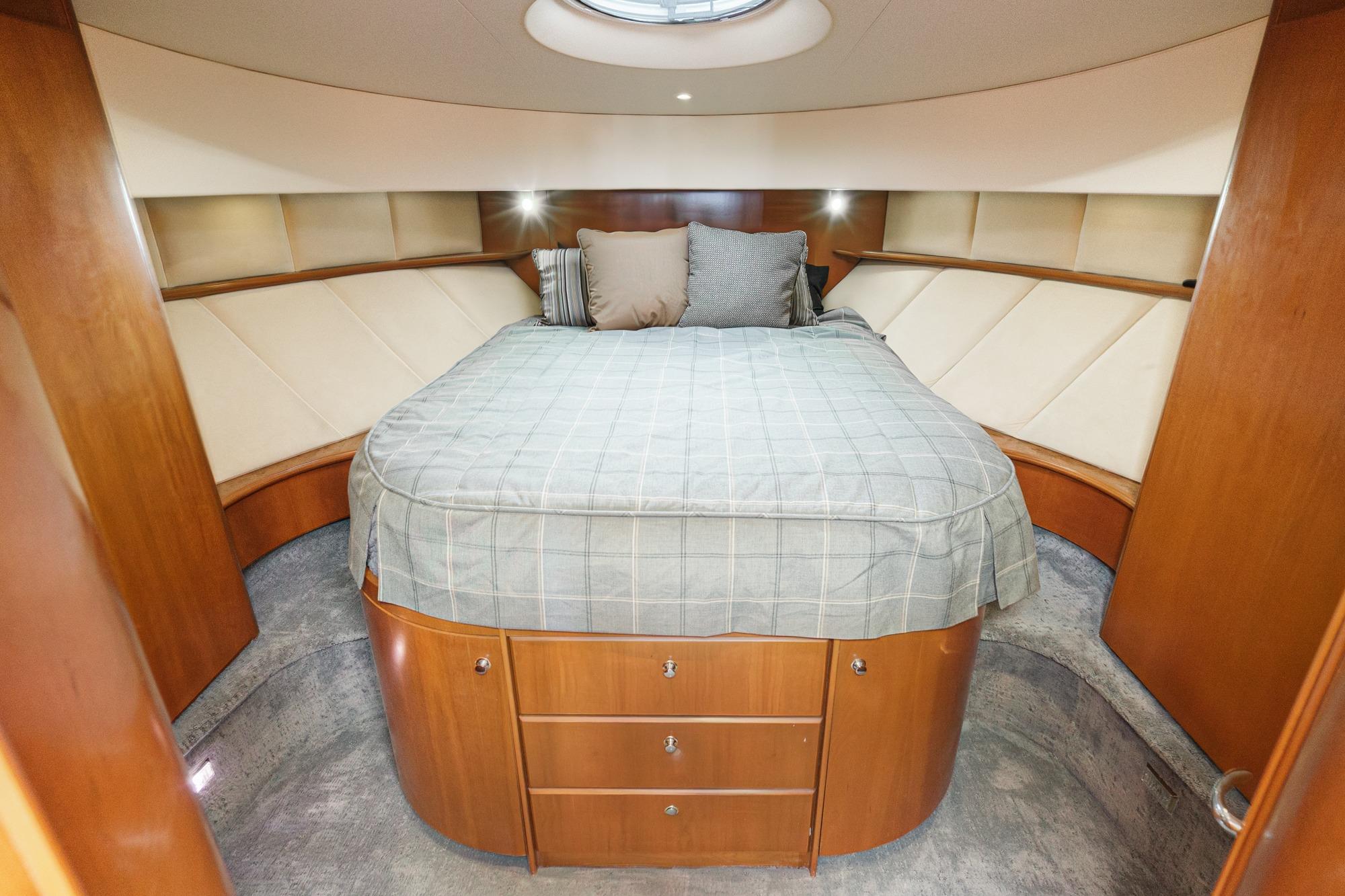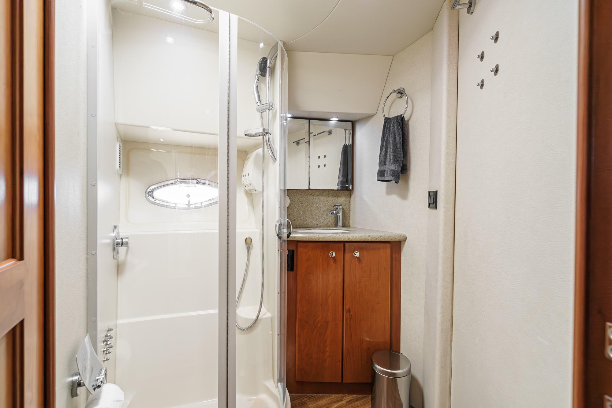 Down several steps, find three staterooms with the master queen berth in the bow, VIP queen berth and twin beds in the third cabin. The VIP and third share a head and shower and the master has an ensuite head shower.