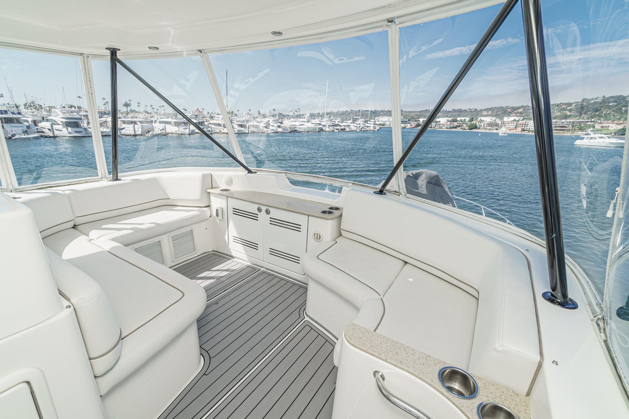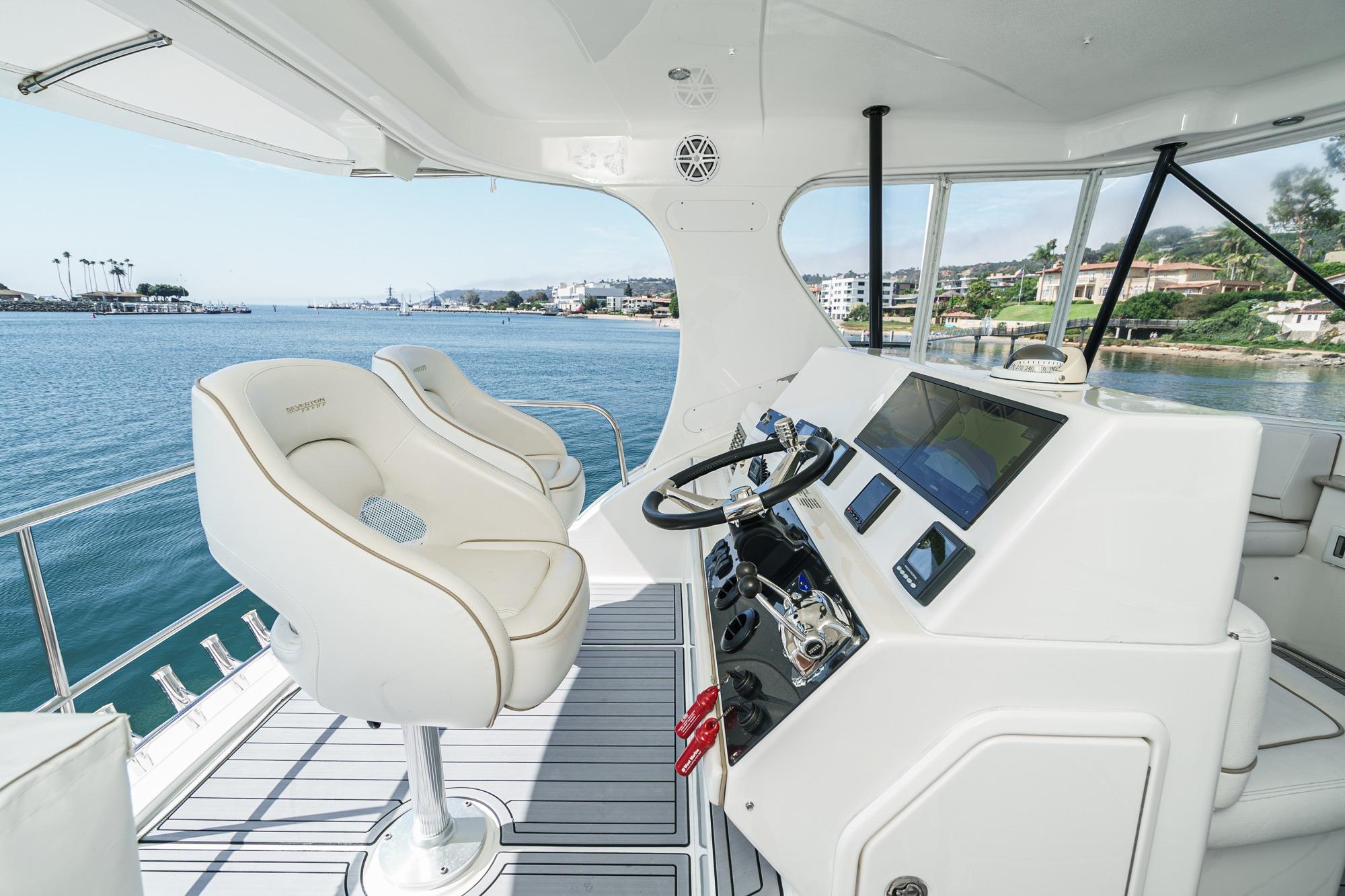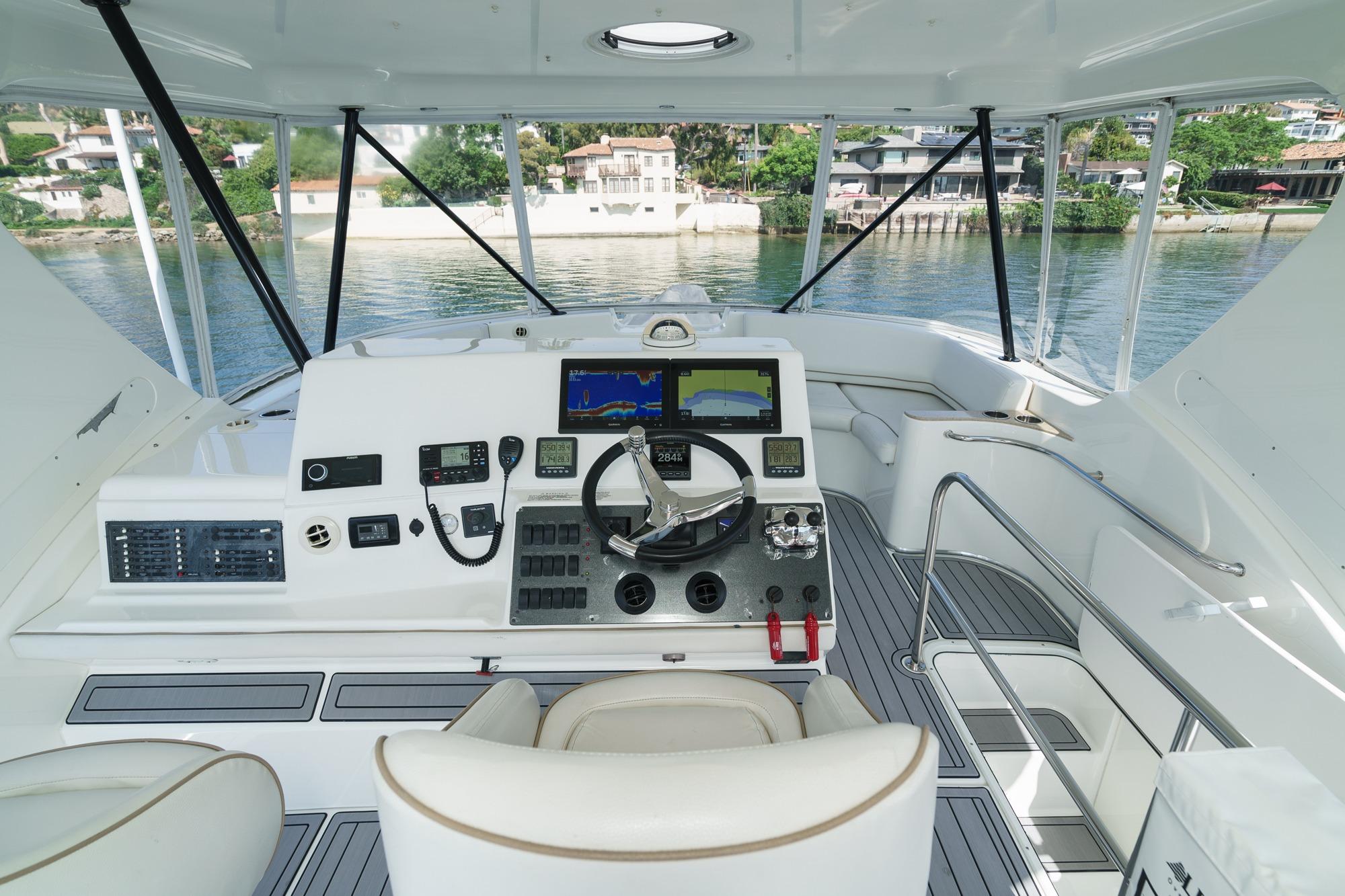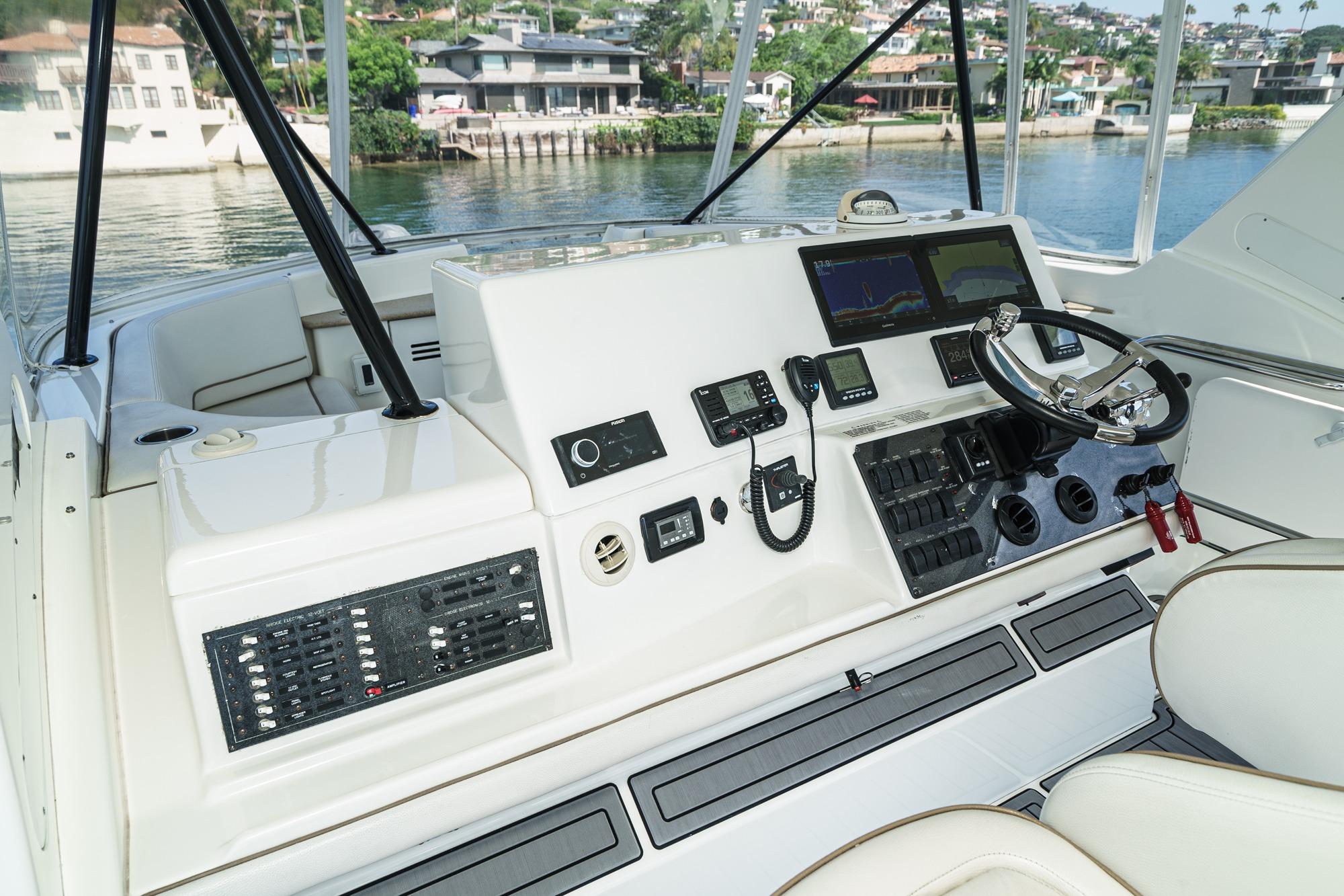 Enter the boat from the swim platform and through the transom door. The cockpit is huge and features a custom Anglers Specialties bait tank and a stair case NOT ladder to the tournament-style fly bridge. New Garmin electronics including Auto Pilot, VHF, Sonar, Fish Finder, Radar and GPS plotter are flush mounted into the bridge dash.