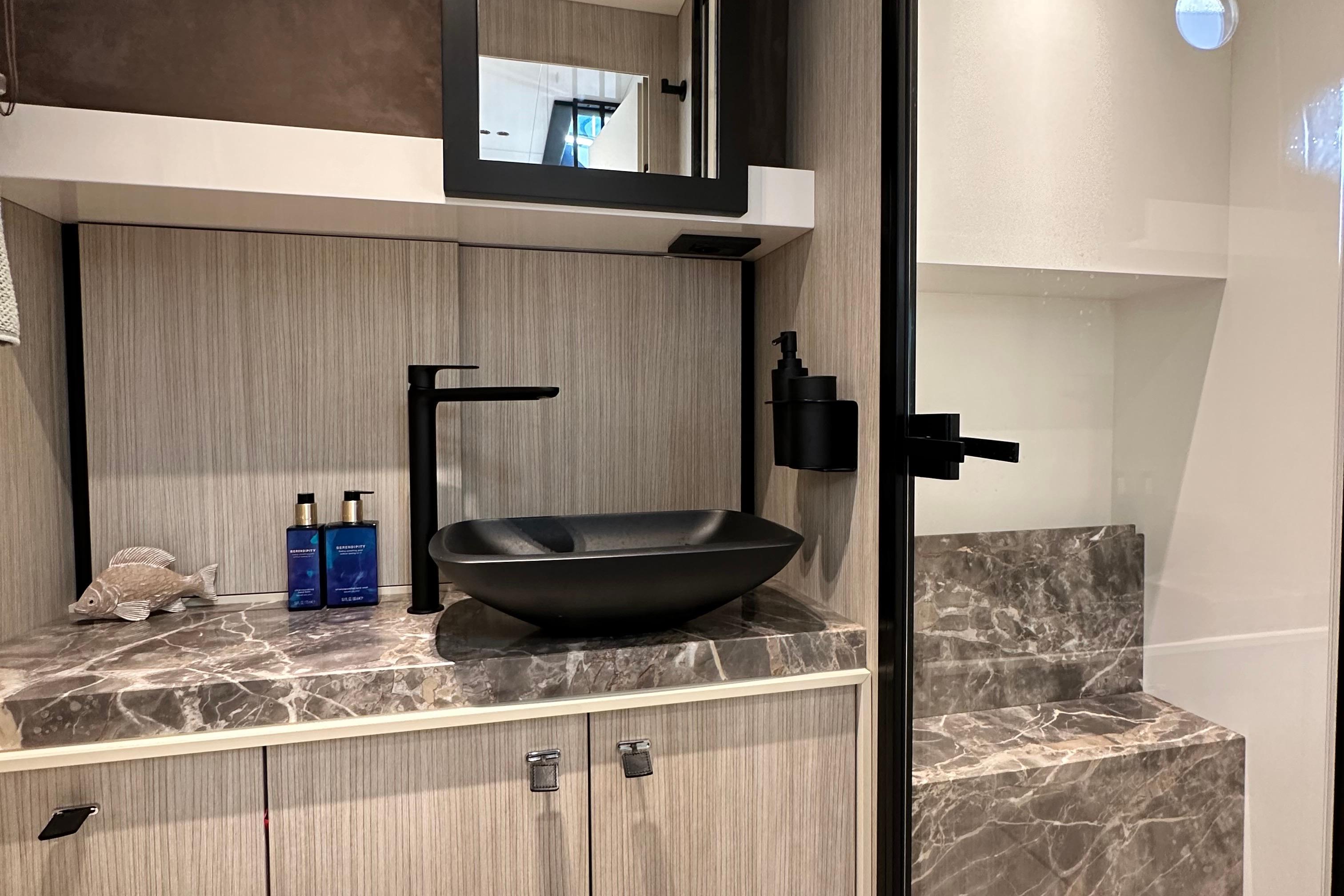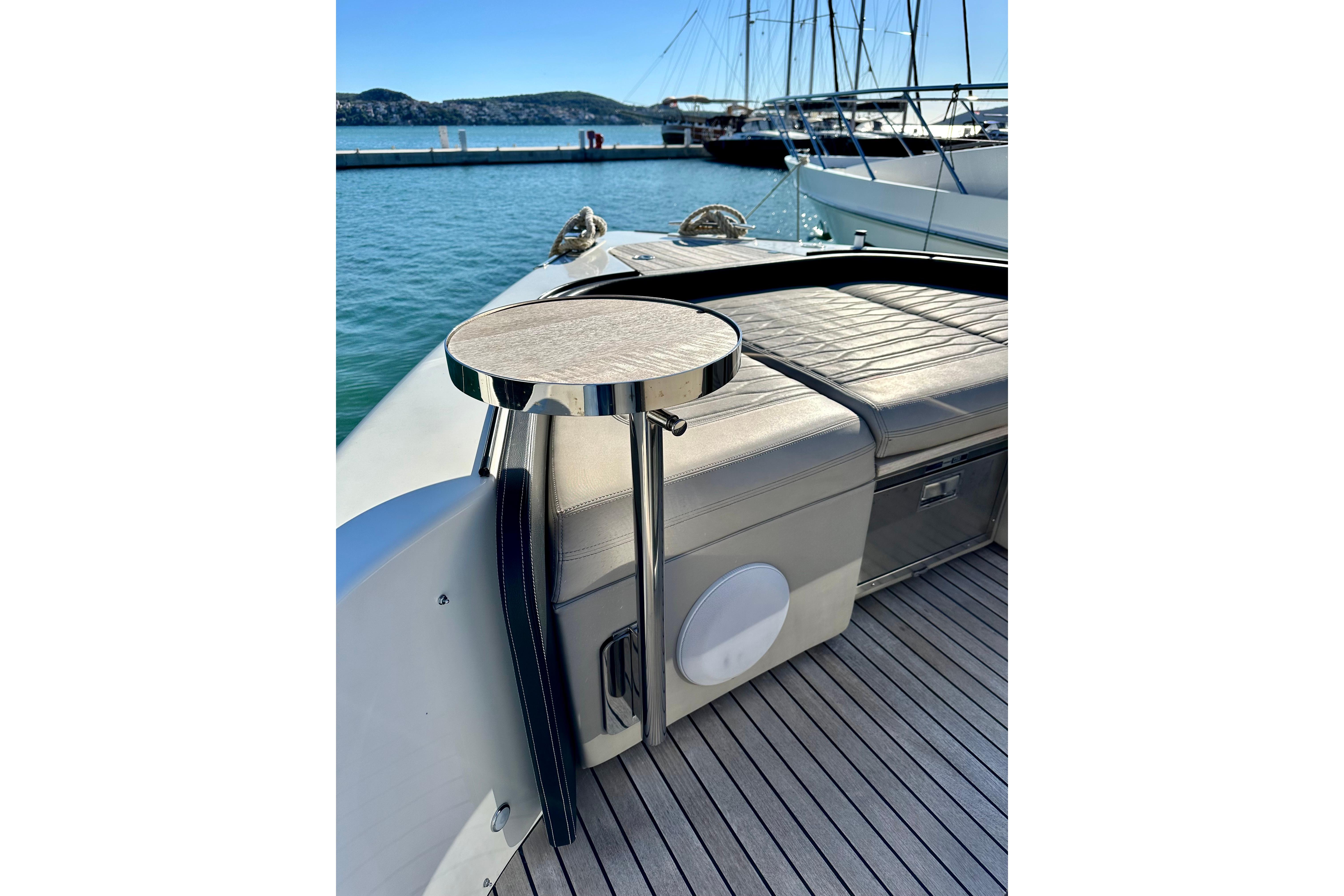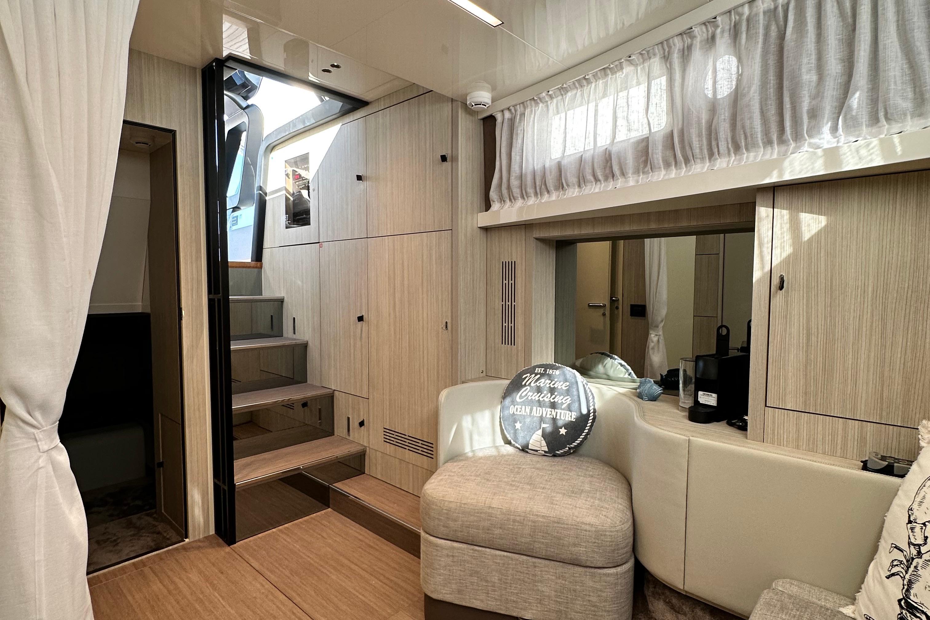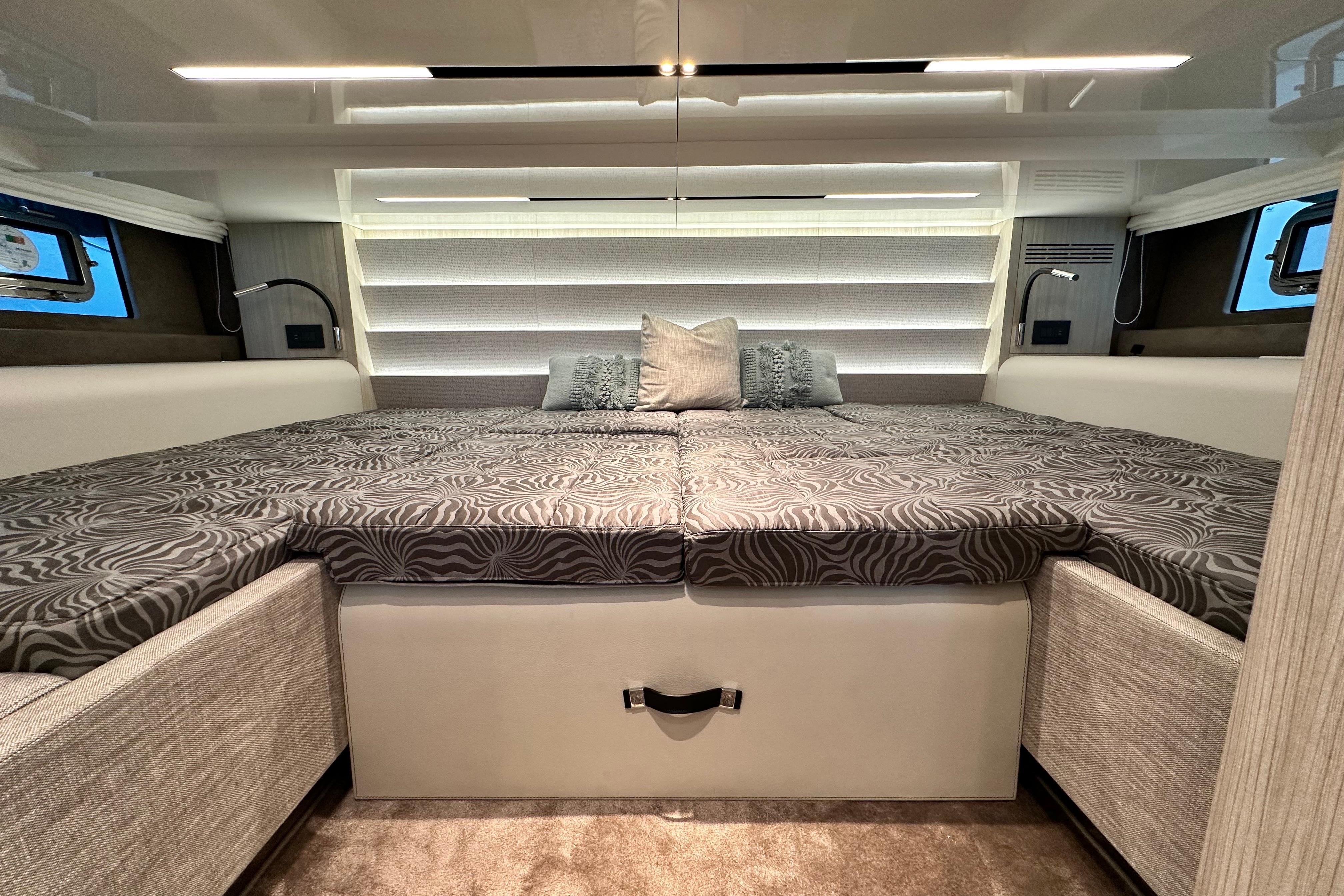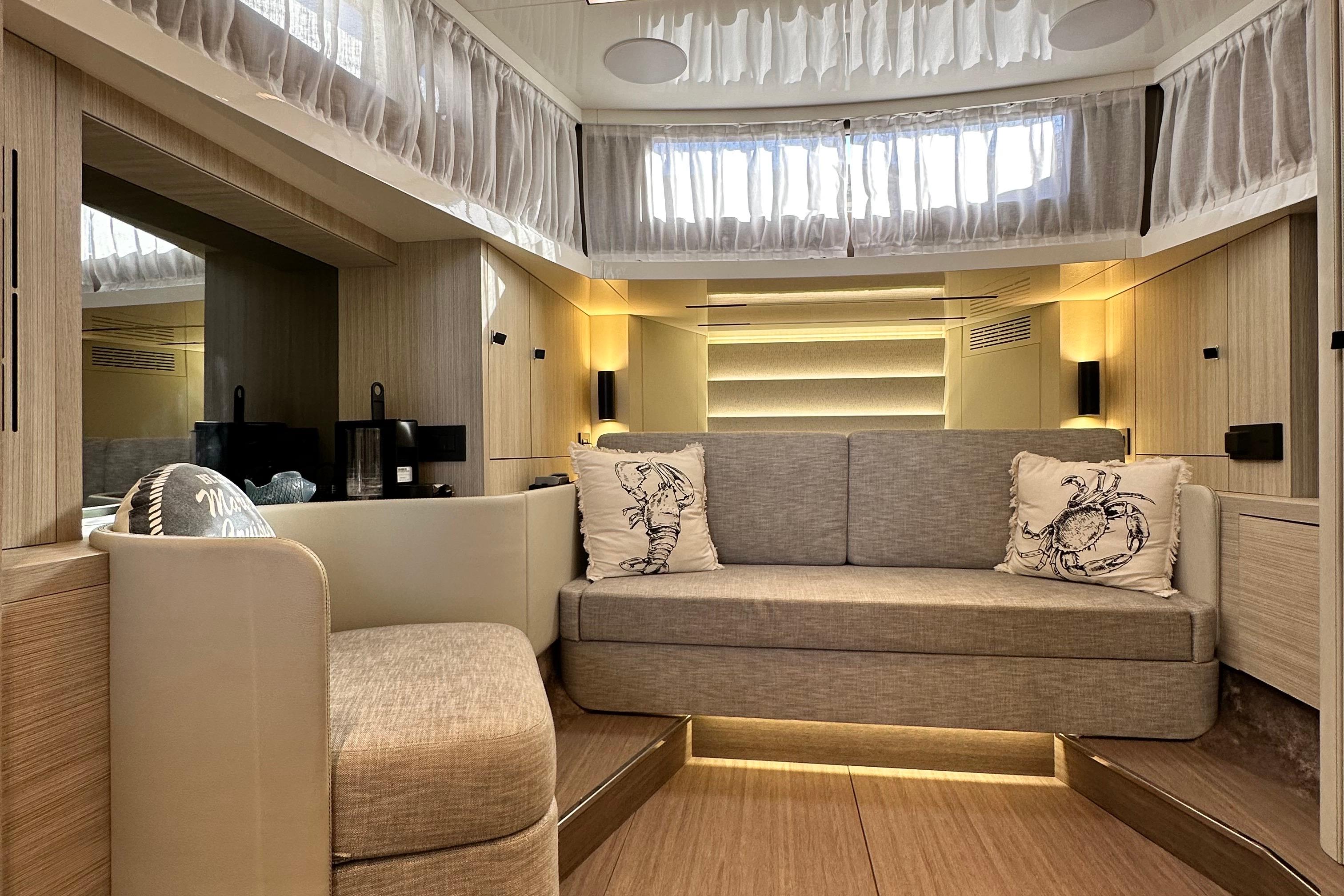Below deck, the interior has been finished with the highest attention to detail. Two guest cabins and a fully equipped bathroom provide comfortable overnight accommodation, complemented by a galley and a convertible lounge. Premium materials and thoughtful lighting create a refined, modern atmosphere.
