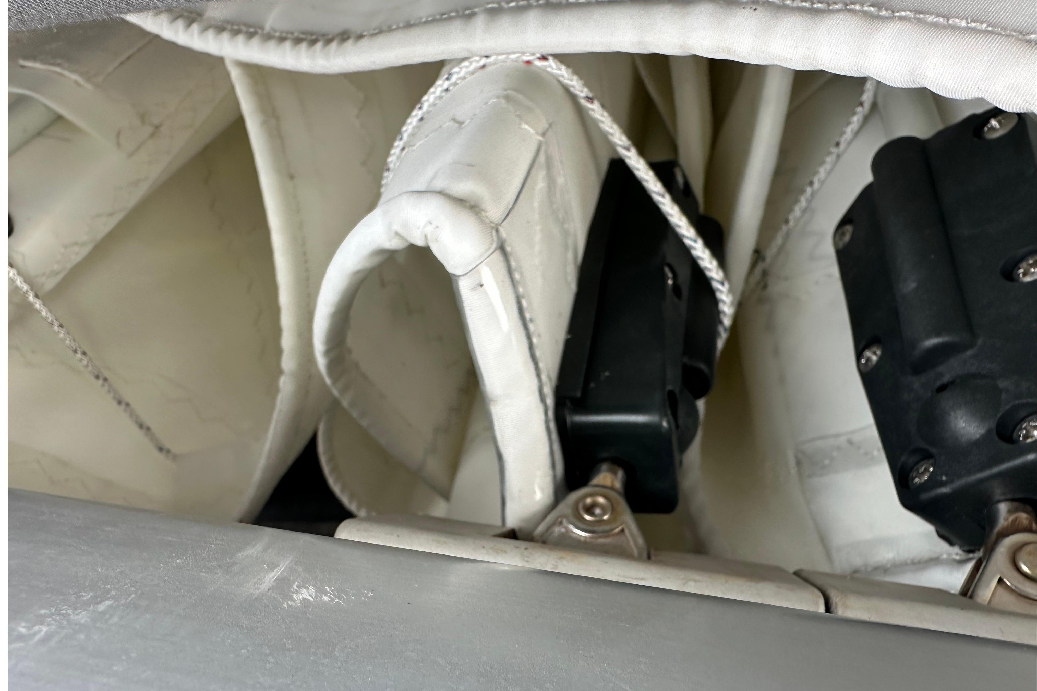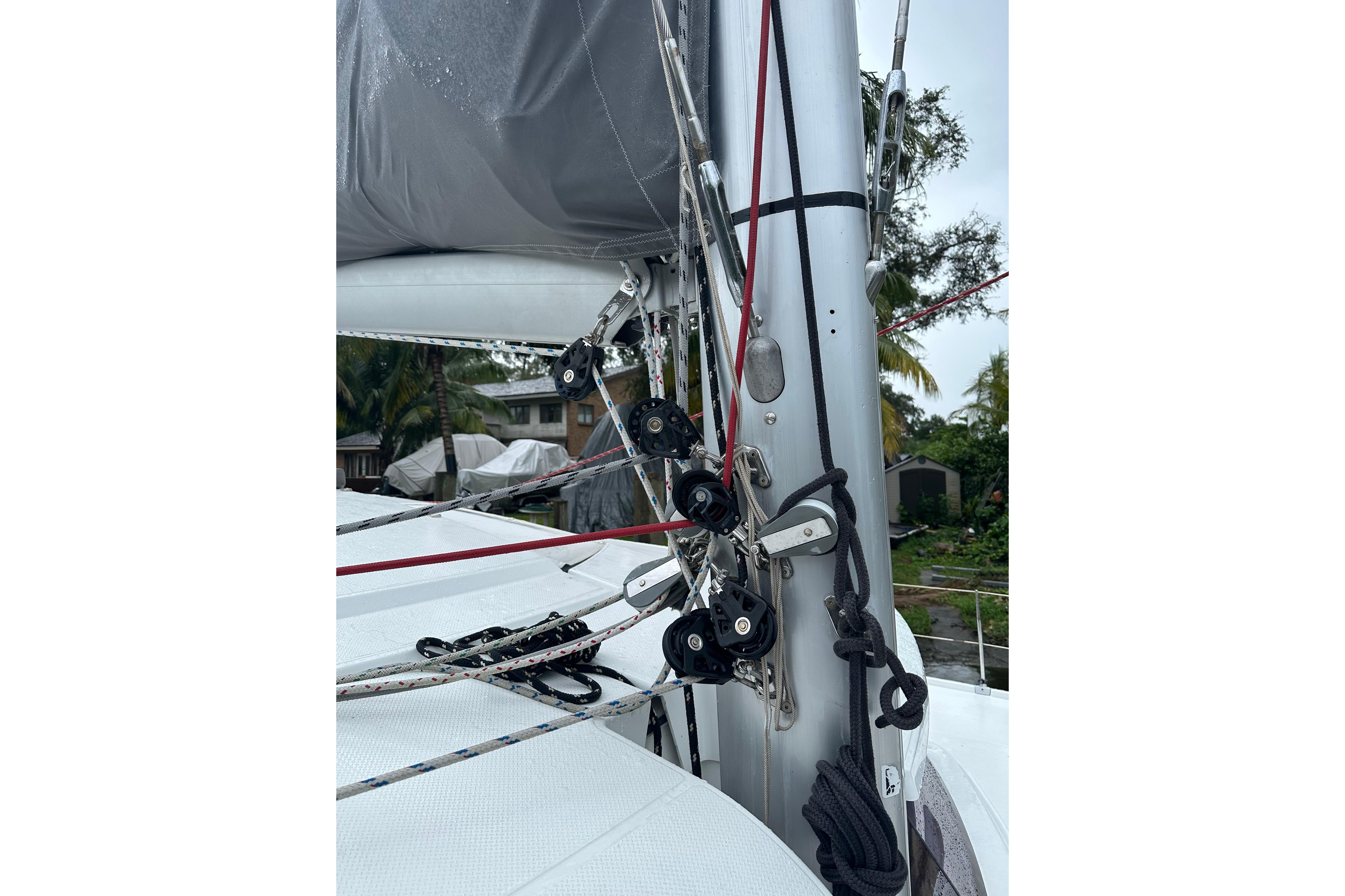 This Helia is an absolute pleasure to sail, with all lines leading back to the helm (ideal for singlehanding), which in this case has a custom hardtop and full enclosure, allowing for comfortable sailing in all weather conditions. The 3ft 8in draft is ideal for easy navigating and anchoring closer to the beach than many other catamarans of a similar size.