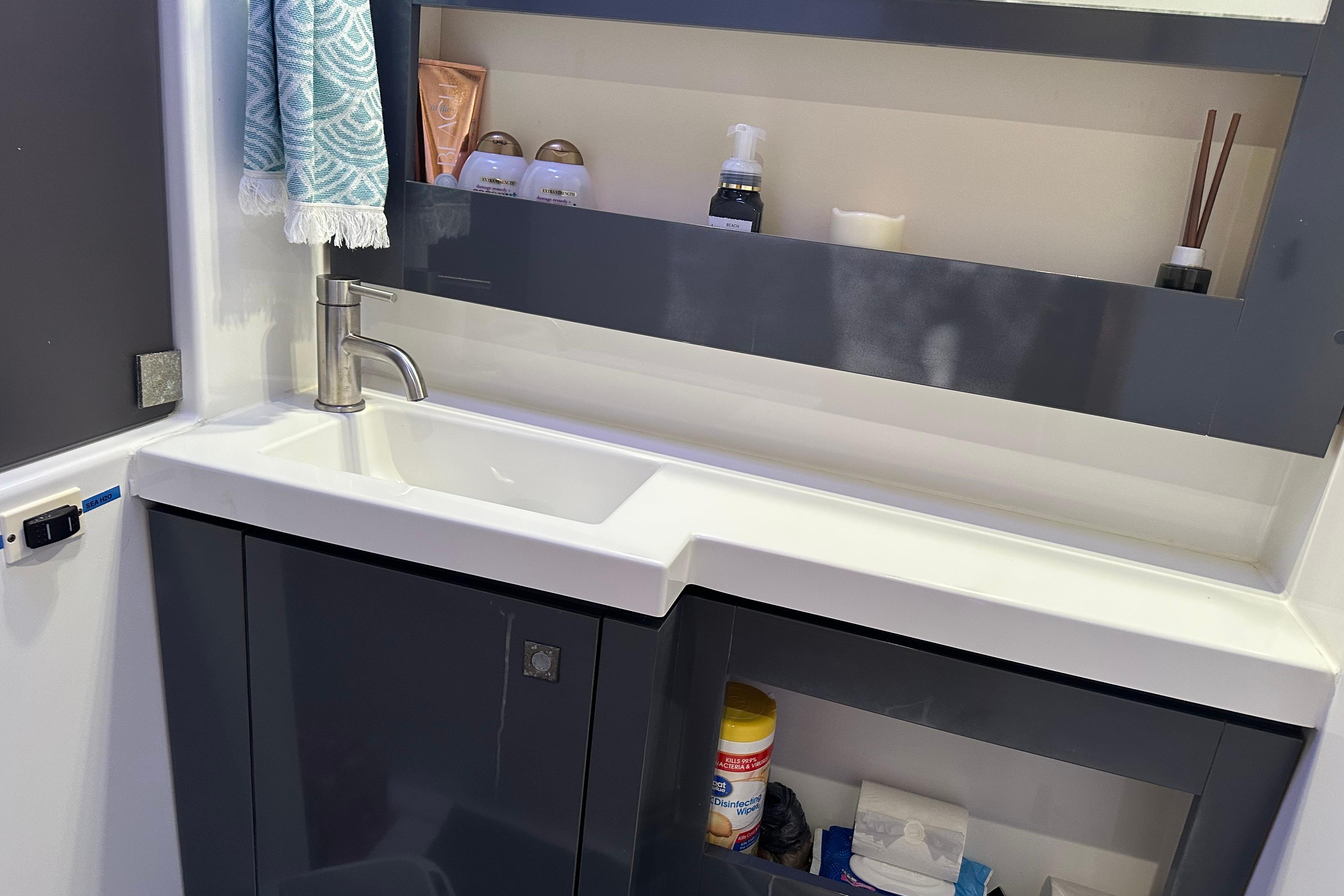 - A fully equipped galley with both electric and gas appliances, dual-drawer refrigerator, standalone freezer, cockpit fridge, ample counter space, and generous storage
