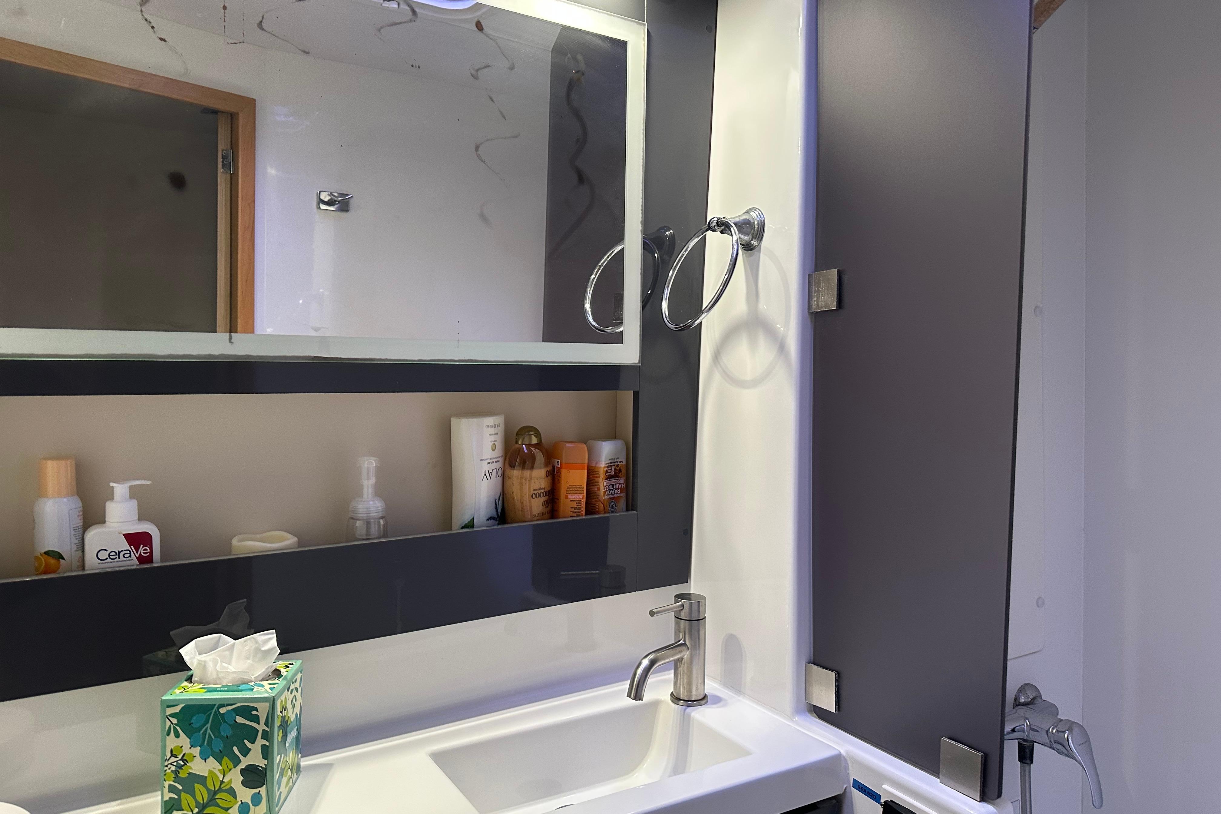- Mirror doors open to large vanity behind (unique to this model of Helia)